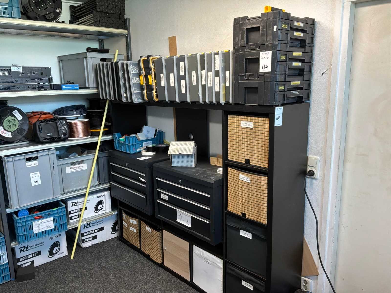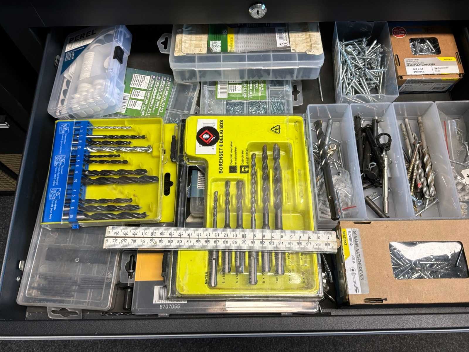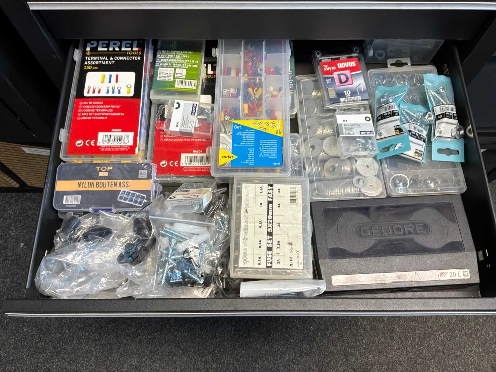 Bestaande uit: 22 koffers met kleinmateriaal. 2X gereedschapskoffer van 1 zitten de lades vast, inhoud van de kast inclusief de kast.