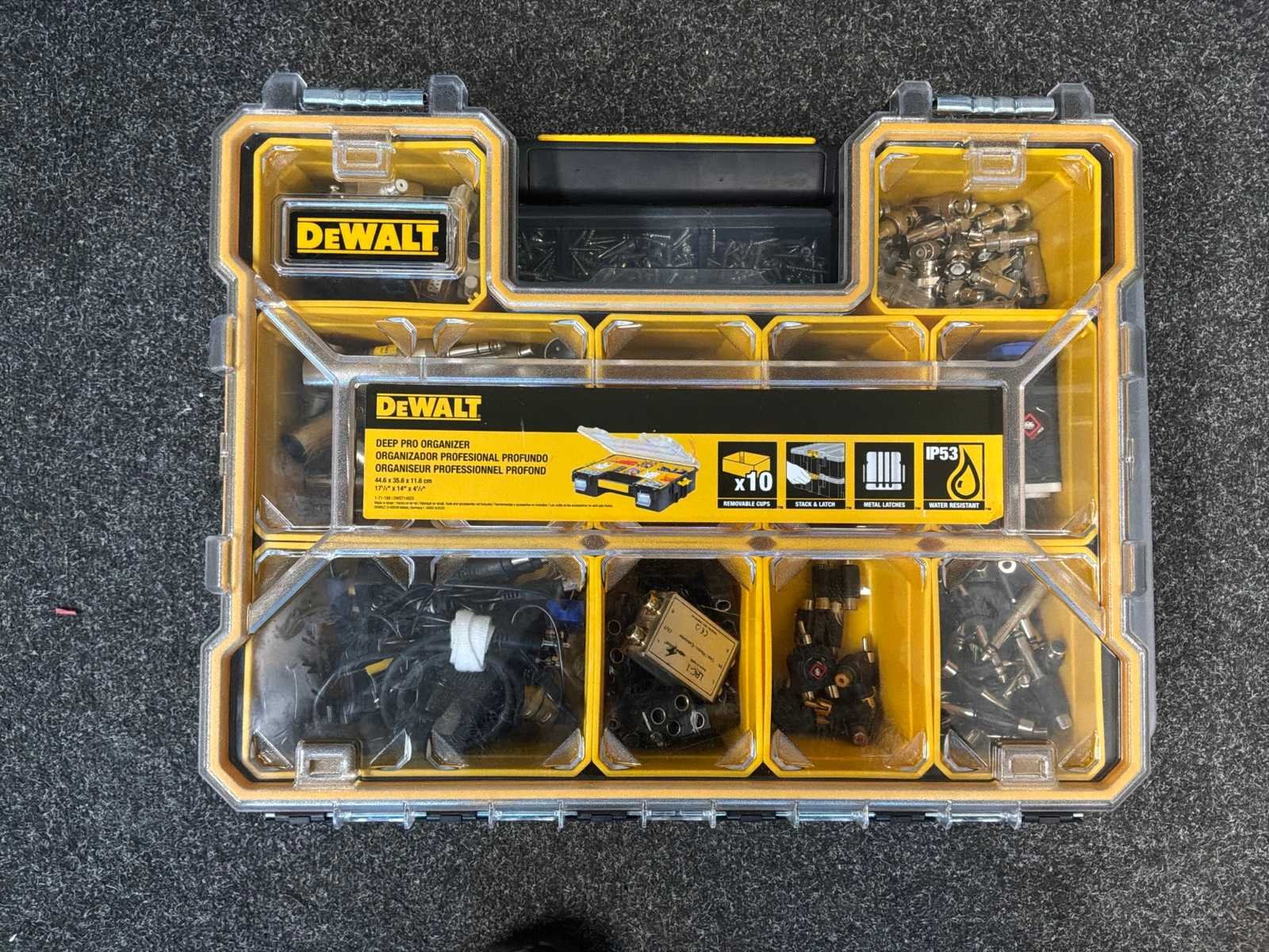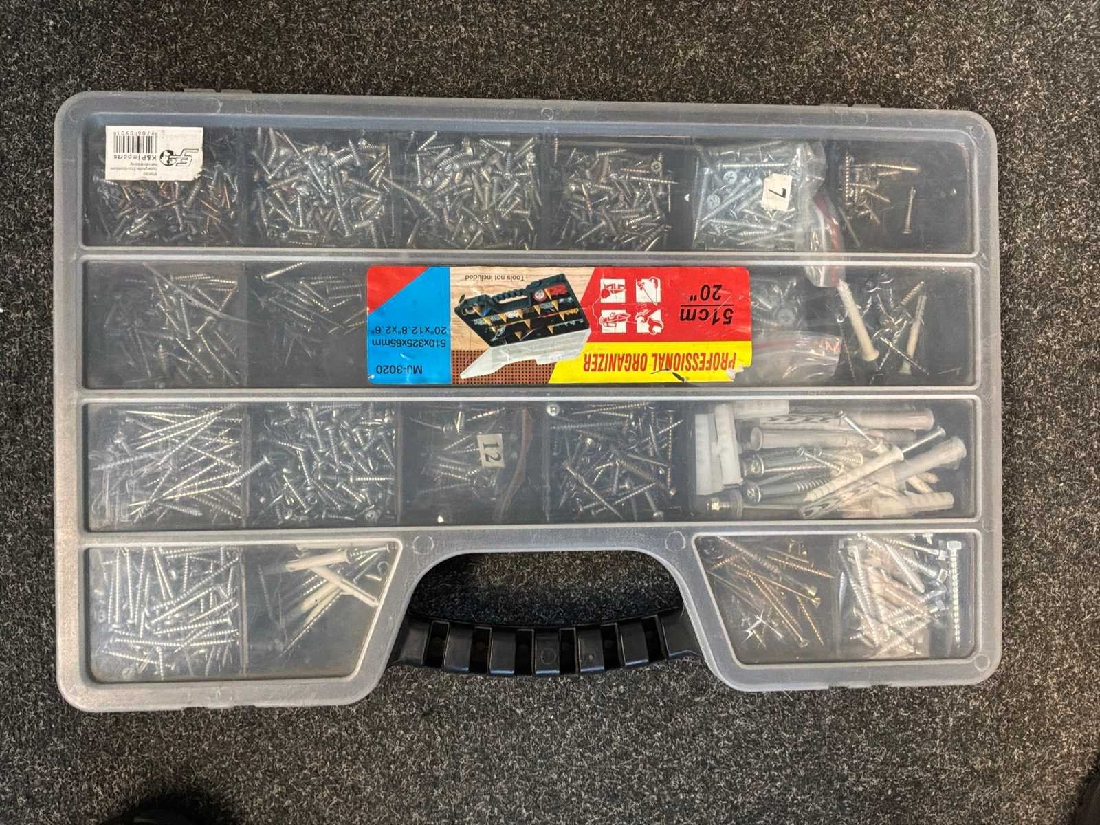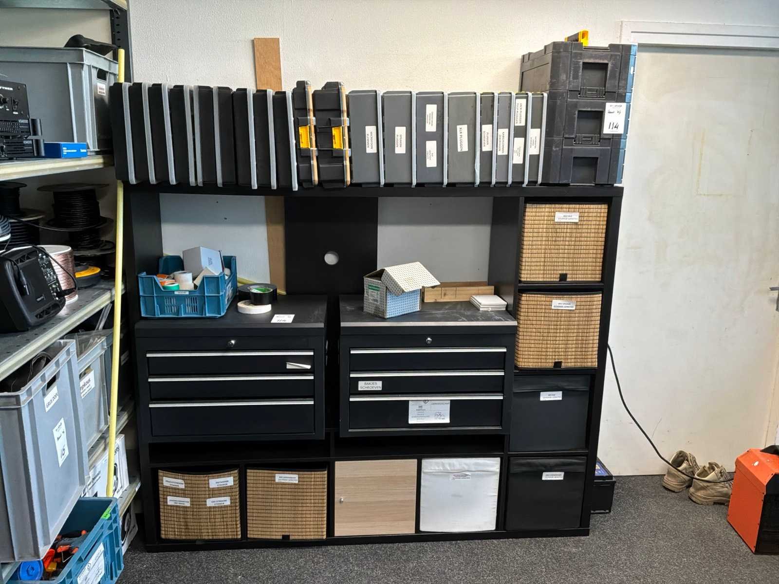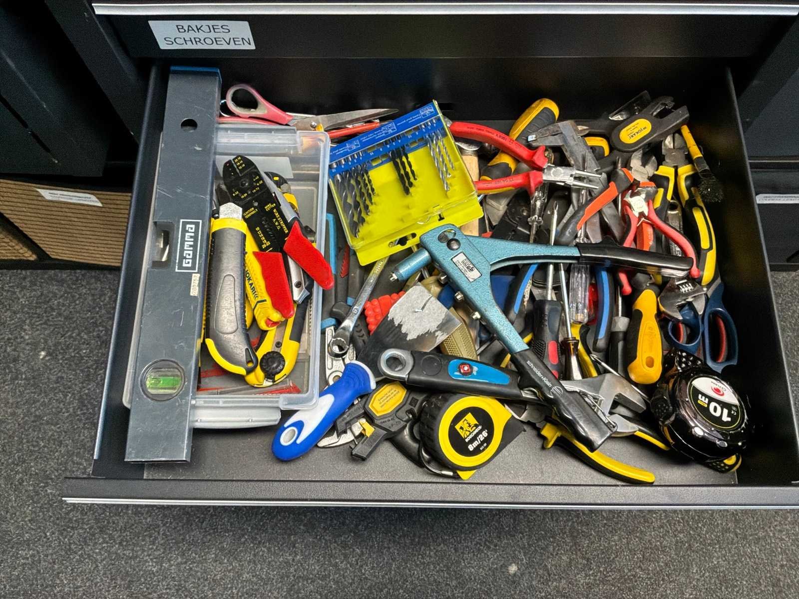 Bestaande uit: 22 koffers met kleinmateriaal. 2X gereedschapskoffer van 1 zitten de lades vast, inhoud van de kast inclusief de kast.