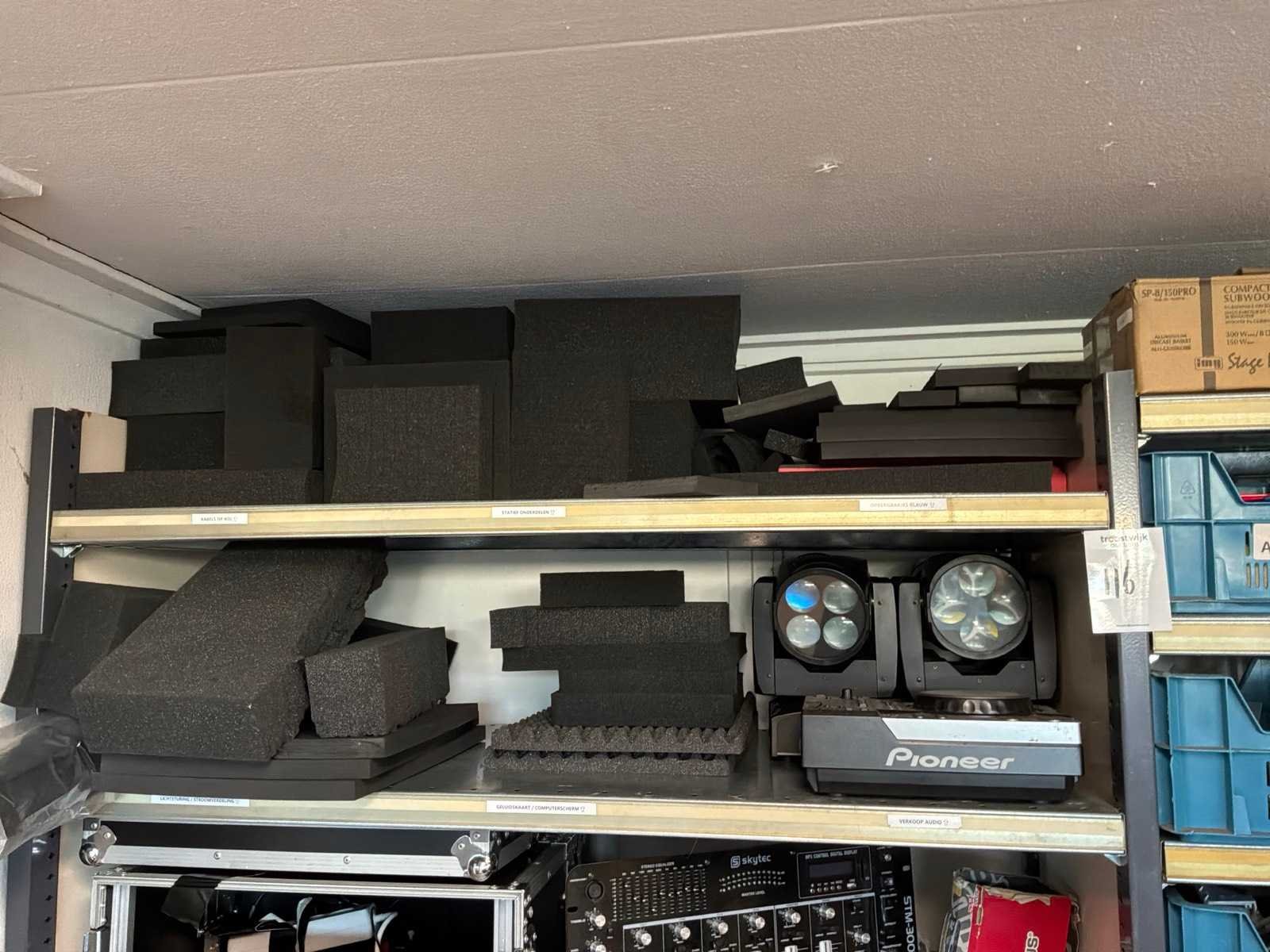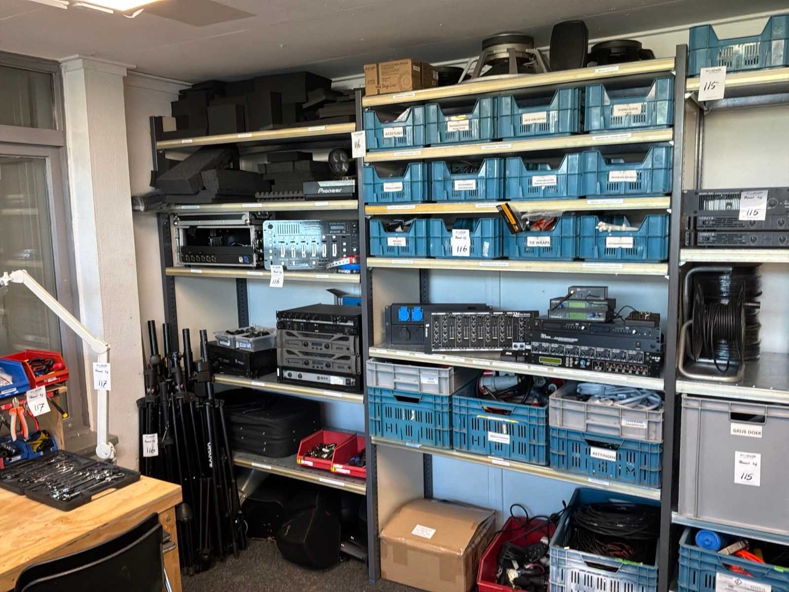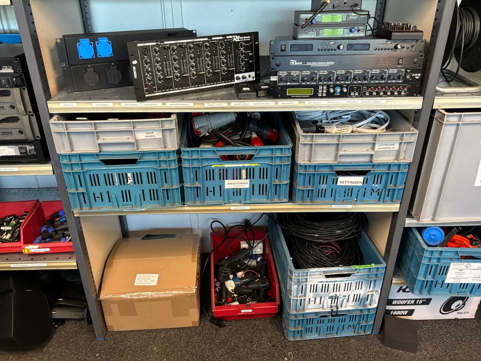 Waaronder: statieven, luidsprekers, kabels, audioapparatuur, schuim, flightcase, versterkers, movingheads.