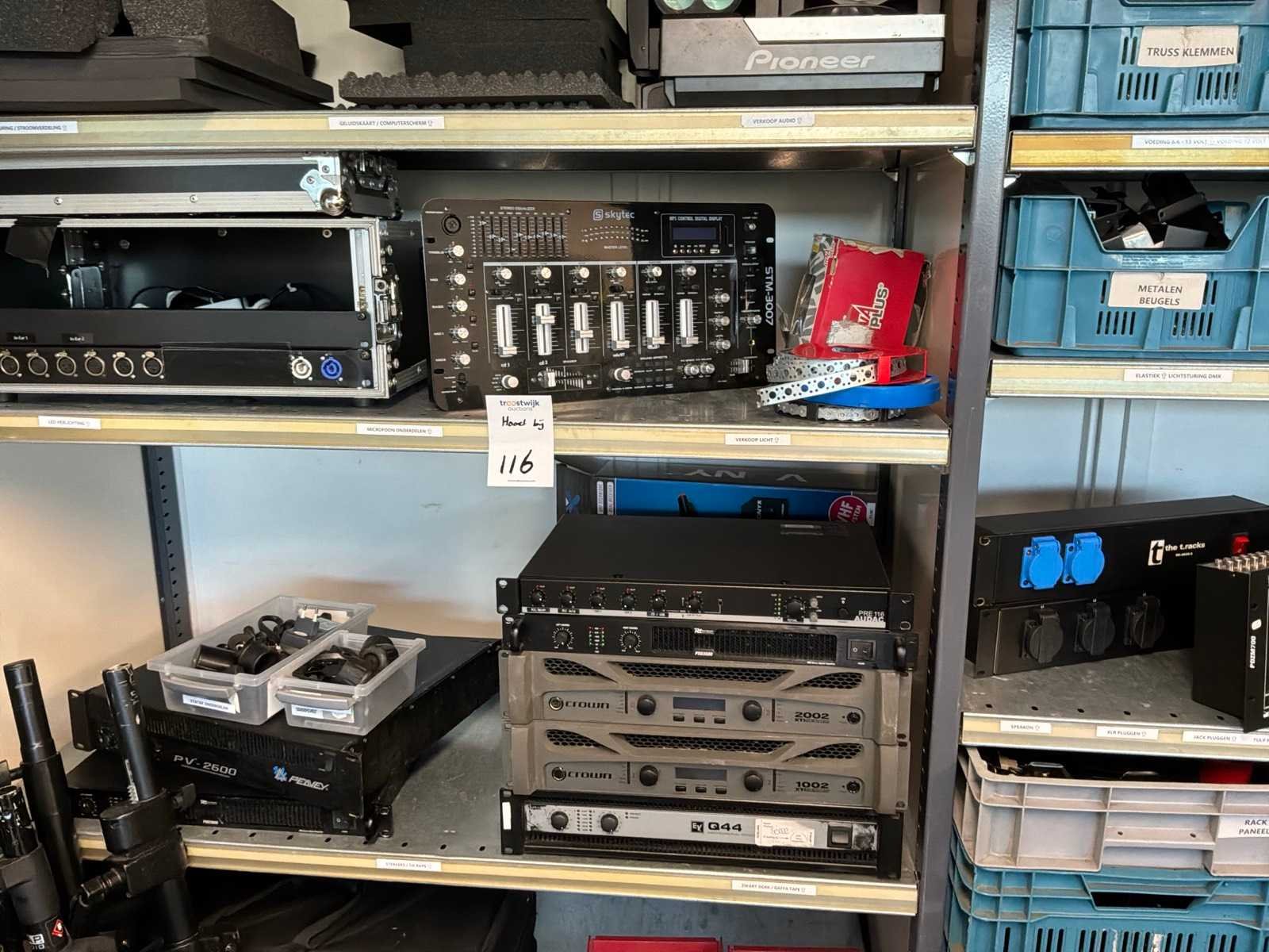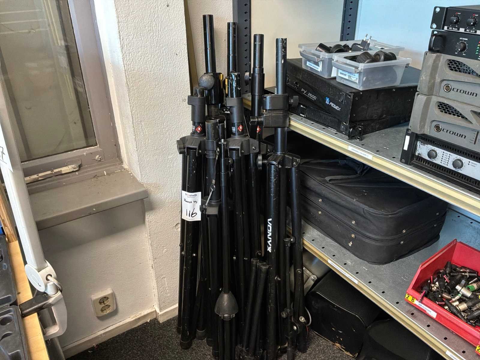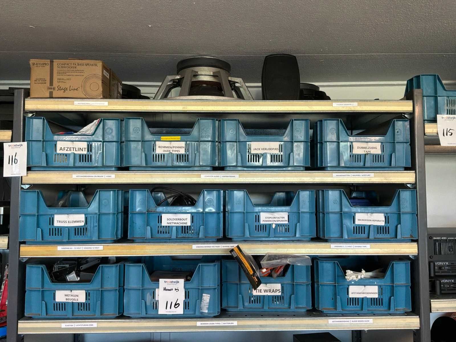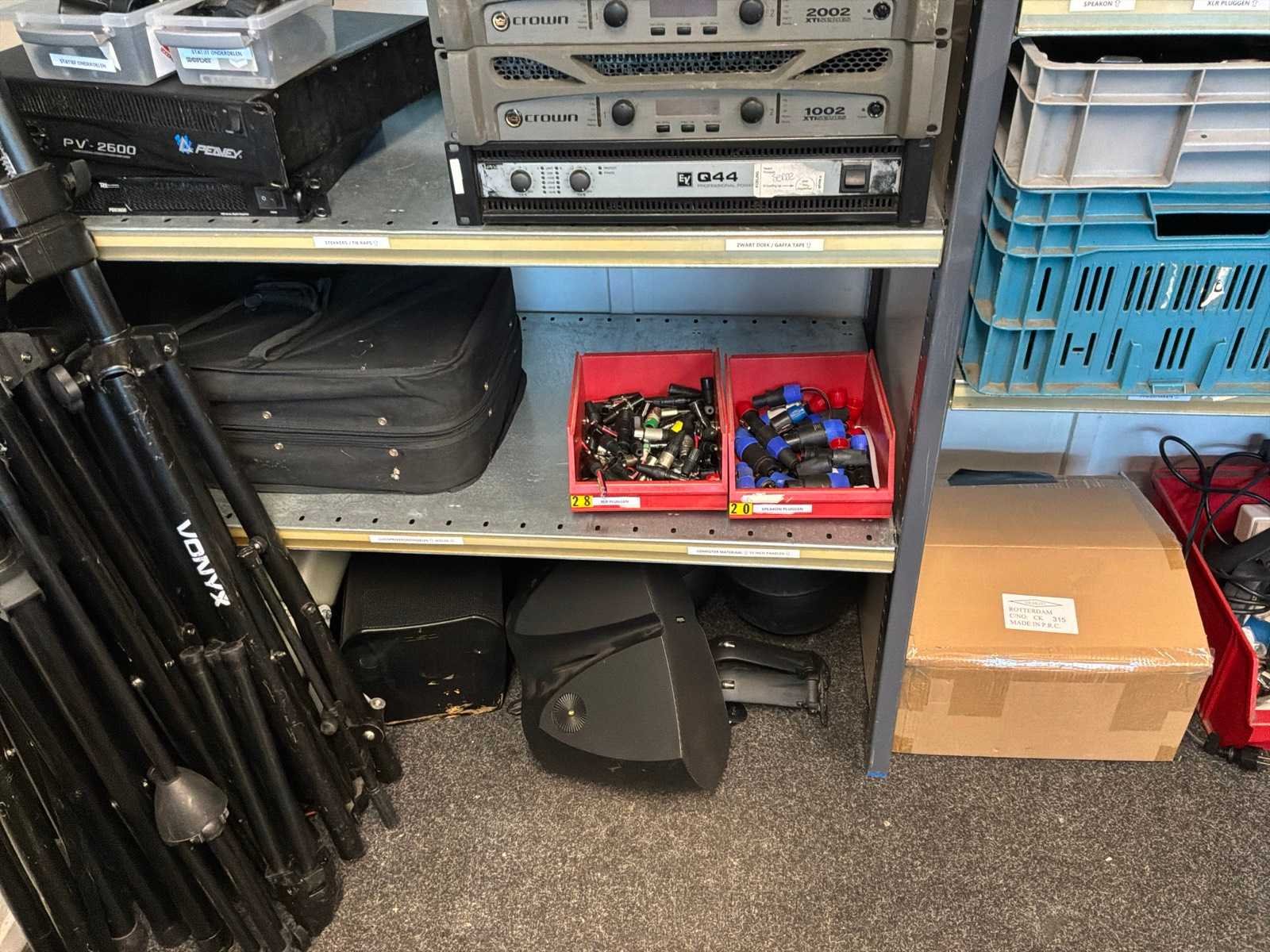 Waaronder: statieven, luidsprekers, kabels, audioapparatuur, schuim, flightcase, versterkers, movingheads.