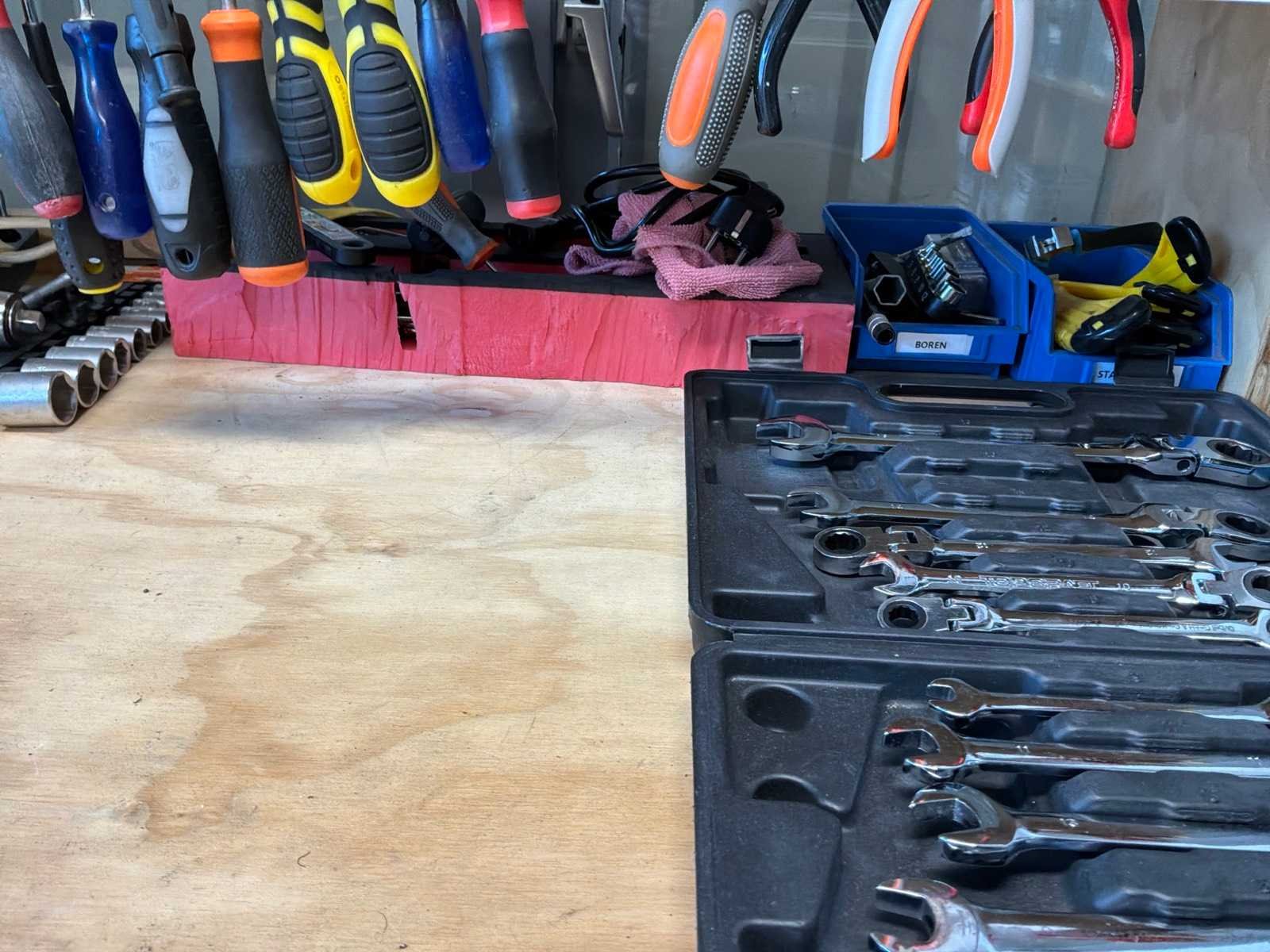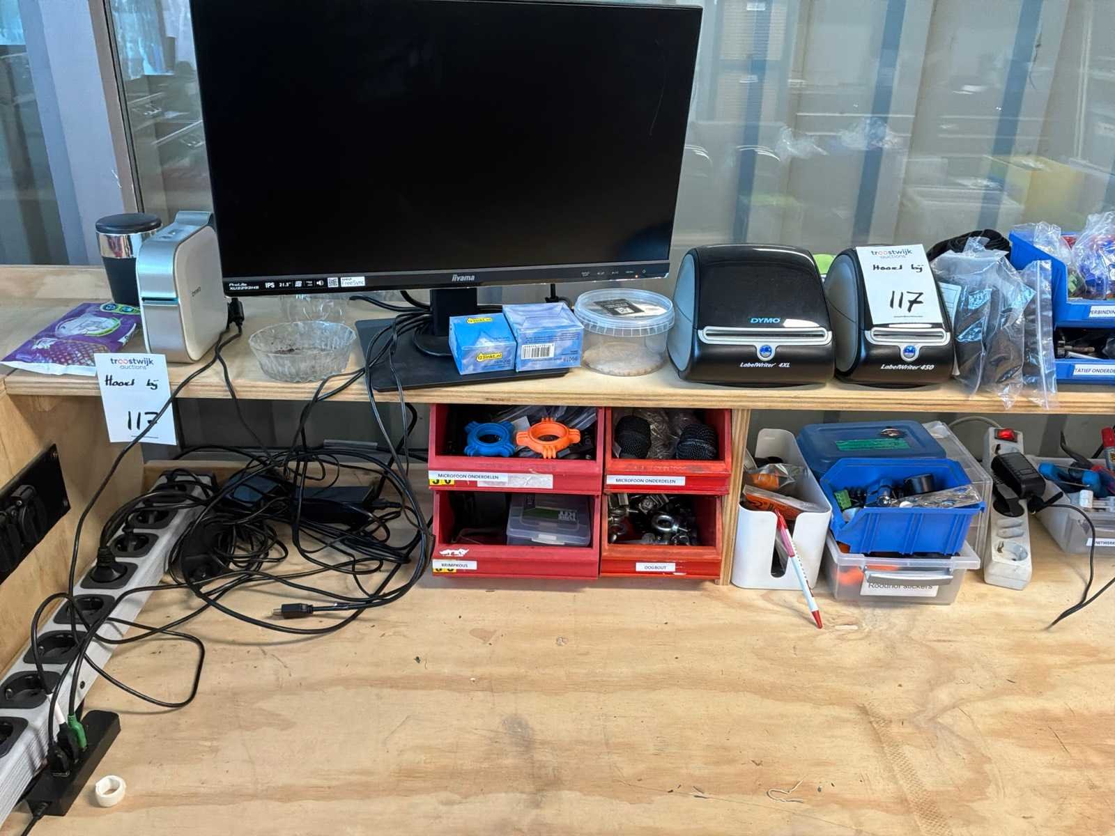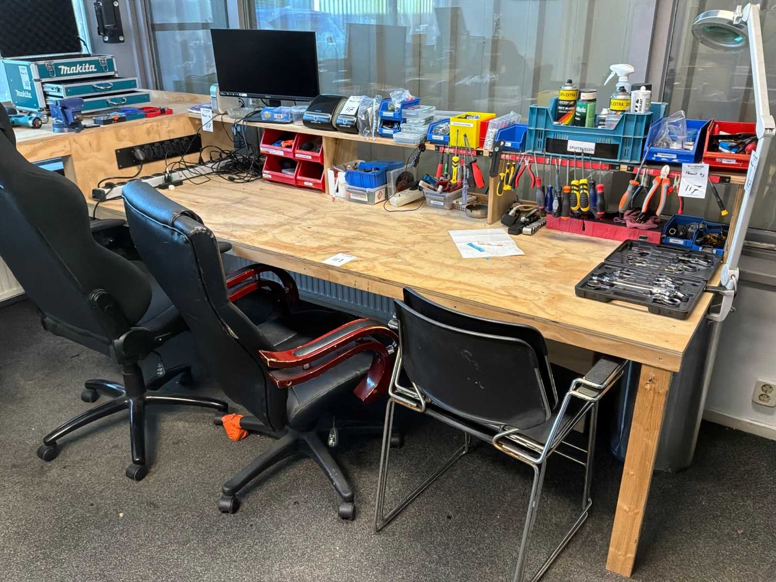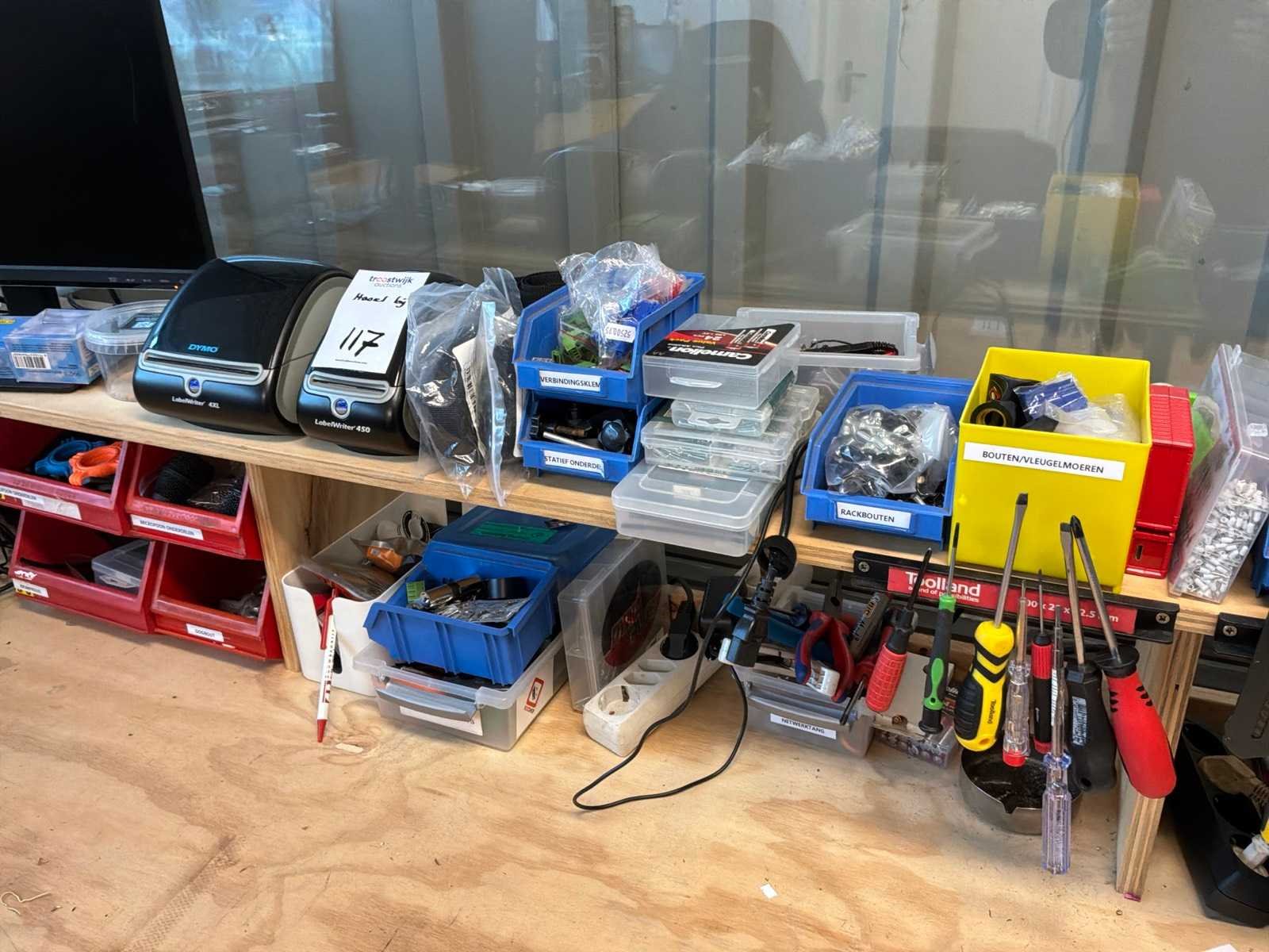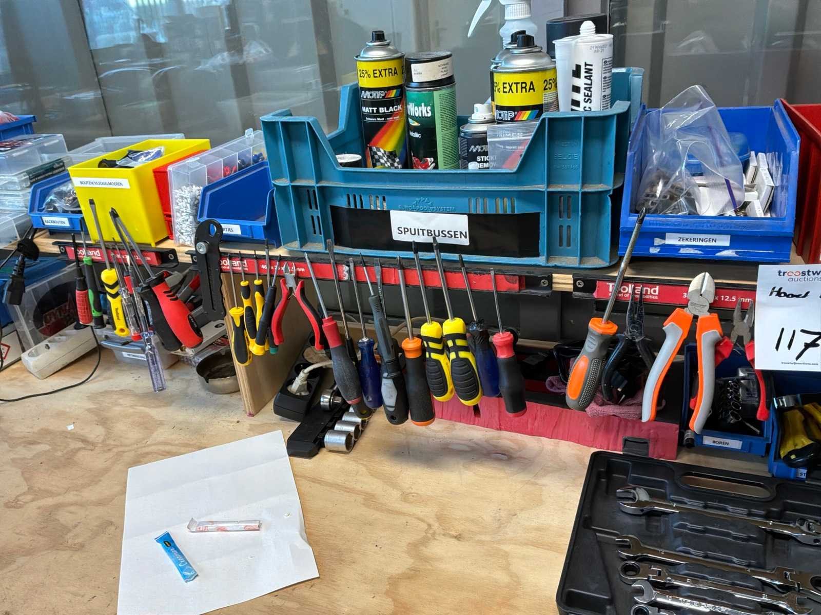 Waaronder; steek-ringsleutelset, schroevendraaiers, dymoprinters (3x) monitor, verdeeldoos (230V), 2x bureaustoel, 2x stoel, luchtcompressor.