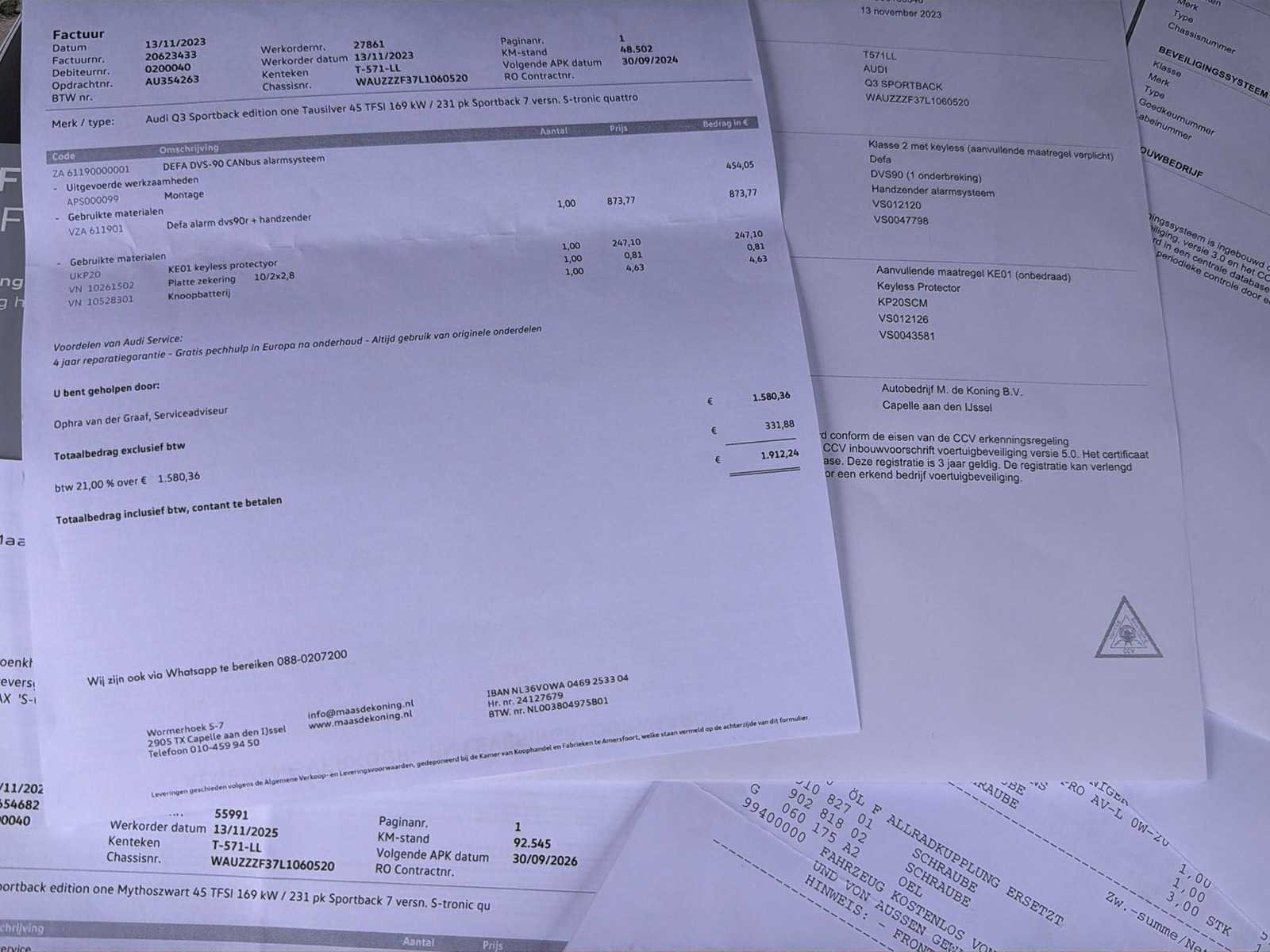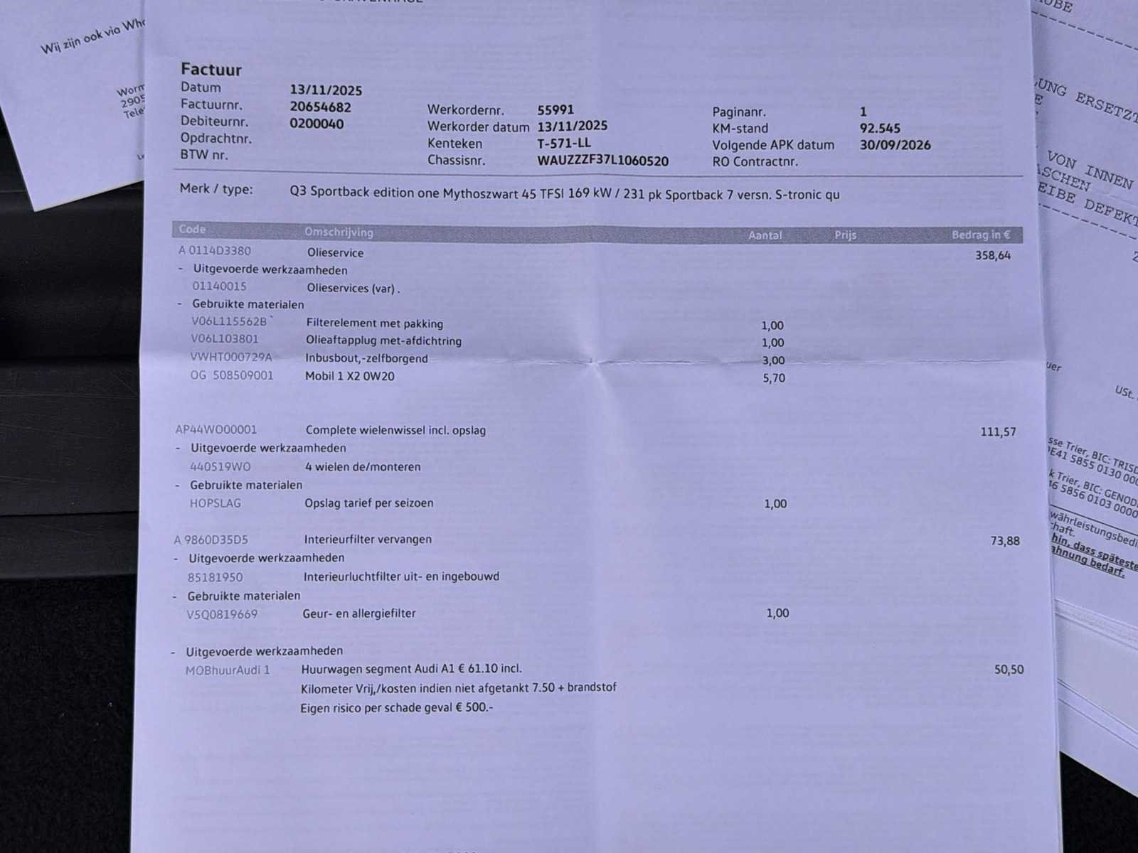 5KR : Achterbank plus KA2 : Achteruitrijcamera 9AK : Airconditioning, volautomatisch (2-zone) KH5 : Airconditioning, volautomatisch (3-zone) QQ2 : Ambiente lichtpakket 7AL : Anti-diefstal alarmsysteem 9VD : Audi sound system 9S8/9S9 : Audi virtual cockpit 4L6 : Binnenspiegel, automatisch dimmend 6XK : Buitenspiegels, elektrisch inklapbaar en automatisch dimmend 4I3 : Comfortsleutel 8T6 : Cruise control QV3 : Digitale radio ontvangst QL5 : Glas, donker getint (privacy glas) 8G1 : Grootlichtassistent 6NQ : Hemelbekleding in zwart 8X1 : Koplampreinigingsinstallatie PNR : MMI navigatie plus met MMI touch inclusief Audi Connect Basis - zonder Google Earth 7X2 : Parkeerhulp plus 7W1 : pre sense basic 1N7 : Progressieve besturing 1JC : Sportonderstel Q4H : Sportstoelen vóór 4A3 : Stoelen, vóór verwarmbaar QR9 : Verkeersbordenherkenning Kenteken: T-571-LL Merk: Audi Model: Q3 Sportback Type: 45 TFSI Quattro S-Line Bouwjaar: 2020 Afgelezen kilometerstand: 93205km Cilinderinhoud: 1984cc Vermogen (kW): 169kW Brandstof: Benzine Chassisnummer: WAUZZZF37L1060520 Datum eerste toelating: 2020-06-03 Datum eerste toelating (NL): 2023-11-02 APK vervaldatum: 2026-09-30 Vermogen (pk): 230hp Aandrijving: Start en rijdt Aantal zitplaatsen: 5 Kleur: grijs Transmissie: Automaat Emissieklasse: 6 Aantal deuren: 4 Aantal sleutels: 1 Ledig gewicht: 1600kg Bruto BPM (NL): 12698€ Aantal cilinders: 4 Carrosserie: hatchback Start en rijdt: Start and drive startinformatie : Start en rijdt