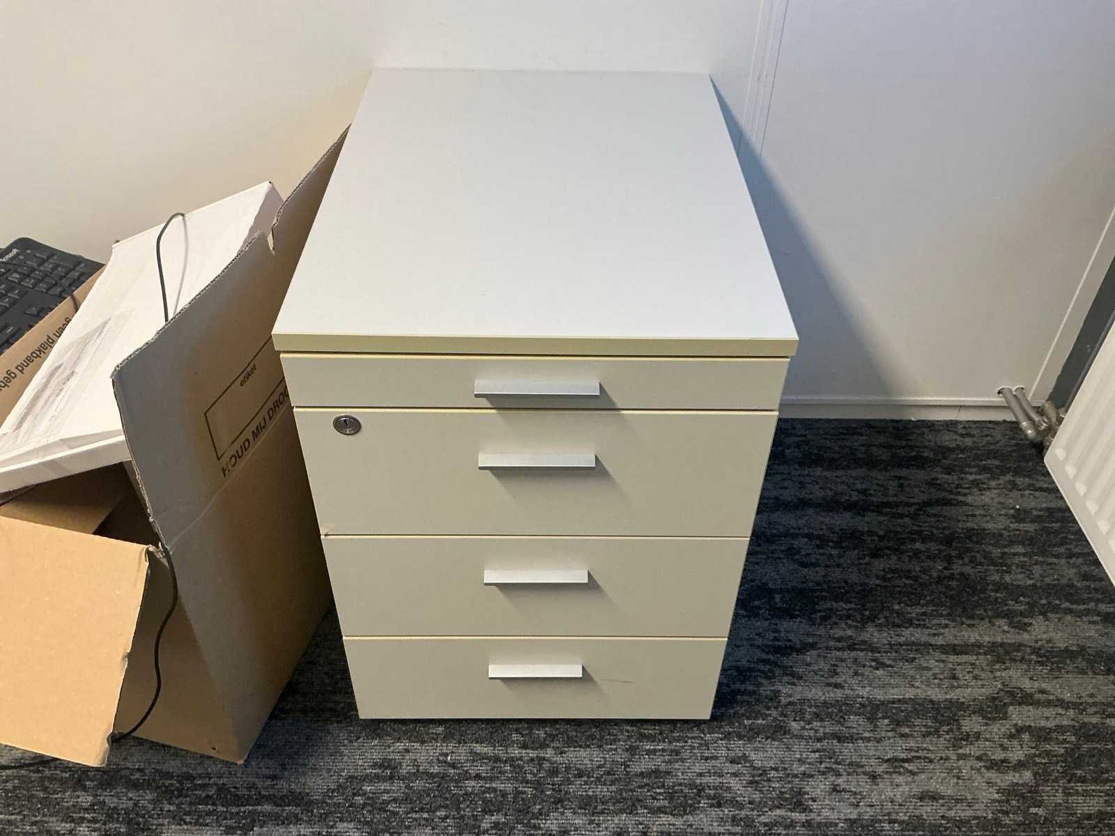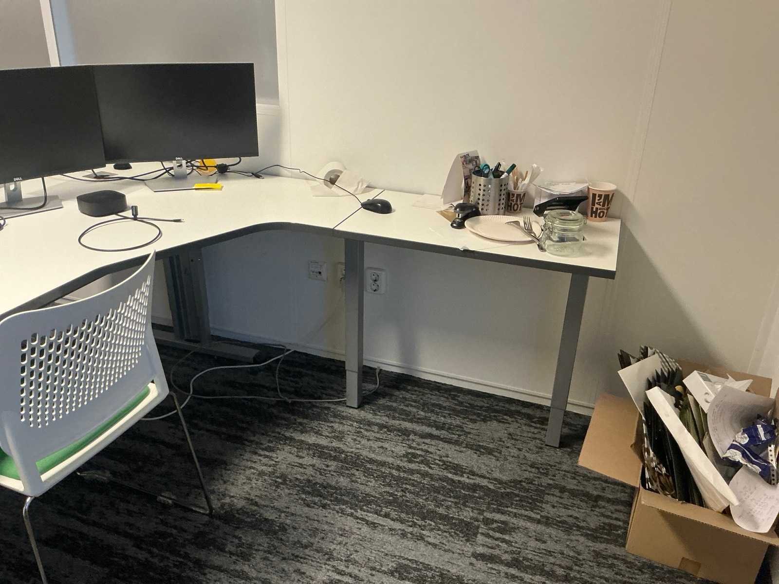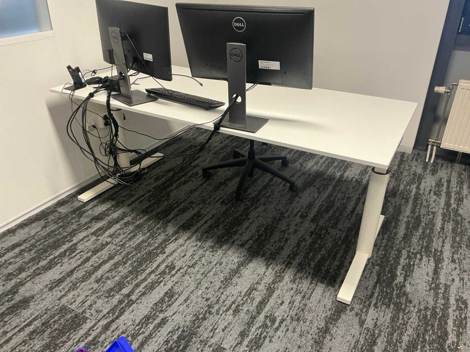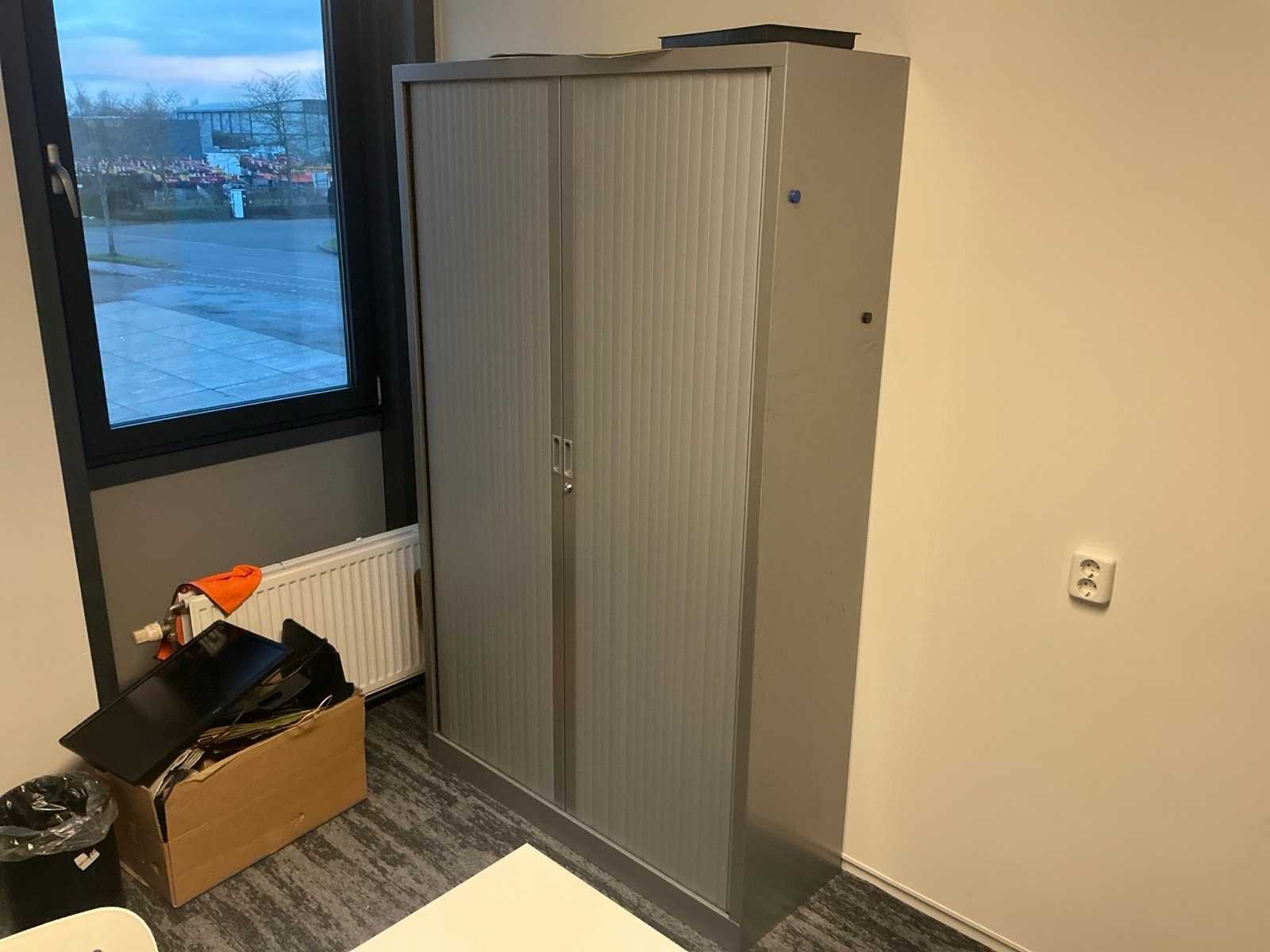 Bestaande uit: 4x bureau (190x200x75 cm, 3x 160x80x78 cm), 3x vergaderstoel, roldeurkast (120x43x197 cm), ladeblok, 2x bureaustoel. Overige goederen niet inbegrepen.