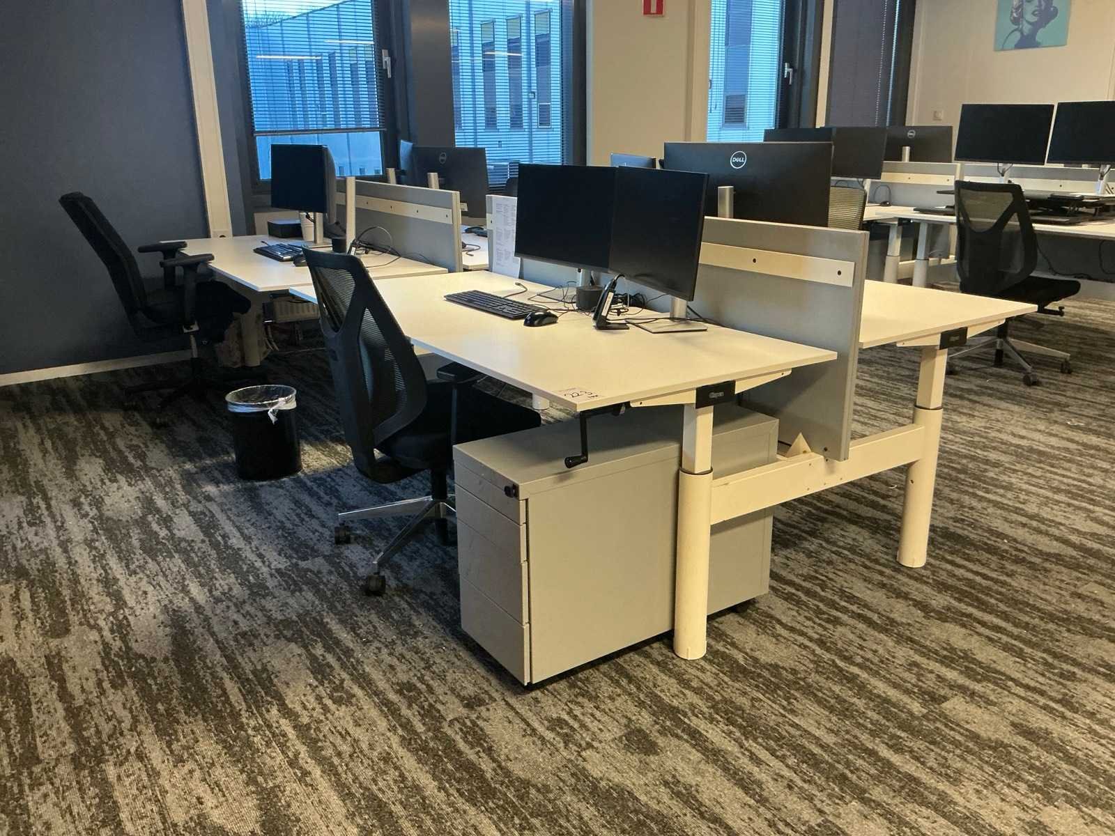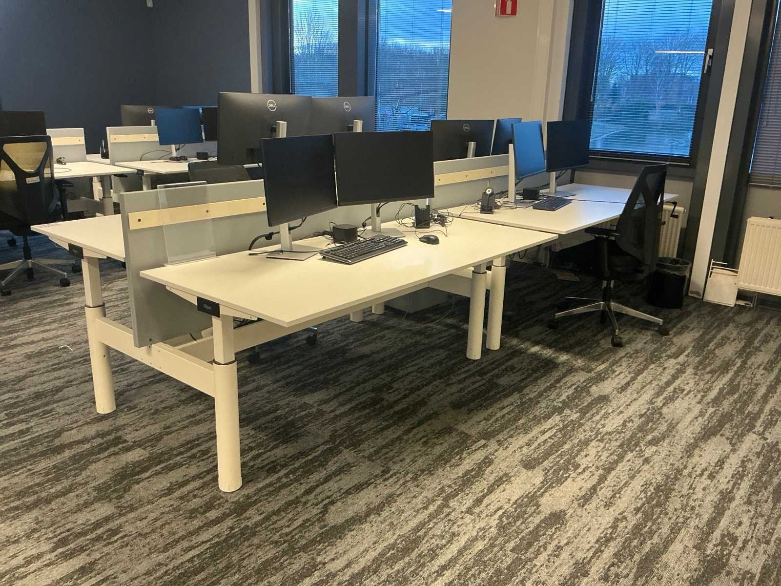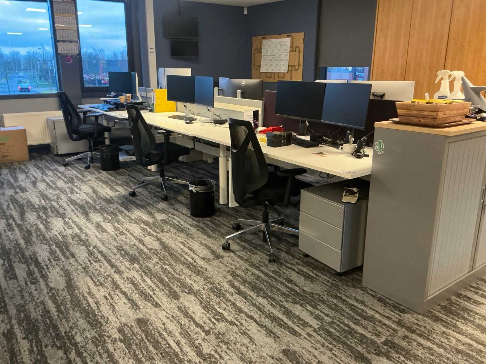 Waaronder: Gispen. Afmeting blad: 180x80 cm. Met 13x bureaustoel, 10x ladeblok, roldeurkast (120x45x105 cm), Overige goederen niet inbegrepen. Slingerbureau: true Lengte: 170cm Breedte: 180cm Hoogte: 105cm