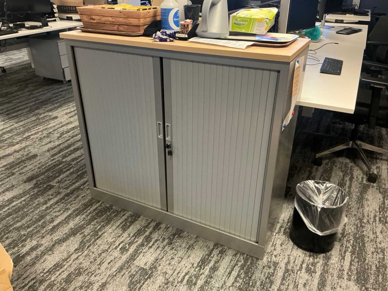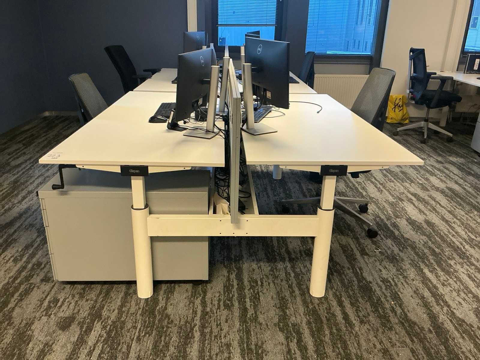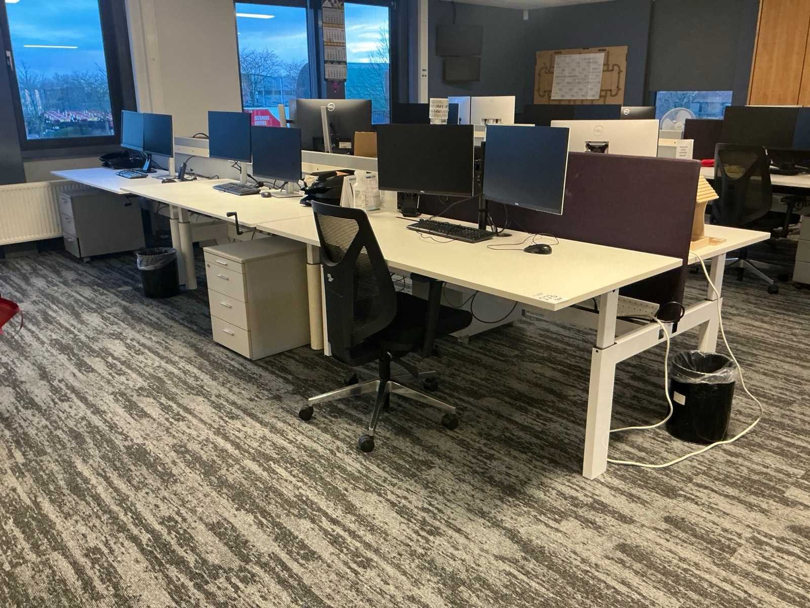 Waaronder: Gispen. Afmeting blad: 180x80 cm. Met 13x bureaustoel, 10x ladeblok, roldeurkast (120x45x105 cm), Overige goederen niet inbegrepen. Slingerbureau: true Lengte: 170cm Breedte: 180cm Hoogte: 105cm