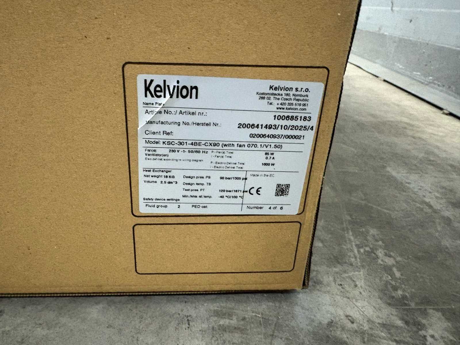 Voor Technische specificaties zie foto’s. Verdamper bevind zich in transport krat/doos. Merk: Kelvion Aansluiting: 230V Eigen gewicht: 18kg Type koudemiddel: R744 Type: KSC 301-4BE