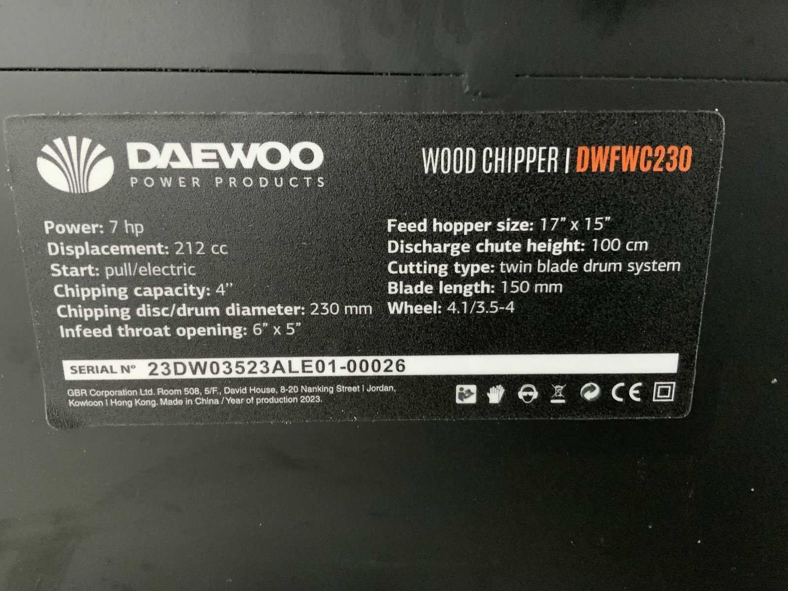 7 hp; 212cc; 4 inch chipping capacity; dual v belt drive; meslengte 150 mm; twin blade drum system; bouwpakket; ongebruikt; 6468 Merk: Daewoo Type: DWFWC230 Bouwjaar: 2025 Brandstofmotor aangedreven: true Brandstof: Gasoline Eigen gewicht: 88kg Totale afmeting L: 1600mm Totale afmeting Breedte: 620mm Totale afmeting Hoogte: 1200mm