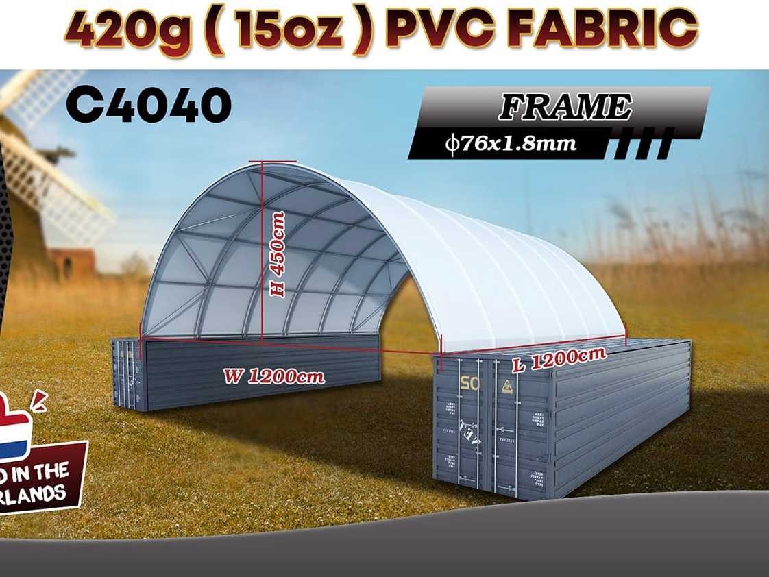 Voorzien van opslagtent / opslag shelter; singel trussen-/buizensysteem; gegalvaniseerd; beide uiteinden een deur; materiaal 420 gram PVC cover; kleur wit; inclusief montage handleiding; ongebruikt in metalen kist (transport afmetingen 243x75x118 cm) LET OP AFHALEN OP AFSPRAAK IN VERBAND MET HET GEWICHT VAN DE KAVEL ! Merk: Rhino-Cross-Shelter Type: C4040 - 12x12x4,5 m Bouwjaar: 2025 Eigen gewicht: 980kg Totale afmeting L: 12000mm Totale afmeting Breedte: 12000mm Totale afmeting Hoogte: 4500mm