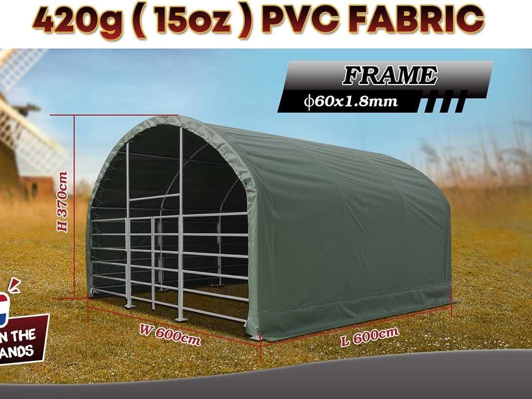 Voorzien van opslagtent / dierenverblijf; singel trussen-/buizensysteem; gegalvaniseerd; materiaal 420 gram PVC cover; kleur army green; inclusief montage handleiding; ongebruikt in metalen kist (transport afmetingen 260x110x118 cm) LET OP AFHALEN OP AFSPRAAK IN VERBAND MET HET GEWICHT VAN DE KAVEL ! Merk: Rhino-cross-shelters Product type: Cattle tent 6x6x3,7 m Gewicht: 730kg Lengte: 600cm Breedte: 600cm Hoogte: 370cm Materiaal: 420g PVC