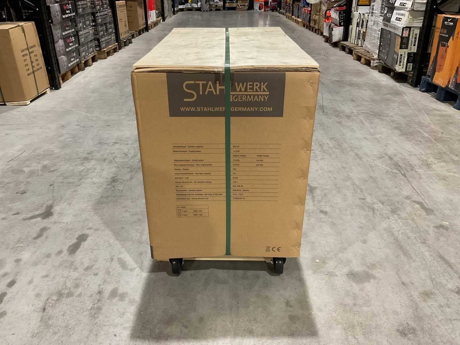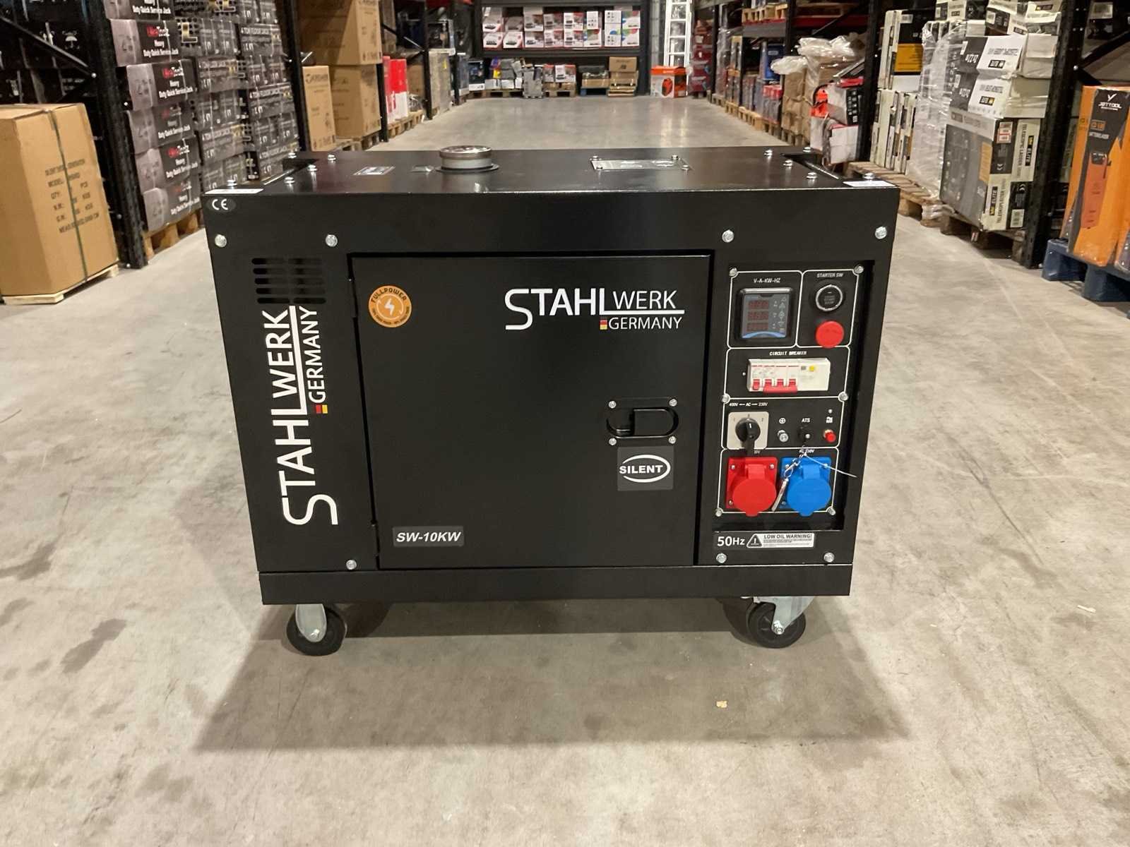 Voorzien van Dieselmotor; Cilinderinhoud: 532 CC; Motorvermogen: 11,0 HP; Uitgangsvermogen (nominaal): Enkel fase: 7,9 kVA, Drie fase: 8,8 kVA; Maximaal uitgangsvermogen: Enkel fase: 8,8 kVA, Drie fase: 9,8 kVA, Brandstoftank: 15 liter; Oliecapaciteit: 1,65 liter; Elektrisch (Electric Start); Display: LED; Geluidsniveau: 72 dB(A) @ 7 meter; Bedrijfstijd bij 75% belasting: 7,0 – 7,5 uur; AC-uitgangen: 1x 230V / 32A (3-pins), 1x 400V / 16A (5-pins); Ongebruikt (Transport afmeting; 980x56x860mm; Gewicht 182 kg) Merk: Stahlwerk Type: SW-10KW Bouwjaar: 2025 Capaciteit.: 10kVA Diesel: true Mobiel: true Handboek aanwezig: true Machinegewicht: 170kg Totale afmeting L: 960mm Totale afmeting Breedte: 820mm Totale afmeting Hoogte: 540mm