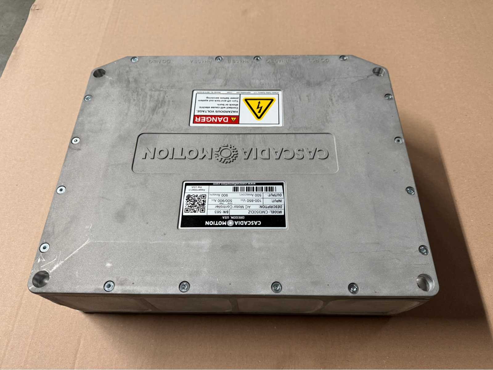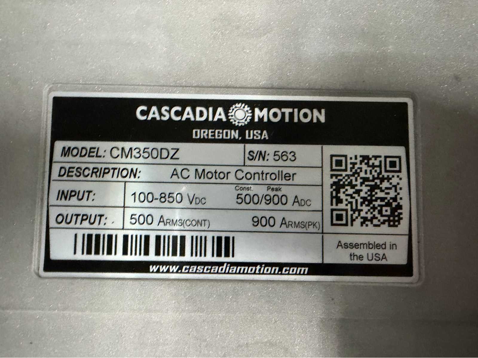 Serienummer: 563; input: 100-850VDC; output: 500 arms Merk: Cascadia Motion Model: CM350DZ