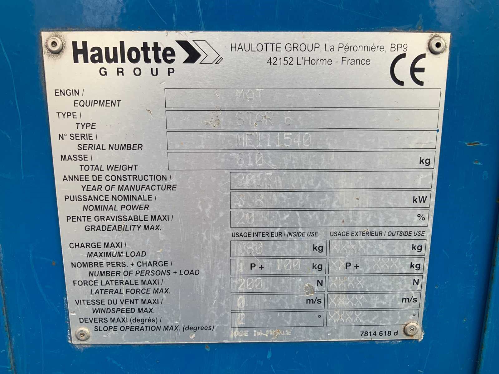 Uitgevoerd met non marking banden, met gebruikershandleiding en stopcontact op het platform. Merk: Haulotte Type: Star6 Bouwjaar: 2013 Serienummer: ME111540 Elektrisch: true Masthoogwerker: true Werkhoogte: 5800mm Plateau afm. l: 700mm Plateau afm. b: 700mm Platform capaciteit: 180kg Accu lader: true Afgelezen urenstand: 294 Eigen gewicht: 810kg Totale afmeting L: 1550mm Totale afmeting Breedte: 740mm Totale afmeting Hoogte: 1630mm