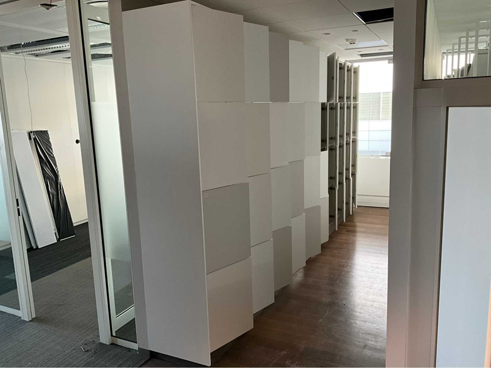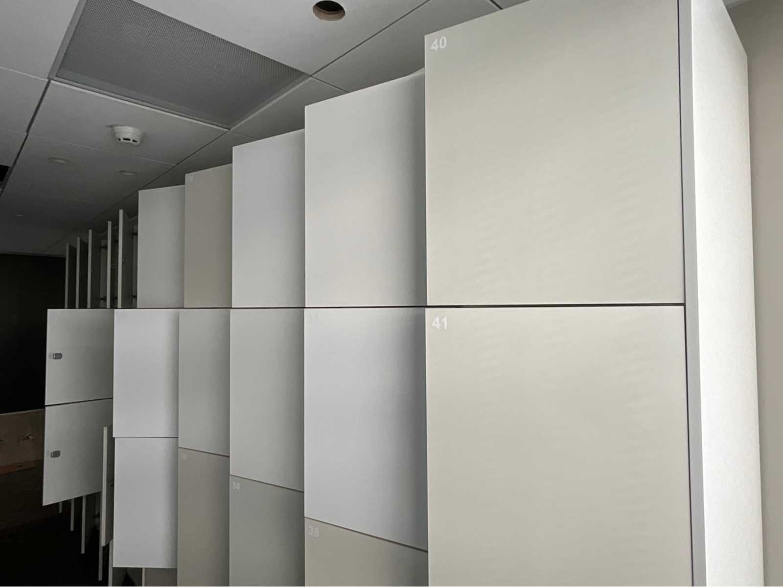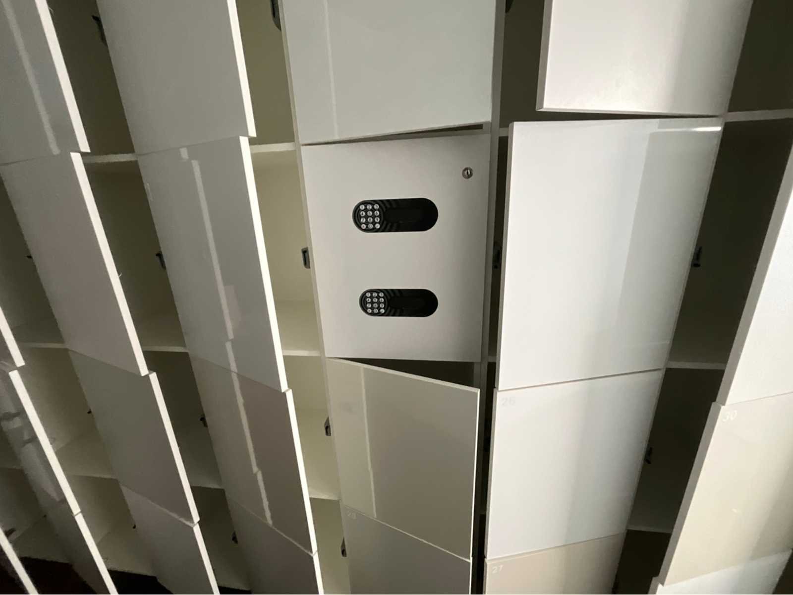 Elektronische kluisjes. 43 stuks met elektrisch slot; reeds gedemonteerd; Merk: Metra Type: Electronic locking system Lengte: 500cm Hoogte: 245cm Diepte: 45cm