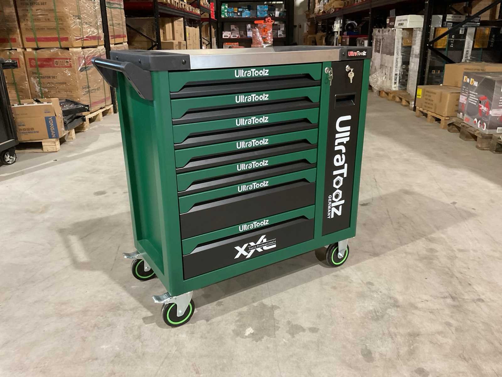 Voorzien van 7 lades waarvan 7 gevuld met gereedschap; zij lade; professioneel chroom-vanadium gereedschap; heavy duty gereedschapswagen; stevig werkblad; 4 wielen; stevig handvat; ongebruikt in doos (transport afmetingen 95x50x85 cm) Merk: UltraToolz Type: Germany 8/7 Bouwjaar: 2025 Aantal laden: 7 Met inhoud: true Eigen gewicht: 83kg Totale afmeting L: 950mm Totale afmeting Breedte: 500mm Totale afmeting Hoogte: 850mm