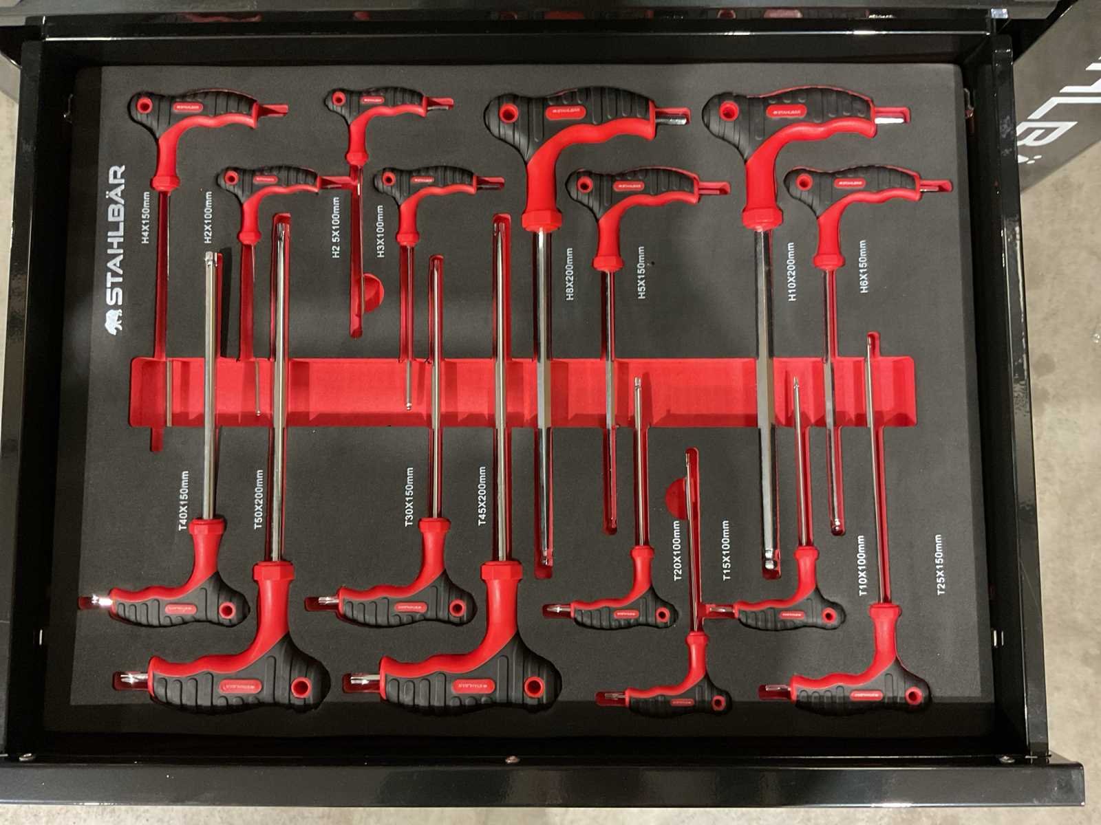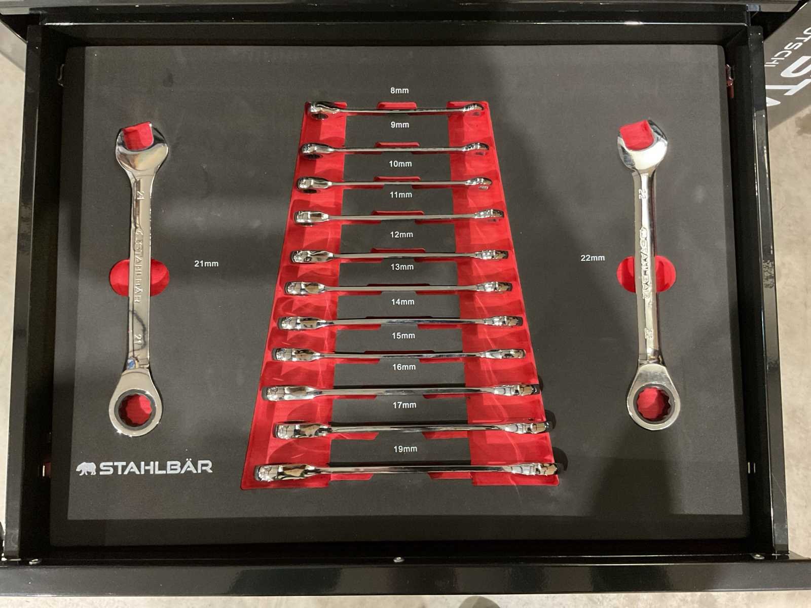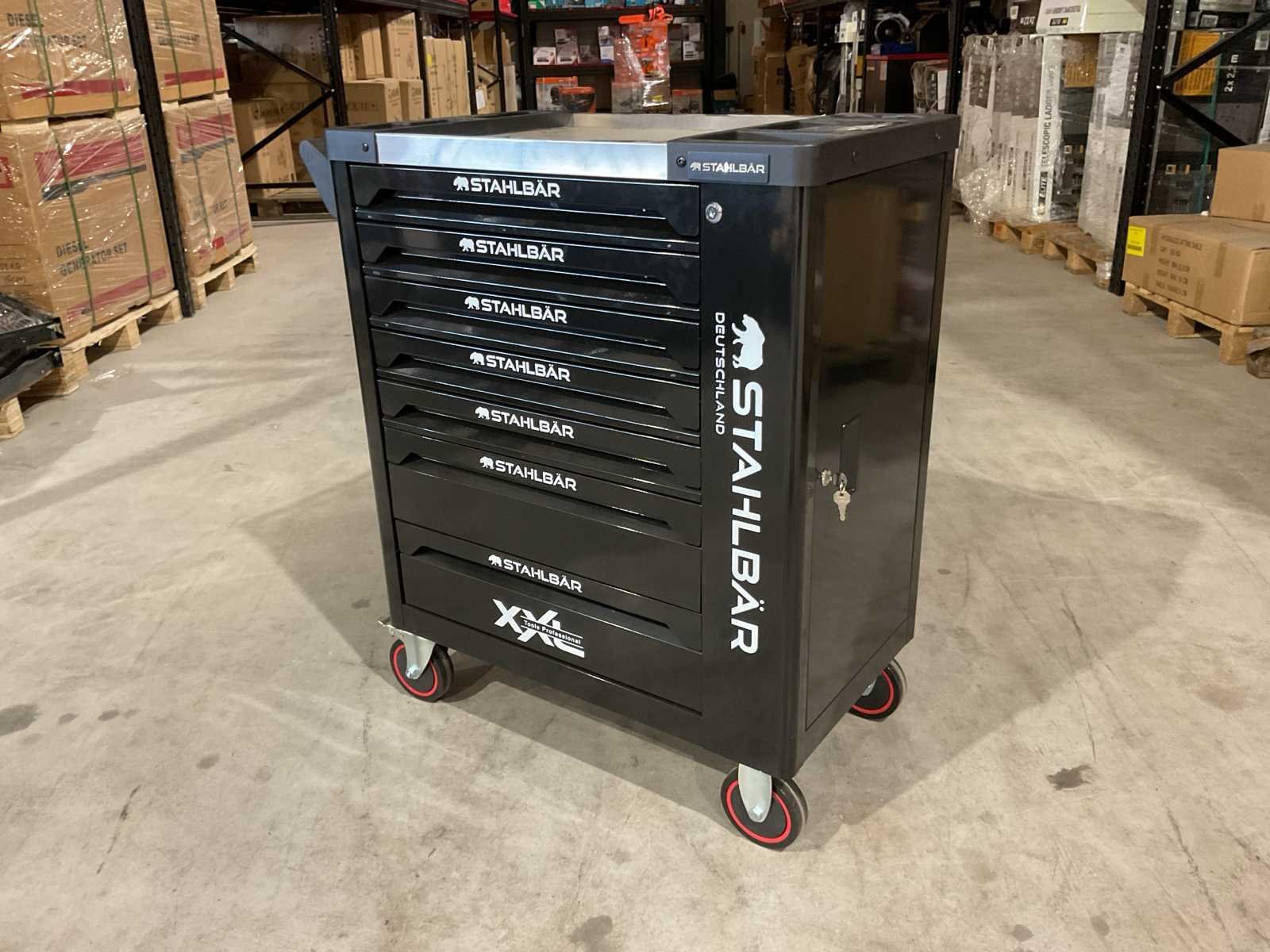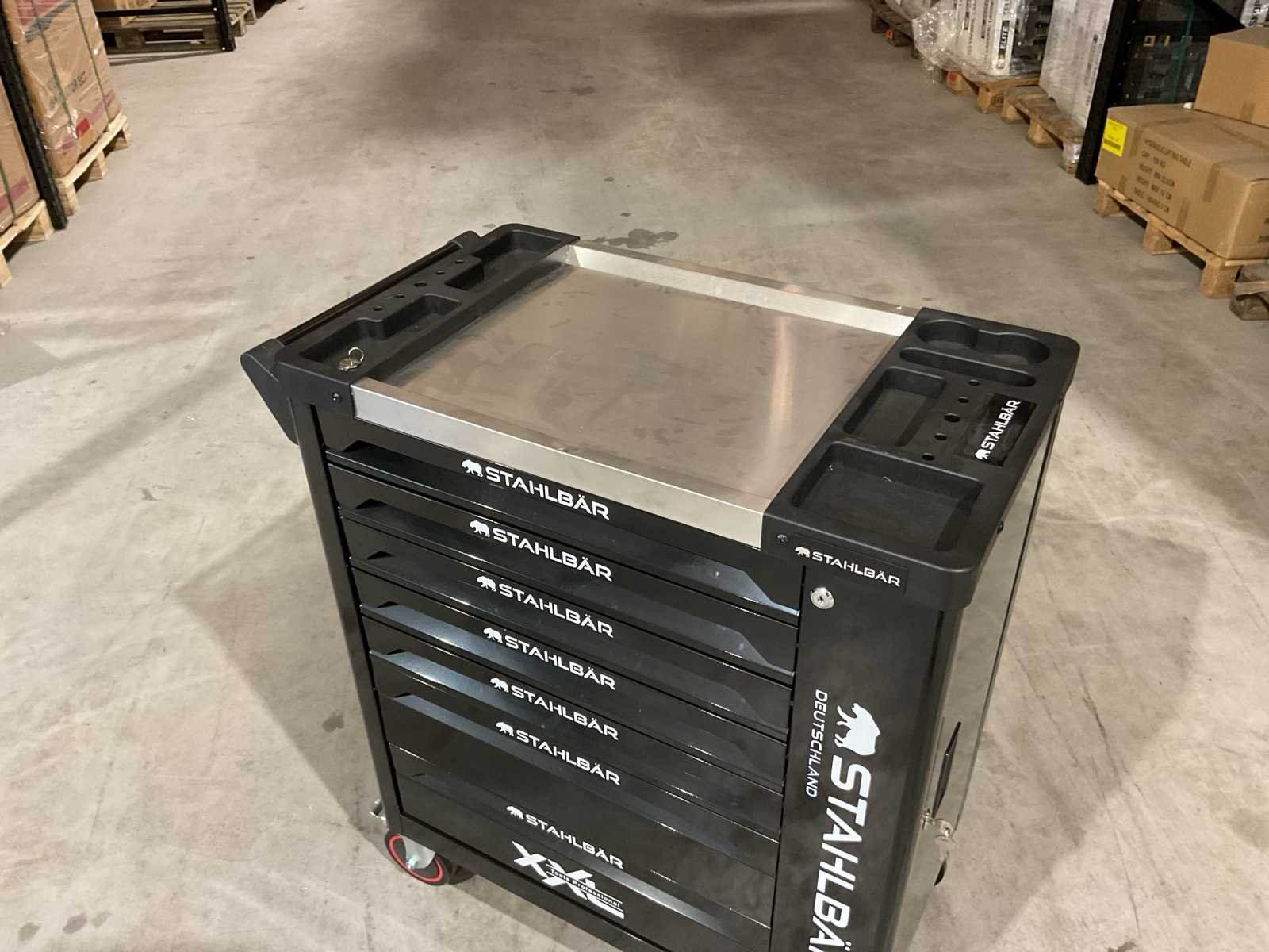 Voorzien van 7 lades waarvan 7 gevuld met gereedschap; professioneel chroom-vanadium gereedschap; heavy duty gereedschapswagen; stevig werkblad; 4 wielen; stevig handvat; ongebruikt in doos (transport afmetingen 80x50x85 cm) Merk: Stahlbär Type: Deutschland 7/7 Bouwjaar: 2025 Aantal laden: 7 Met inhoud: true Eigen gewicht: 78kg Totale afmeting L: 800mm Totale afmeting Breedte: 500mm Totale afmeting Hoogte: 850mm