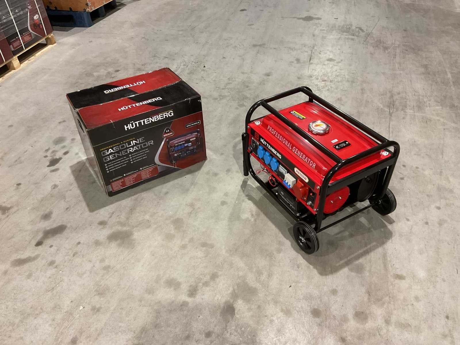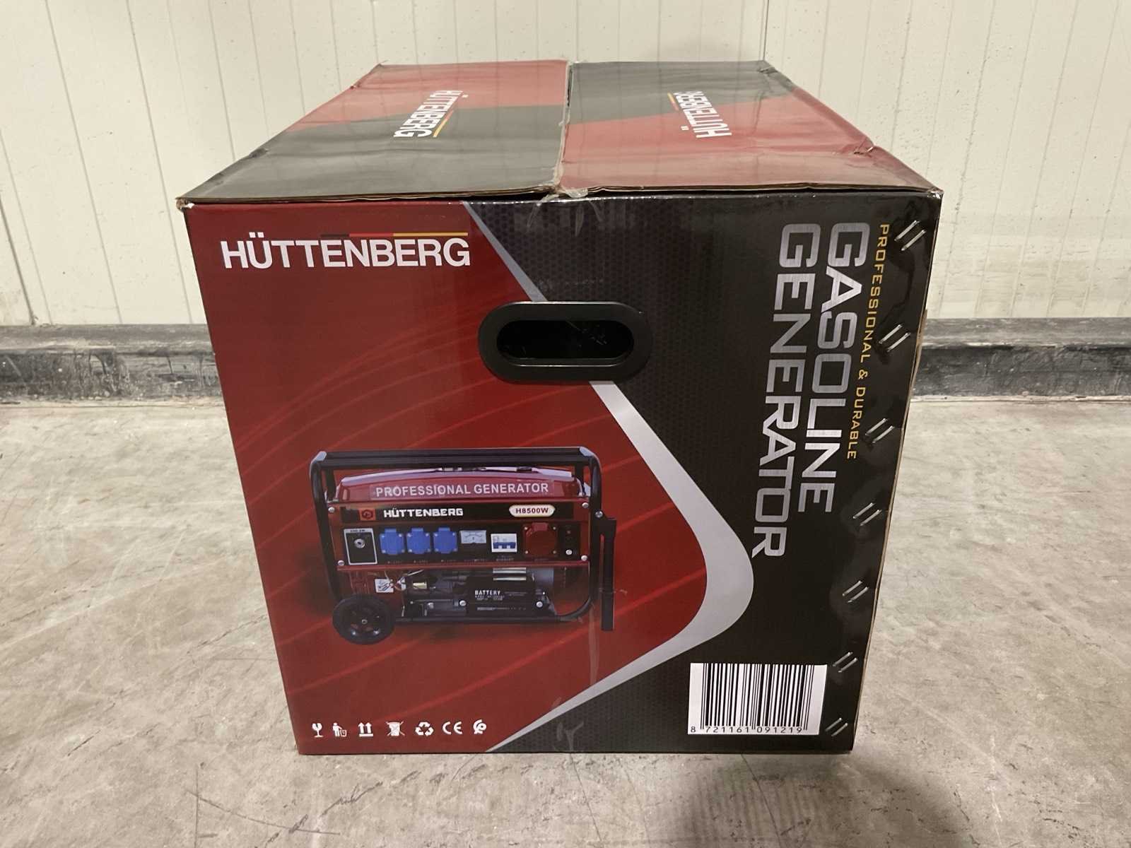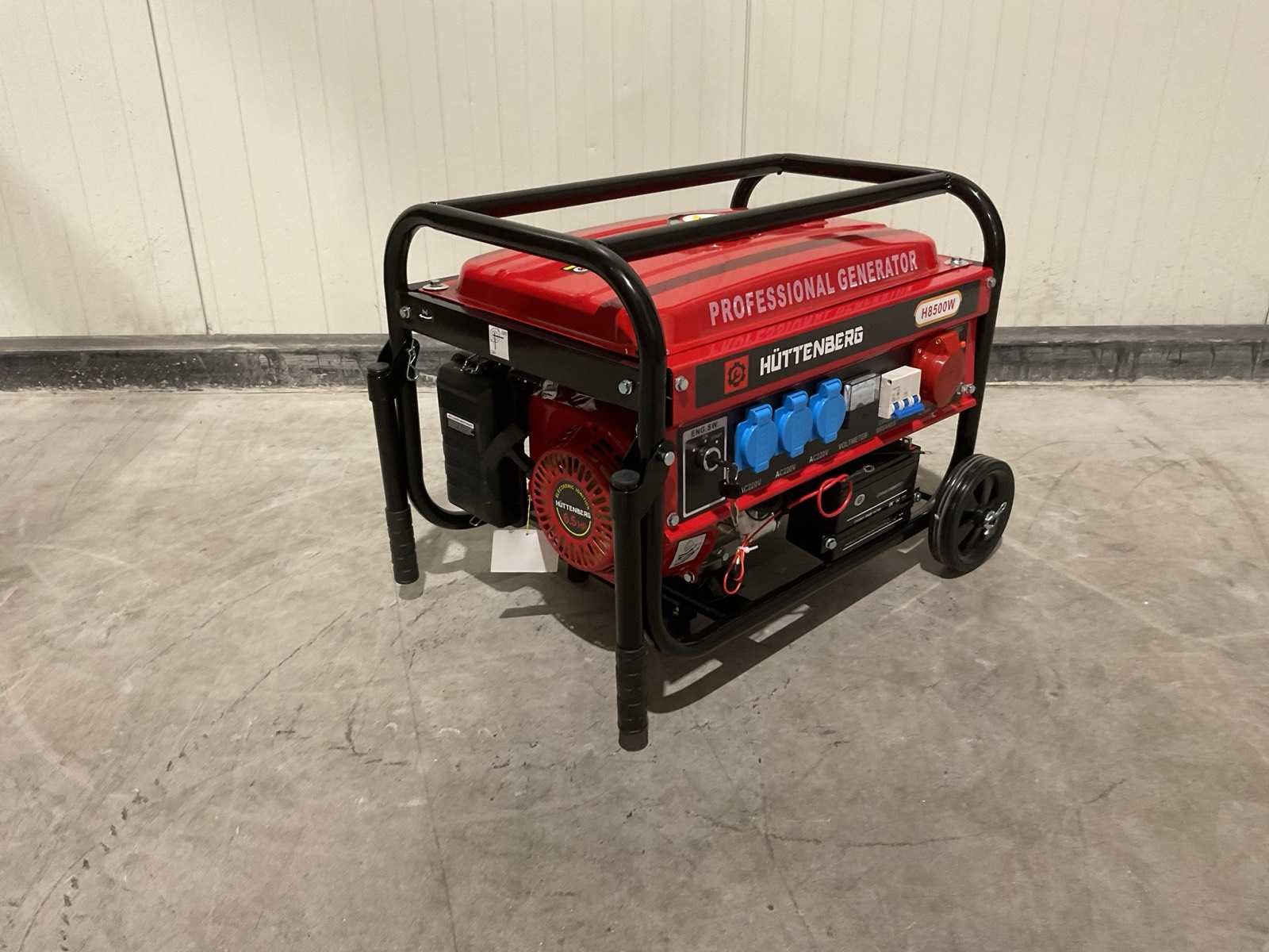 Voorzien van 12liter tankinhoud; Nominale spanning 220v / 380v; Nominale frequentie 50Hz; Motor 5,5 PK GX160 163cc; Olie inhoud 0,6 L; nieuw in doos Merk: Huttenberg Type: H8500 op wielen met accu Bouwjaar: 2025 Benzine: true