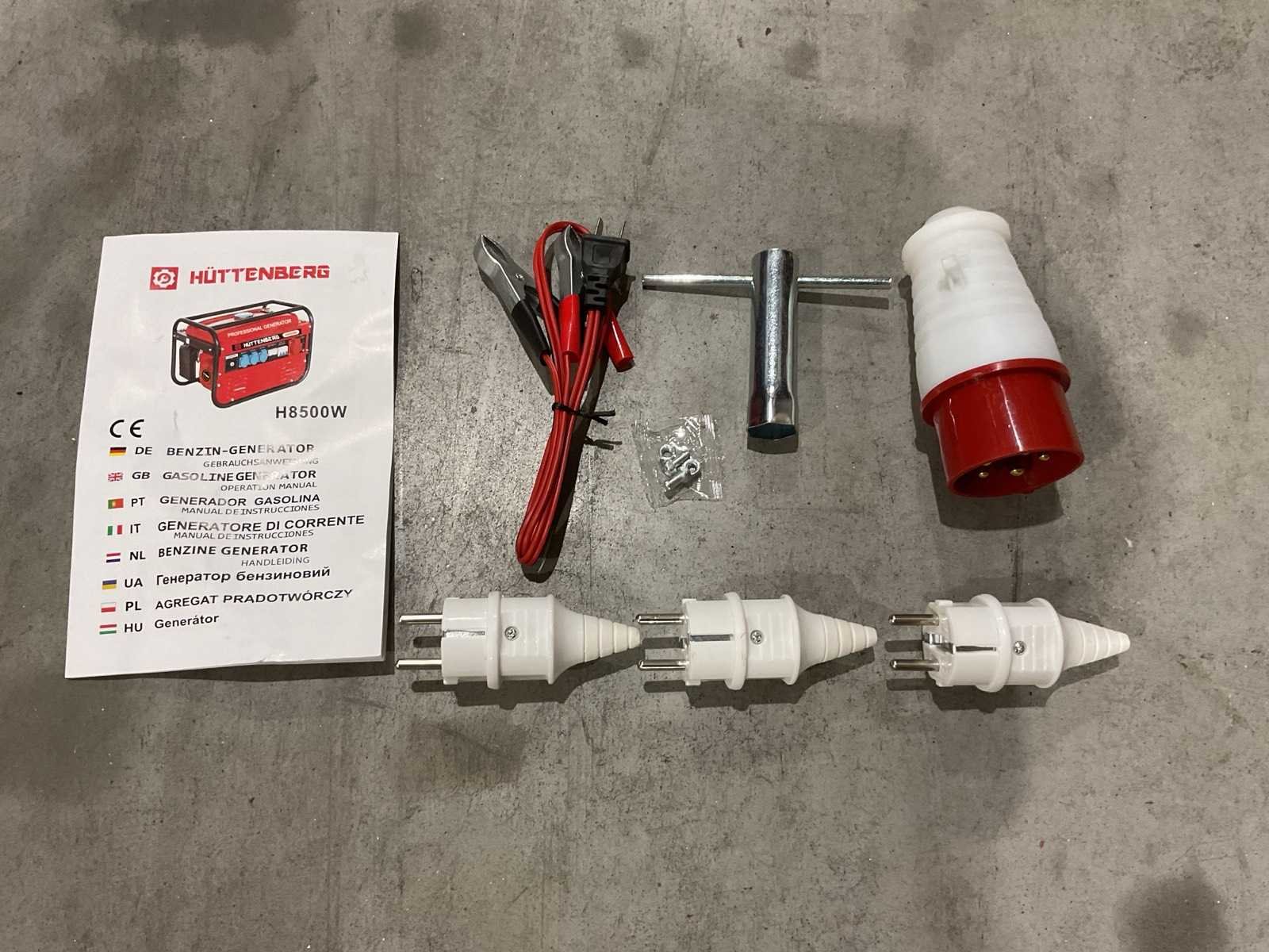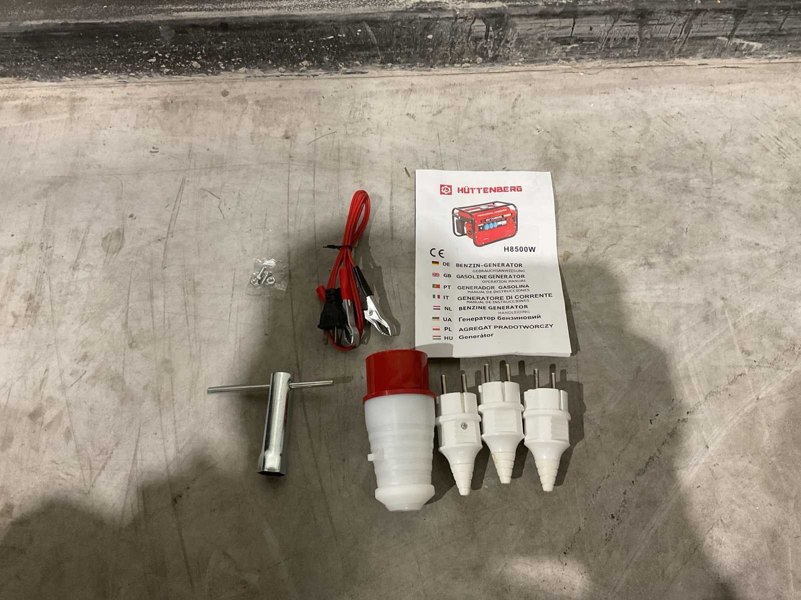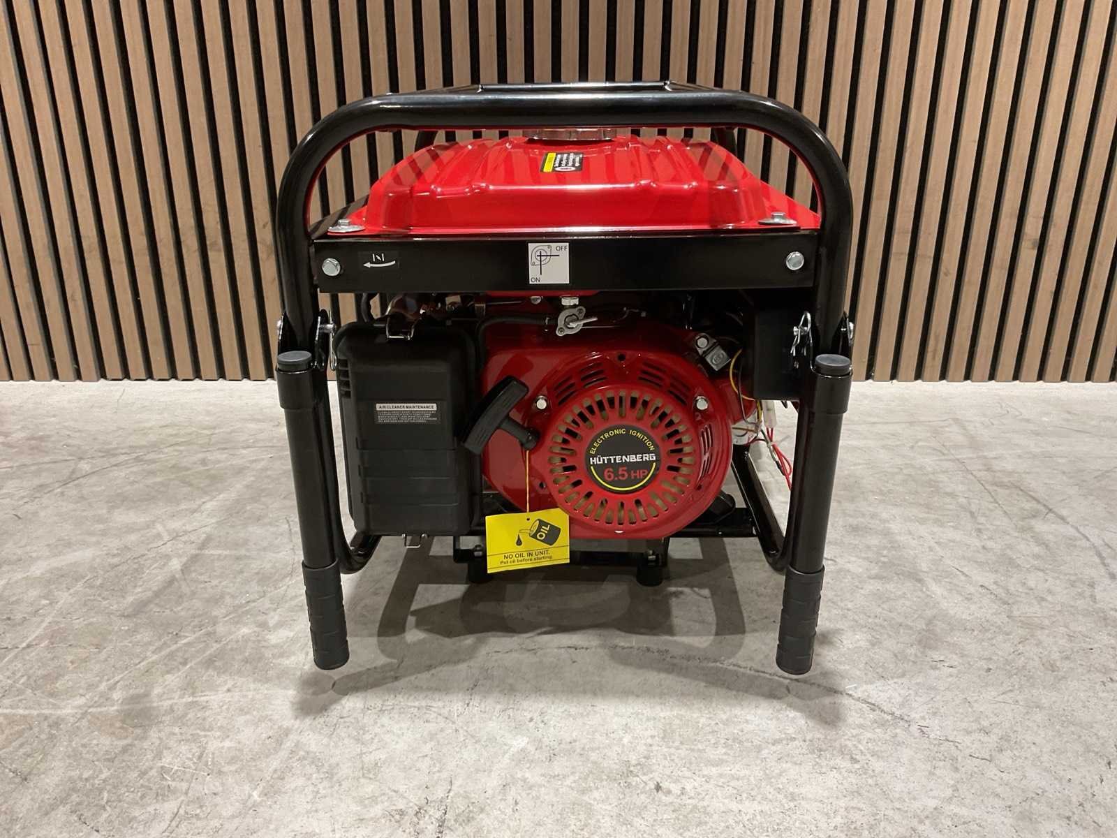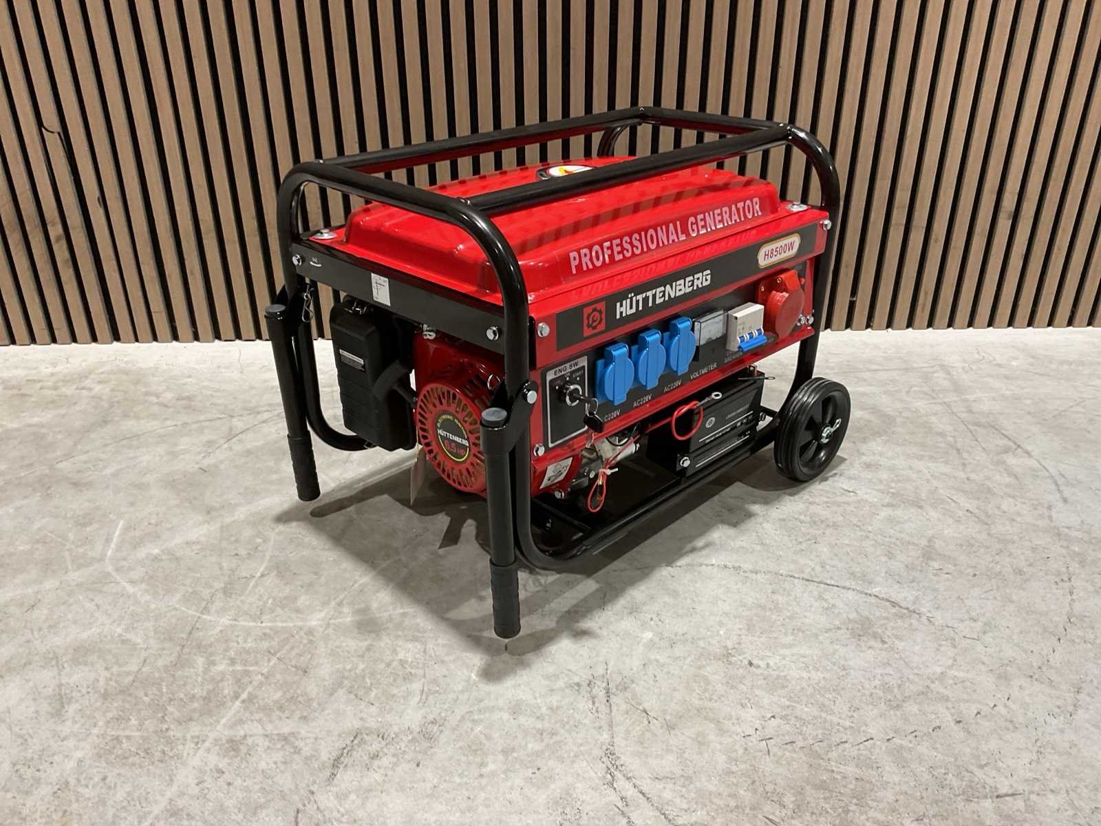 Voorzien van 12liter tankinhoud; Nominale spanning 220v / 380v; Nominale frequentie 50Hz; Motor 5,5 PK GX160 163cc; Olie inhoud 0,6 L; nieuw in doos Merk: Huttenberg Type: H8500 op wielen met accu Bouwjaar: 2025 Benzine: true