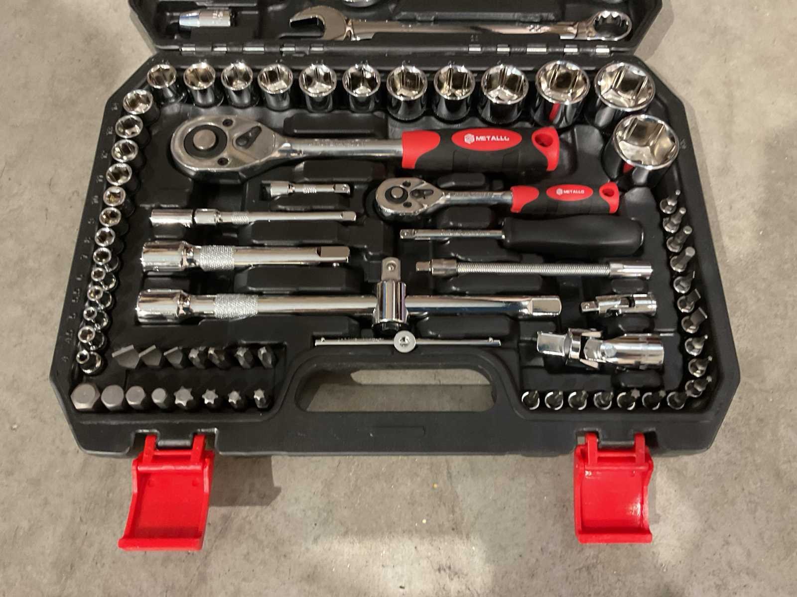 Voorzien van 9 x Ring/steeksleutel; 2 x Bougiesleutel; 2 x adapters; 12 x 1/2"Doppenset; 13 x 1/4" Doppenset; 15 x bitset; 2 x Ratelsleutel; 3 x verlengstukken; 1 x Spinner; 1 x Flexibele verlengstuk; 2 x Sliding T-Bar; 2 x Universele aansluiting; 17 x bitjes set; 1 x Kunststofkoffer; Ongebruikt in doos (Transport afmeting 385 x 80 x 290, Gewicht 5.75 KG Merk: Metallo Met koffer: true Delig: 82 Type: META-82W Bouwjaar: 2025