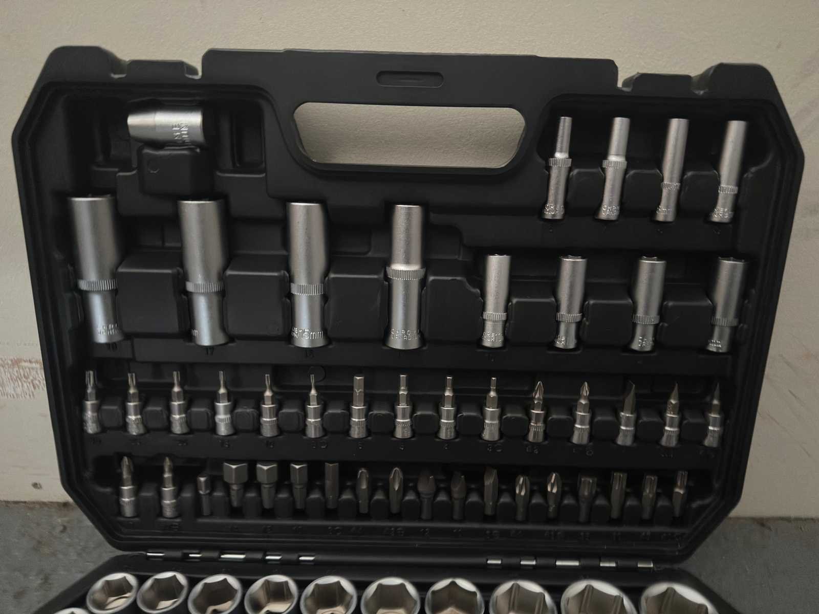 Voorzien van 13 x doppenset DR6PTREG maten 4-4,5-5-5,5-6-7-8-9-10-11-12-13-14; 8 1/4” DR6PT diepe doppen maten: 6-7-8-9-10-11-12-13; 3 x 1/4” DRBIT Doppen: FD 4-5,5-7; 2 x 1/4” DRBIT Doppen: PH1-PH2; 2 x 1/4” DRBIT doppen: PZ1-PZ2; 4 x 1/4” DRBIT Doppen: HW 3-4-5-6; 6 X 1/4” DRBIT Doppen: TX 8-10-15-20-25-30; 1 X 1/4” Doppenadapter; 1 x 1/4” DR Ratelsleutel; 2 x 1/4” DR verlengstuk 2”-4”; 1 x 1/4” verstelbare t sleutel; 1 x 1/4” DR universele koppeling; 1 x DR Spinnersleutel; 1 x DR Flexibele spinner sleutel; 18 x 1/2” DR6PTREG doppen: 10-11-12-13-14-15-16-17-18-19-20-21-22-23-24-27-30-32; 4 x 1/2” DR6PTDEEP doppen: 14-15-17-19; 2 x 1/2” DREXTENTION: 5-10’; 2 x 1/2” Bougie sleutel 16-21; 1 x 1/2” DR Universele koppeling; 1 x 1/2” DR 8 Hexagon bit koppeling; 1 x 3/8” Fx1/2”M 3weg adapter; 5 x inbussleutel 1,5-2-25 25-bits; kunststof koffer; Ongebruikt in doos Merk: Metallo Met koffer: true Delig: 106 Type: META-106W Bouwjaar: 2024