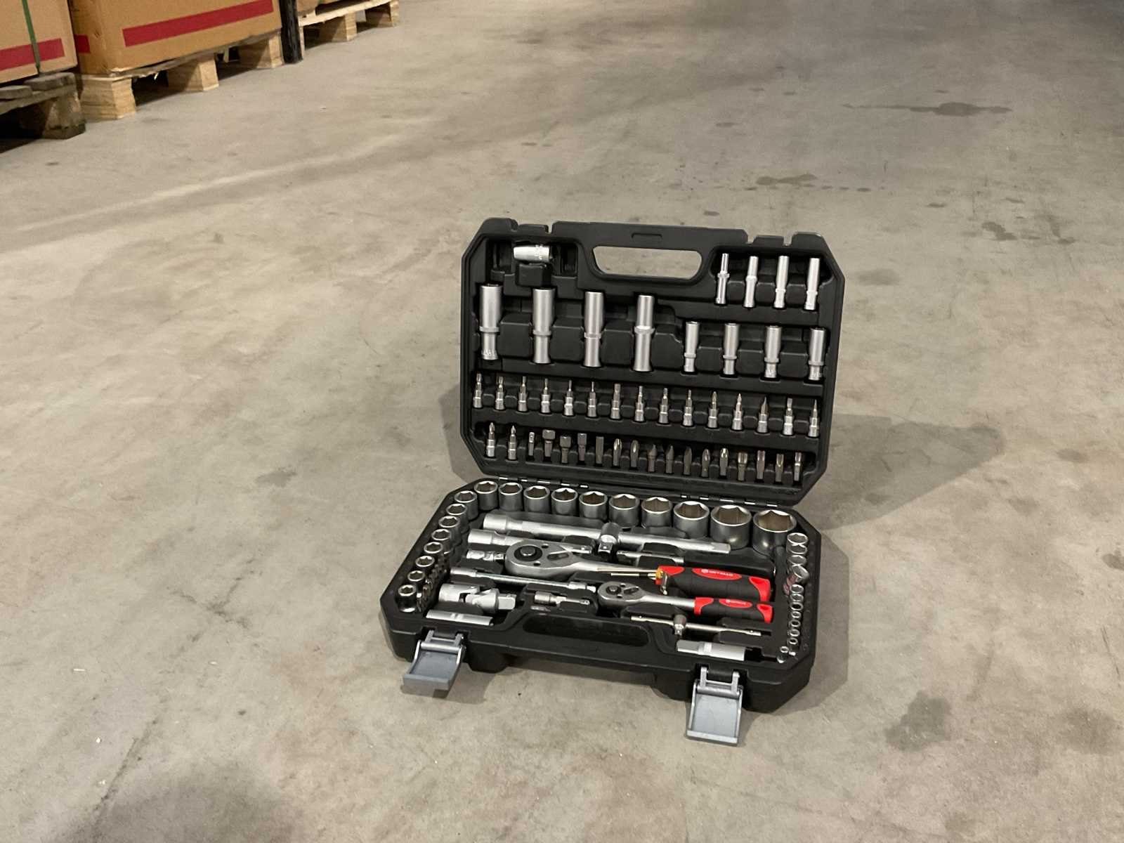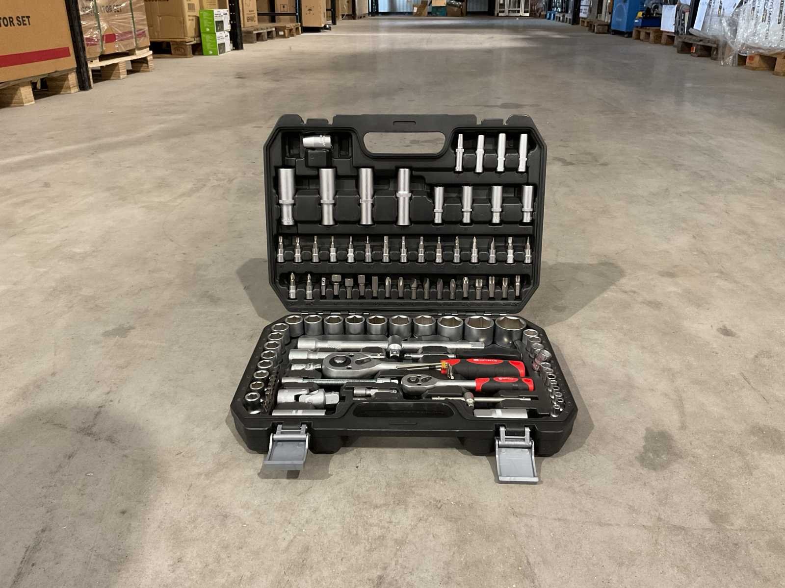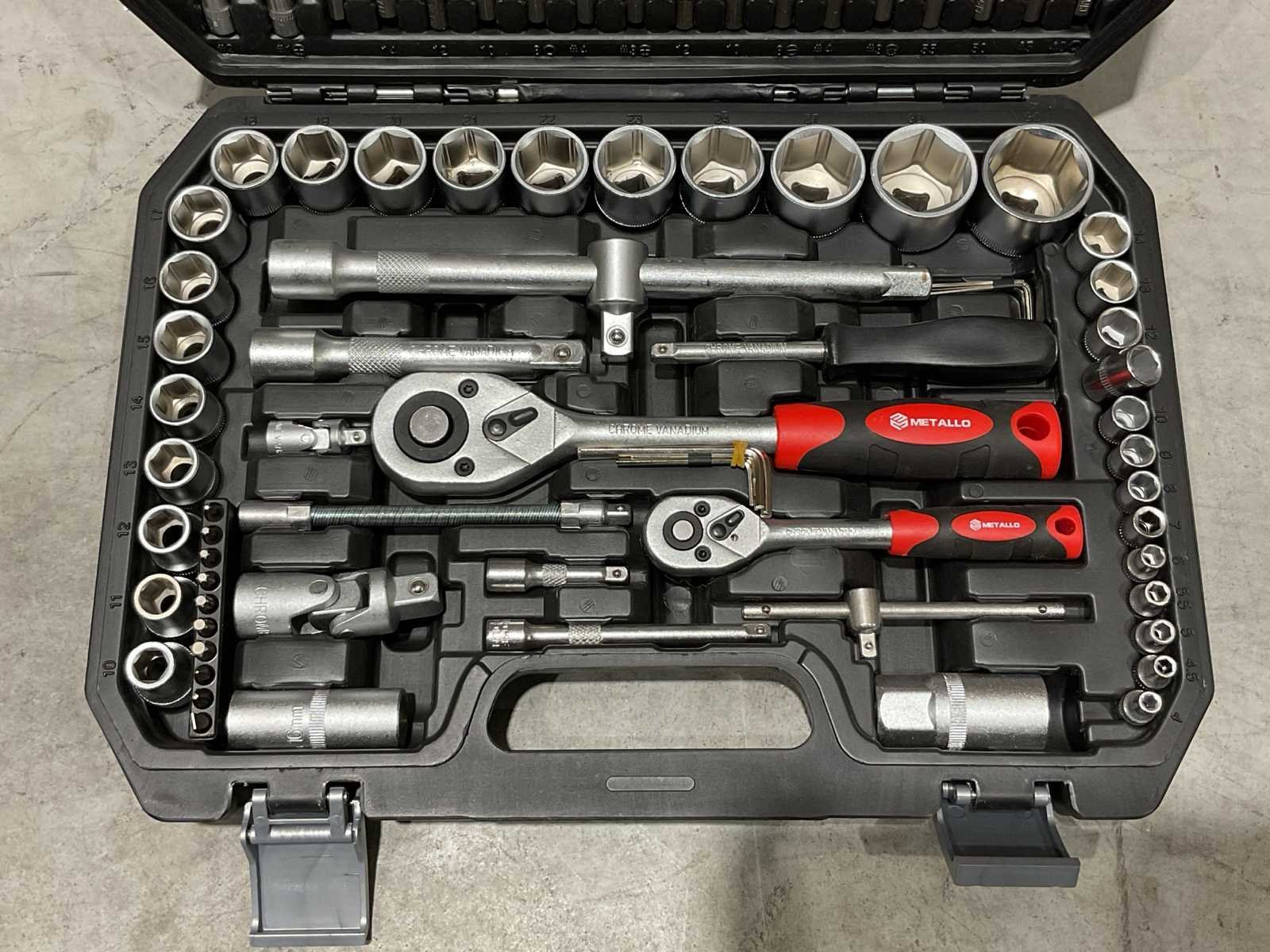 Voorzien van 13 x doppenset DR6PTREG maten 4-4,5-5-5,5-6-7-8-9-10-11-12-13-14; 8 1/4” DR6PT diepe doppen maten: 6-7-8-9-10-11-12-13; 3 x 1/4” DRBIT Doppen: FD 4-5,5-7; 2 x 1/4” DRBIT Doppen: PH1-PH2; 2 x 1/4” DRBIT doppen: PZ1-PZ2; 4 x 1/4” DRBIT Doppen: HW 3-4-5-6; 6 X 1/4” DRBIT Doppen: TX 8-10-15-20-25-30; 1 X 1/4” Doppenadapter; 1 x 1/4” DR Ratelsleutel; 2 x 1/4” DR verlengstuk 2”-4”; 1 x 1/4” verstelbare t sleutel; 1 x 1/4” DR universele koppeling; 1 x DR Spinnersleutel; 1 x DR Flexibele spinner sleutel; 18 x 1/2” DR6PTREG doppen: 10-11-12-13-14-15-16-17-18-19-20-21-22-23-24-27-30-32; 4 x 1/2” DR6PTDEEP doppen: 14-15-17-19; 2 x 1/2” DREXTENTION: 5-10’; 2 x 1/2” Bougie sleutel 16-21; 1 x 1/2” DR Universele koppeling; 1 x 1/2” DR 8 Hexagon bit koppeling; 1 x 3/8” Fx1/2”M 3weg adapter; 5 x inbussleutel 1,5-2-25 25-bits; kunststof koffer; Ongebruikt in doos Merk: Metallo Met koffer: true Delig: 106 Type: Meta-106W Bouwjaar: 2025