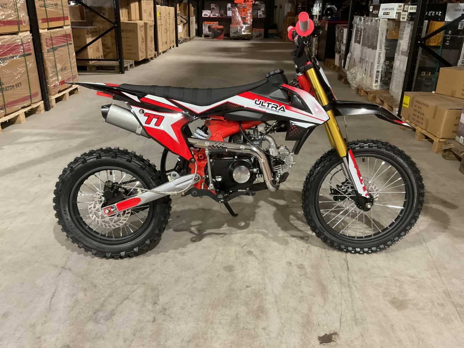 Voorzien van 125cc motor; 4 takt; 11 HP; hydraulische schijfremmen; bandenmaat voor 17” inch achter 14” inch; ongebruikt in doos (transport afmetingen 135x45x65 cm Gewicht 78kg) Merk: Ultra Motocross Model: DB003 Type: ILX 125cc RD Cilinderinhoud: 125cc Gewicht: 71kg Kleur: Rood Transmissie: Schakel Aantal sleutels: 2 Bouwjaar: 2025