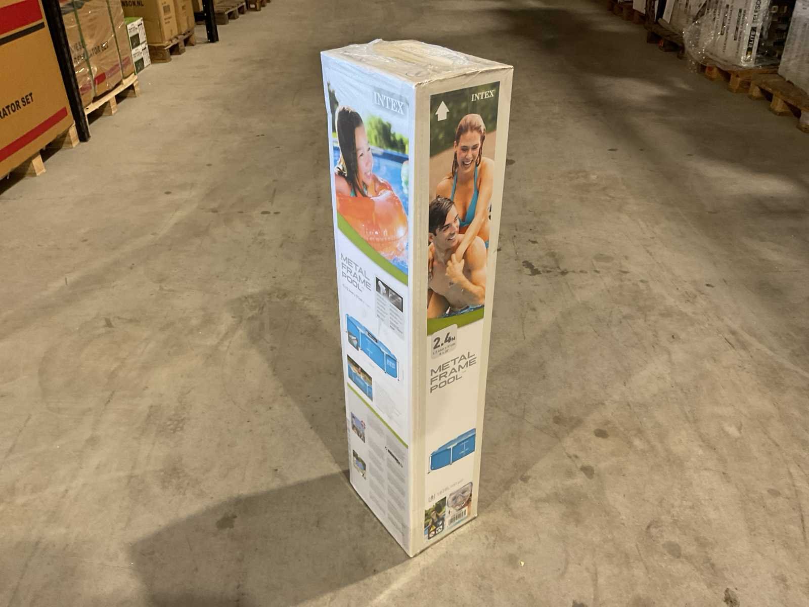 Voorzien van Opzetzwembad; 3-laags PVC met gerasterde polyester tussenlaag; Frame gepoedercoat staal; Vorm: Rond; Inhoud 1828 liter; Aanbevolen waterdiepte (cm) 38; Pompaansluiting (mm) 32; Buitenafmeting Diameter x Hoogte (cm) 244 x 51; Dikte liner wand (mm) 0,50; Dikte liner bodem (mm) 0,265; Reparatieset; Ongebruikt in doos Merk: INTEX Model: 28205NP Product type: 2,4m Kleur: Blauw Gewicht: 9.25kg Lengte: 25.4cm Breedte: 17.5cm Hoogte: 94.6cm Materiaal: Dubbelwandig PVC folie met gerasterde binnenlaag