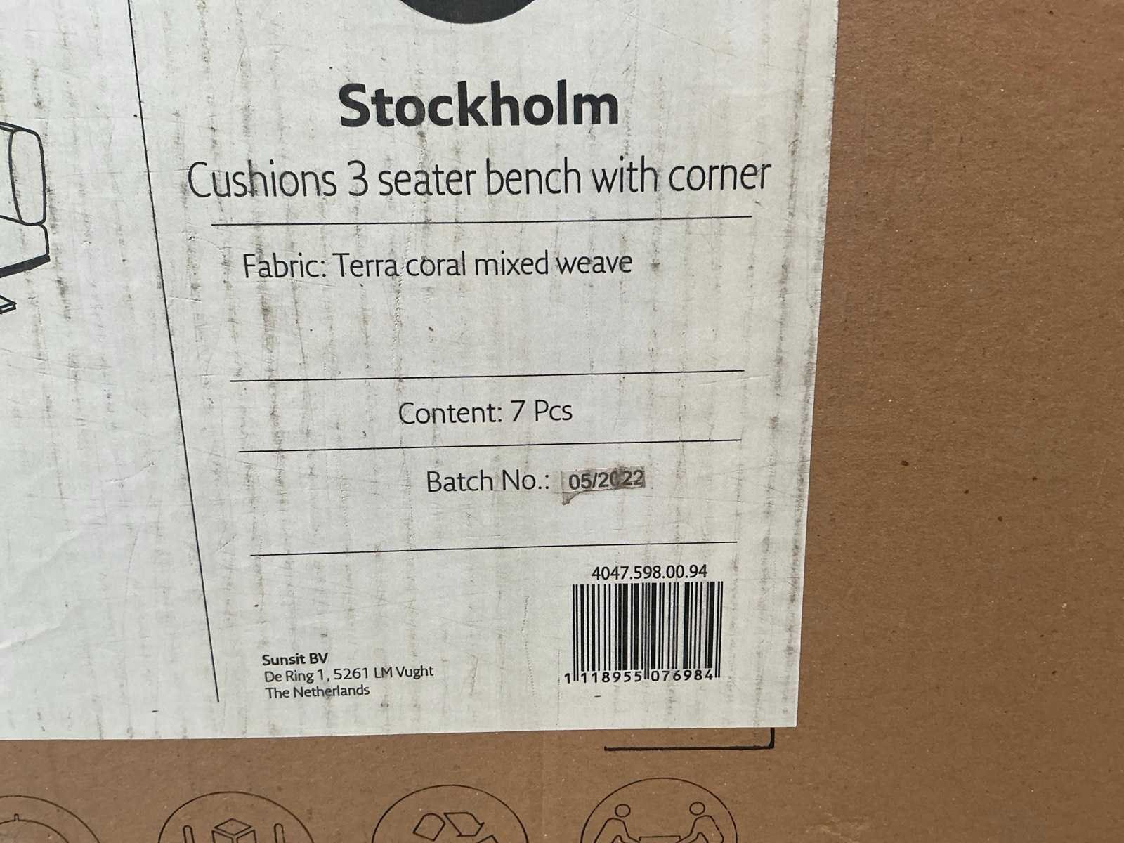 7 kussens bestaande uit: 3 zitkussen 3 rugkussen 1 hoekkussen LET OP: het gaat alleen om de kussens. Merk: Suns Model: Stockholm Kleur: Terra coral