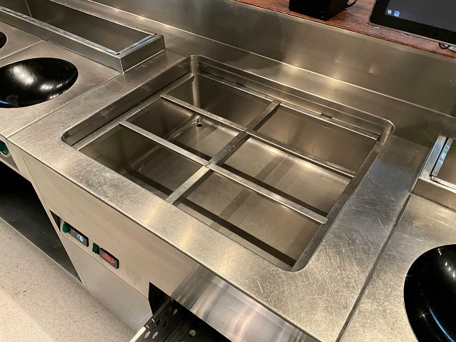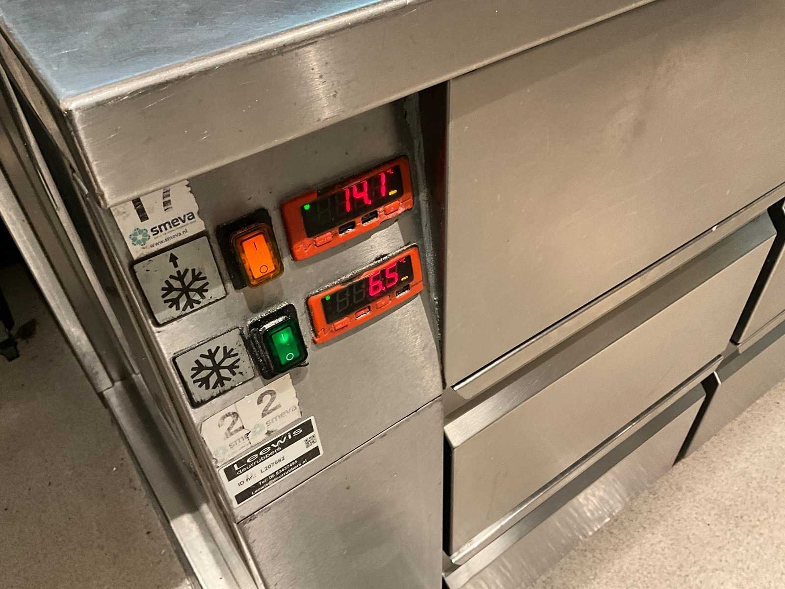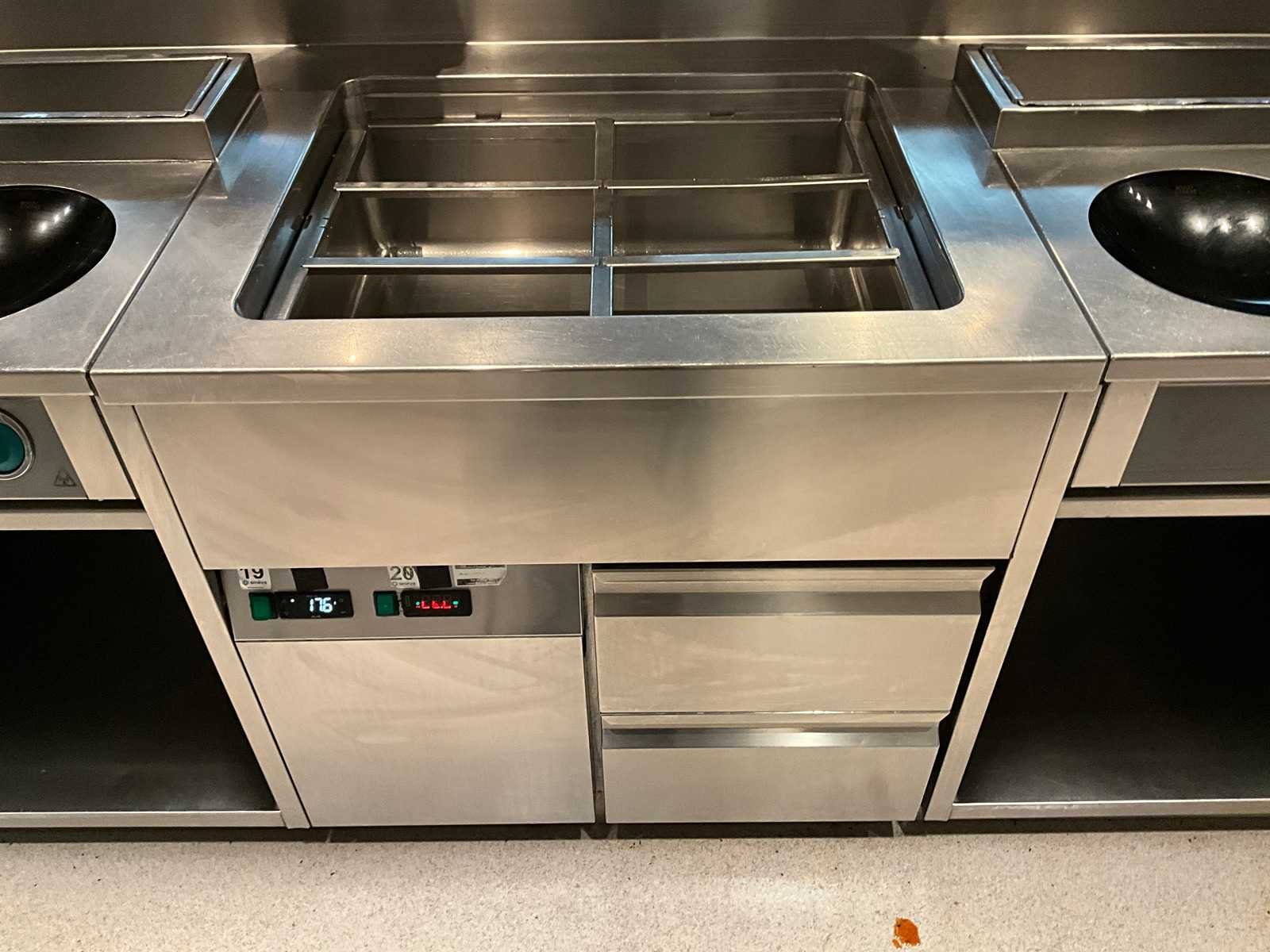 Koelwerkbanklijn met saladettes en gekoelde lades. LET OP! Pastakokers, inductiewokken en bakplaten behoren NIET tot de kavel. LET OP! Deze kavel maakt onderdeel uit van een combinatie kavel (kavelnummer 13) deze kavel blijft onder gunning totdat de combinatie kavel gesloten is. LET OP! Kavel betreft een apparaat wat aangesloten is op een centraal koelsysteem. Kavel heeft geen eigen koelcompressor. Het centrale koelsysteem is reeds professioneel leeg gepompt. Hiervoor zijn additionele kosten van toepassing. De koper is zelf verantwoordelijk voor het professioneel demonteren van de kavel. Kavel kan aangesloten zijn op het elektra-, water- en/of gasleidingnetwerk. Bekabeling en/of leidingen dienen netjes afgedopt en ordelijk achter gelaten te worden. Schade aan het pand of andere zaken zal op de koper worden verhaald. Wij adviseren u gebruik te maken van de kijkdag om een plan voor demontage op te stellen. Merk: AKE-Ideal Totale afmeting L: 1165cm Totale afmeting Breedte: 75cm Totale afmeting Hoogte: 105cm Digitale uitlezing: true Rvs: true Aantal laden: 10pcs Breedte: 75cm Hoogte: 105cm