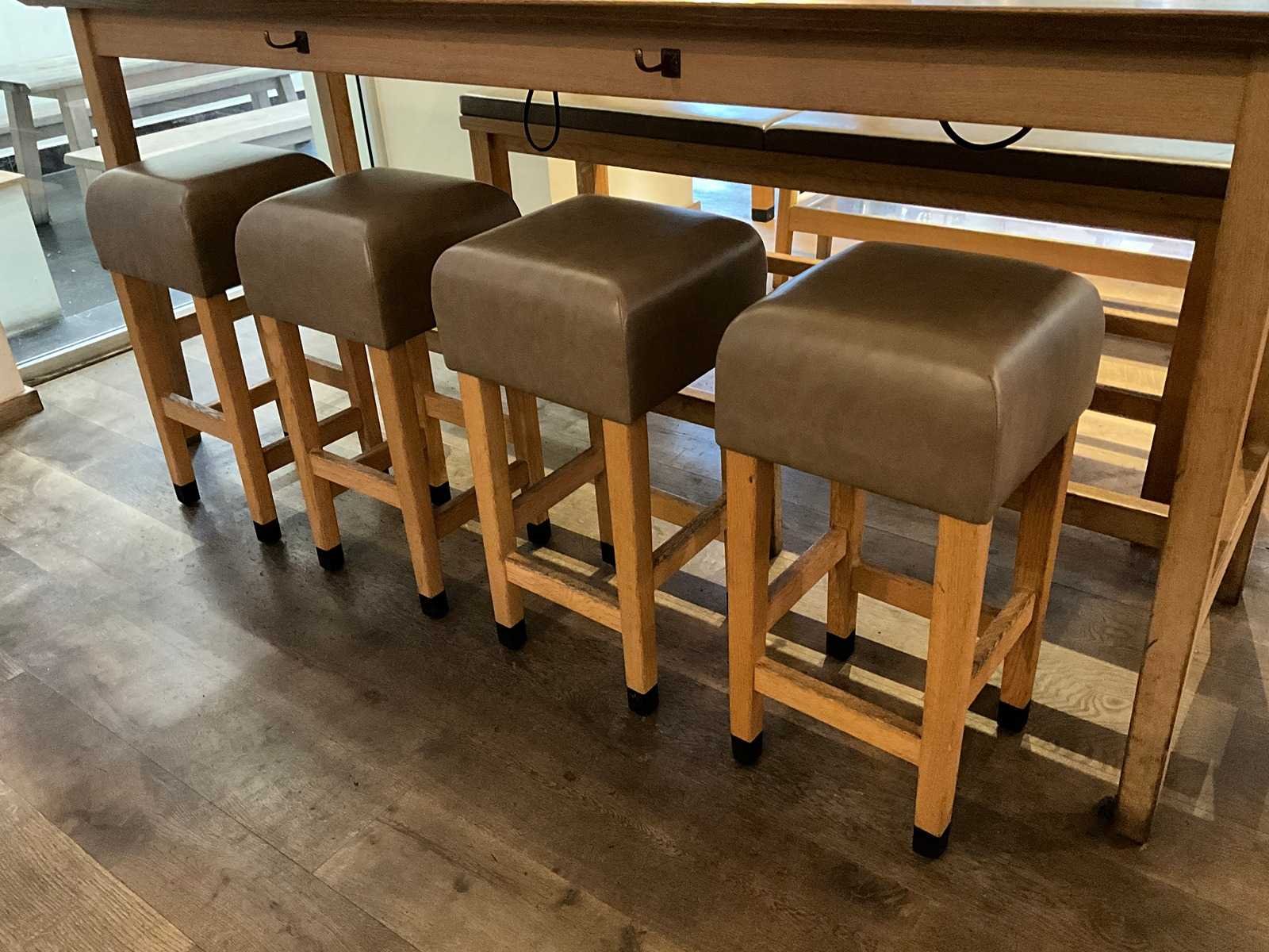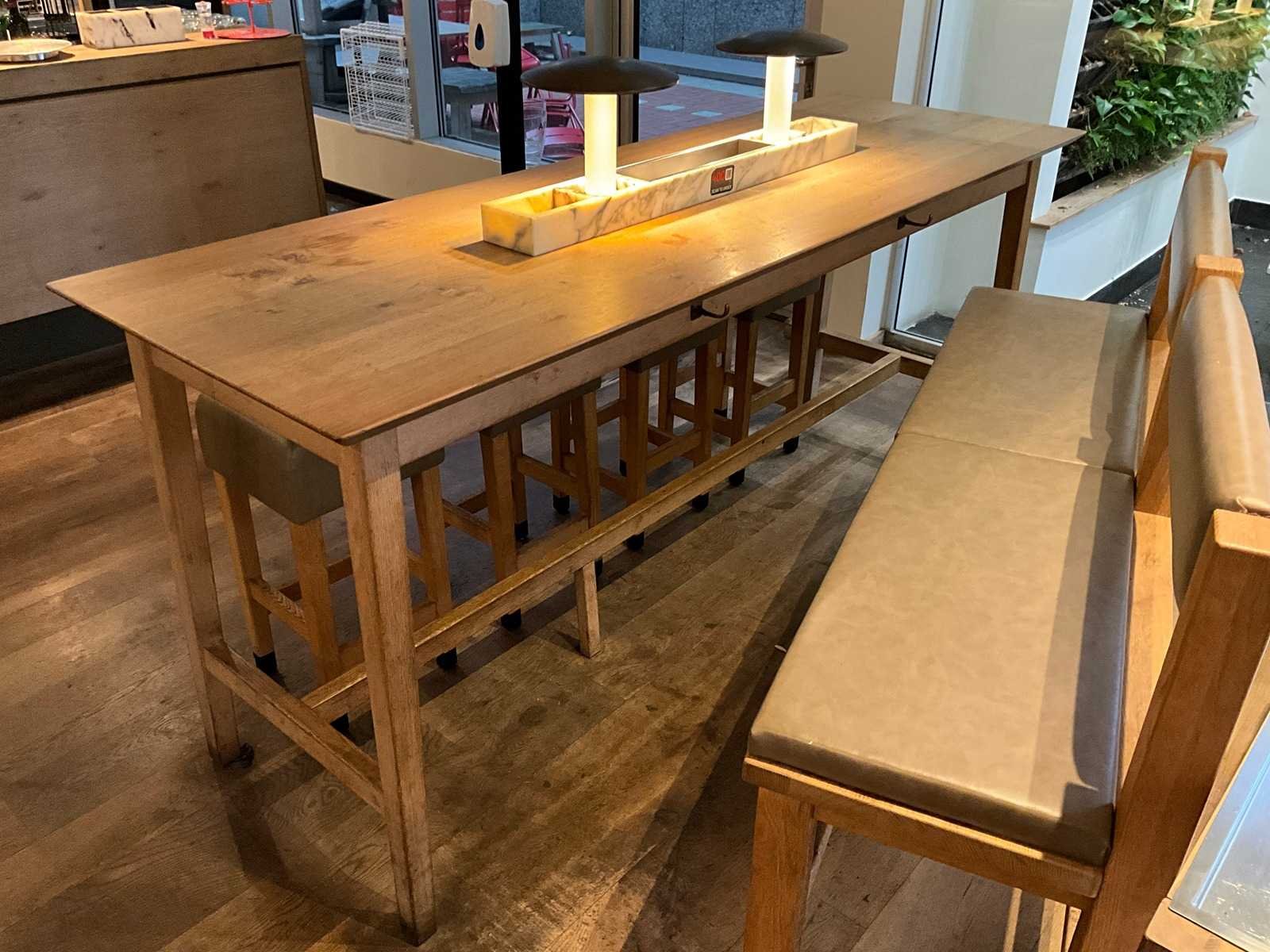 Bartafel met marmeren opbouw en verlichting. Afmeting bank 180x50x112 cm. Zithoogte 75 cm. Afmeting krukken 37x37x75 cm. De tafel is reeds ontkoppeld van de vloer en elektra. Hiervoor zijn de additionele kosten van toepassing. Merk: Hutten Totale afmeting L: 2400mm Totale afmeting Breedte: 800mm Totale afmeting Hoogte: 1050mm Hout: true