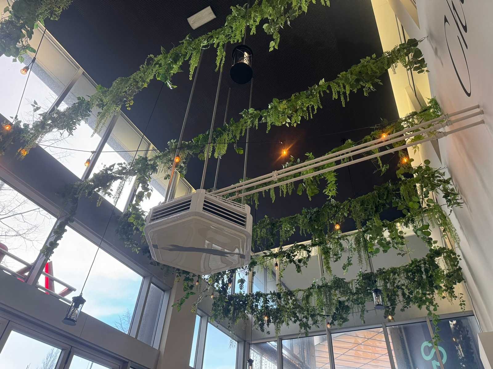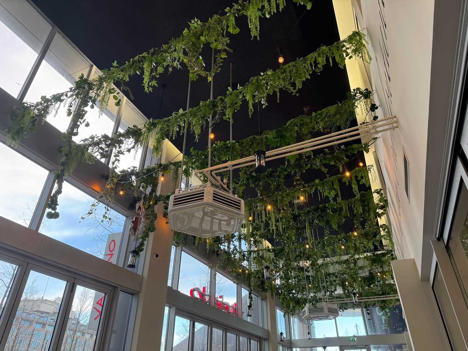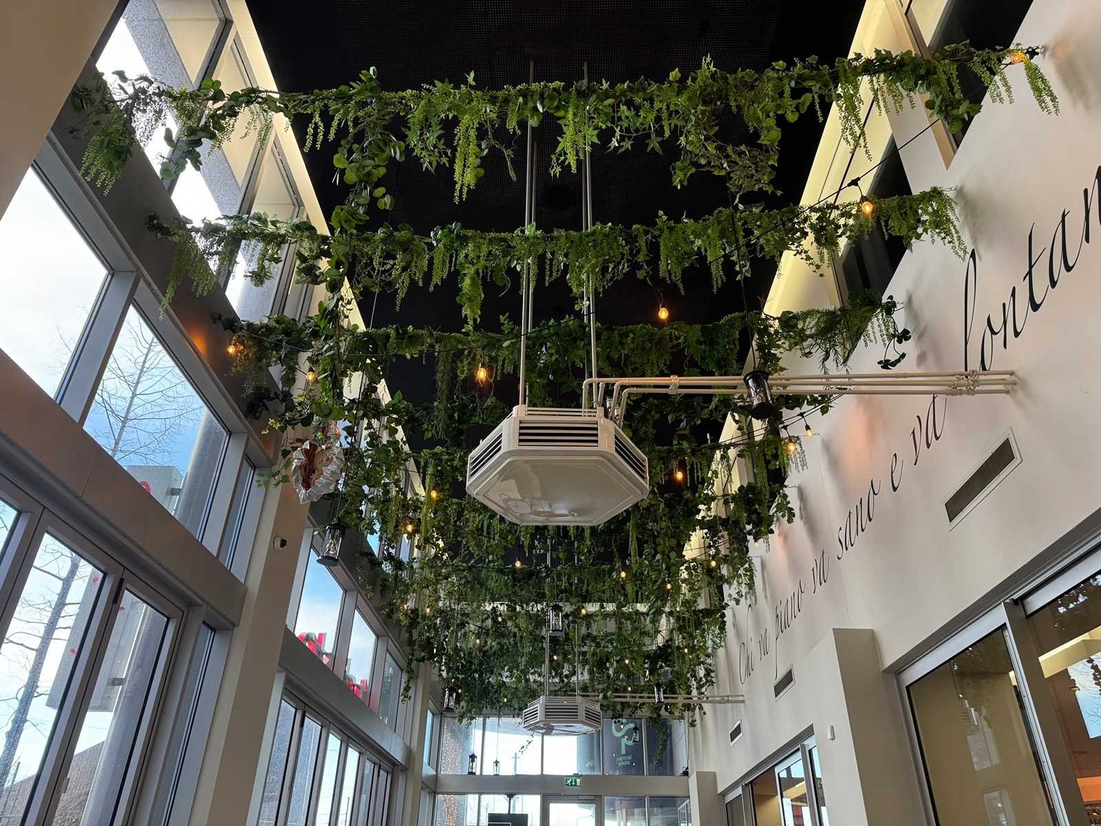Circa 4,7 m breed. De decoratie hangt op circa 4 meter hoog.
