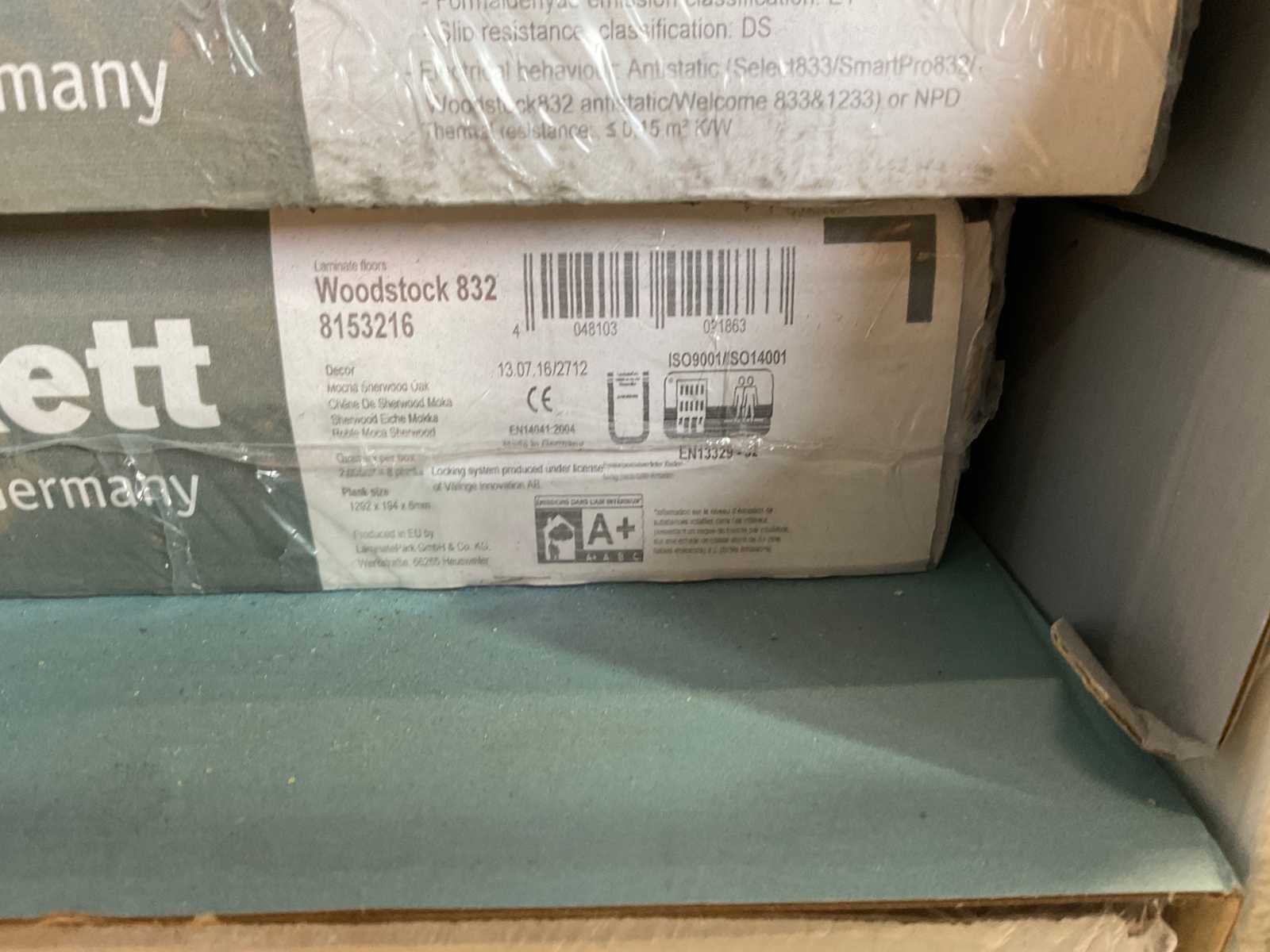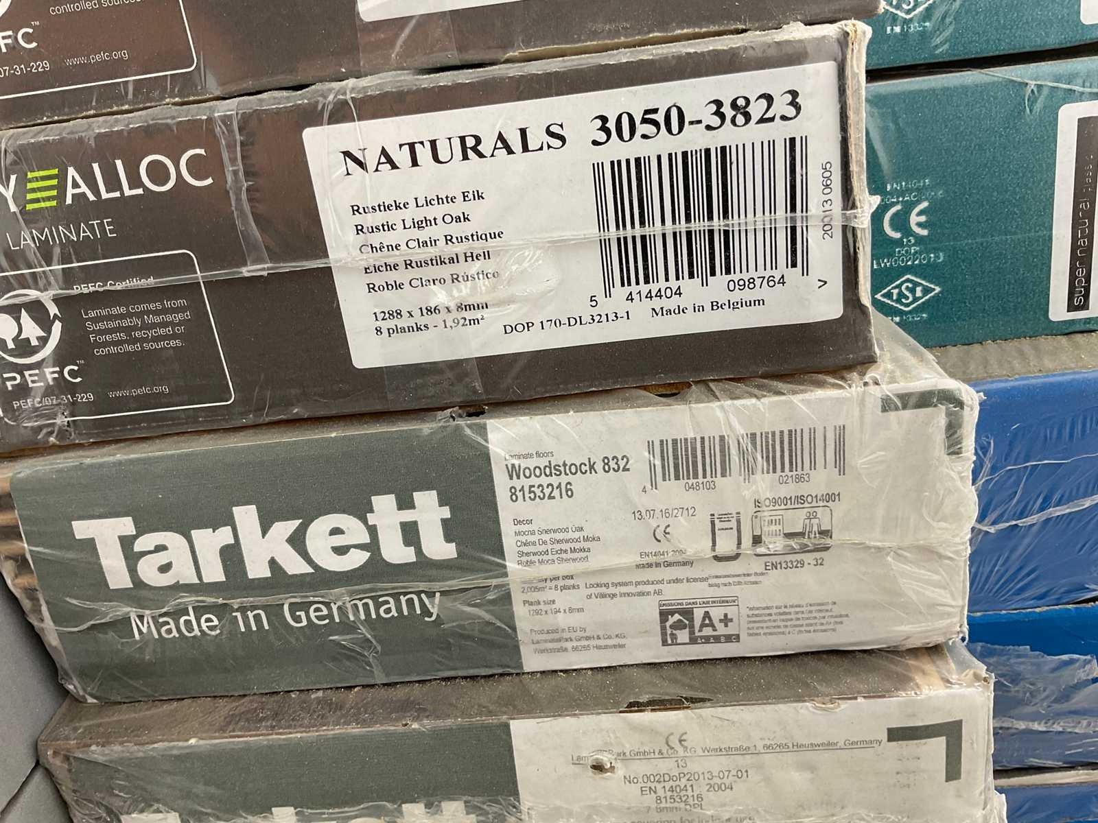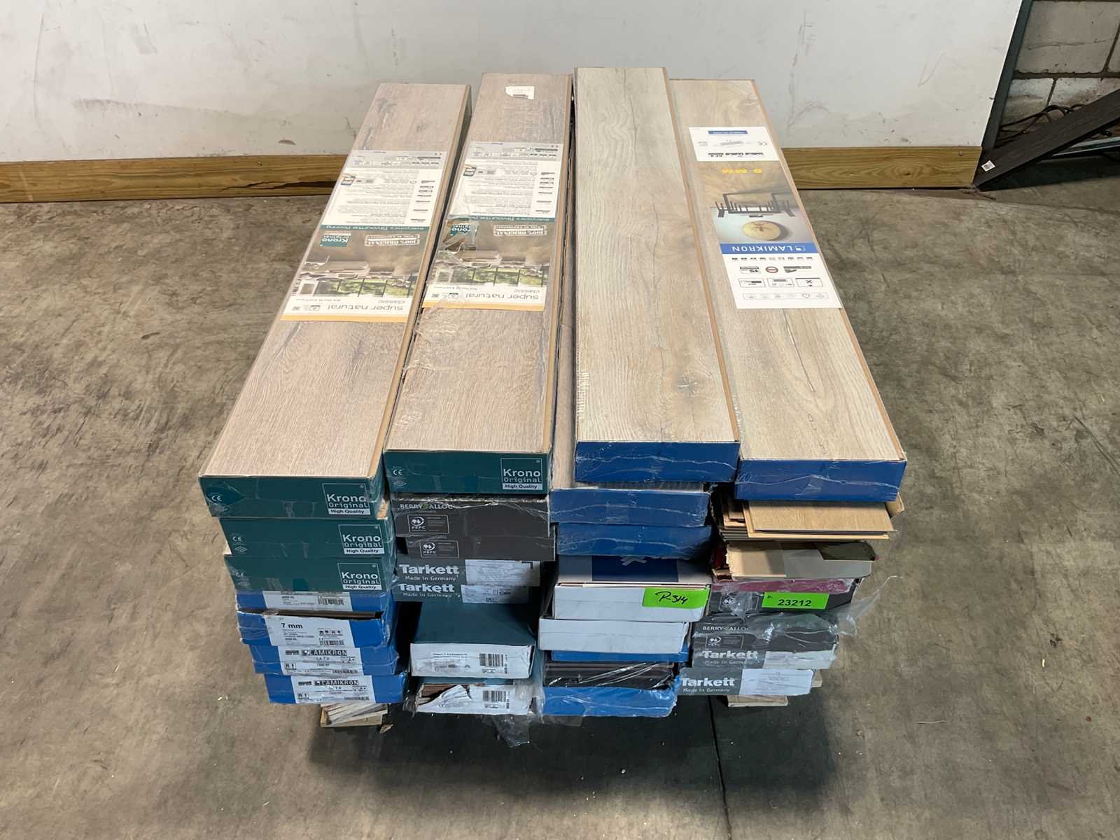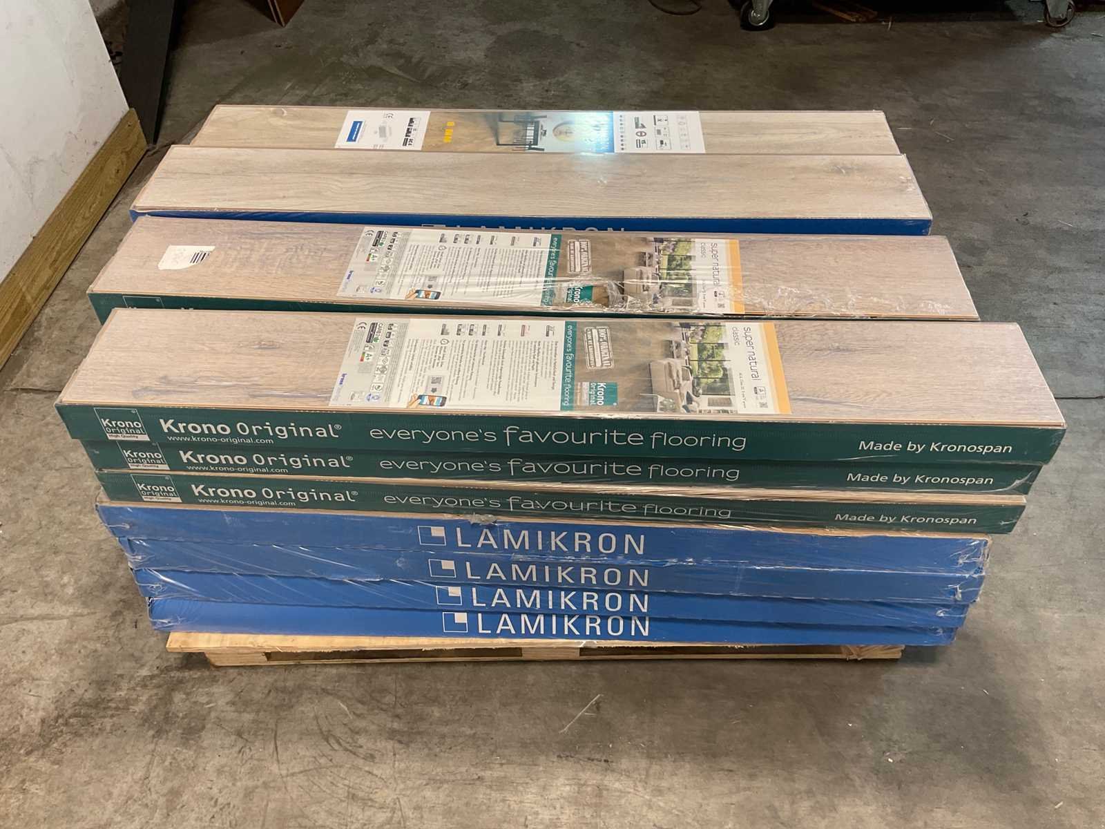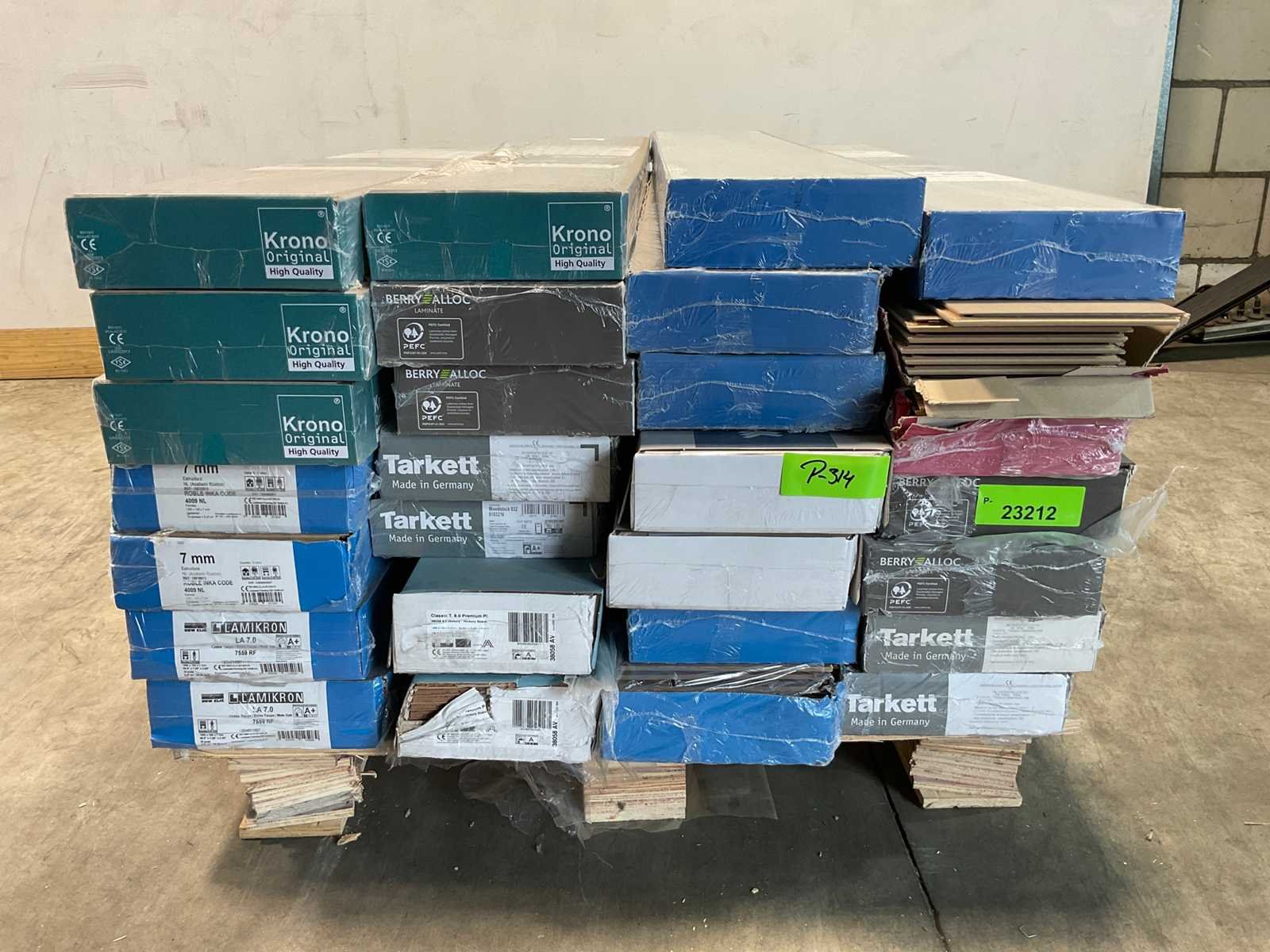 Mixpallet met diverse soorten laminaat – ongeveer 28 pakken, goed voor circa 62m². Bekijk de foto’s voor specificaties en details.
