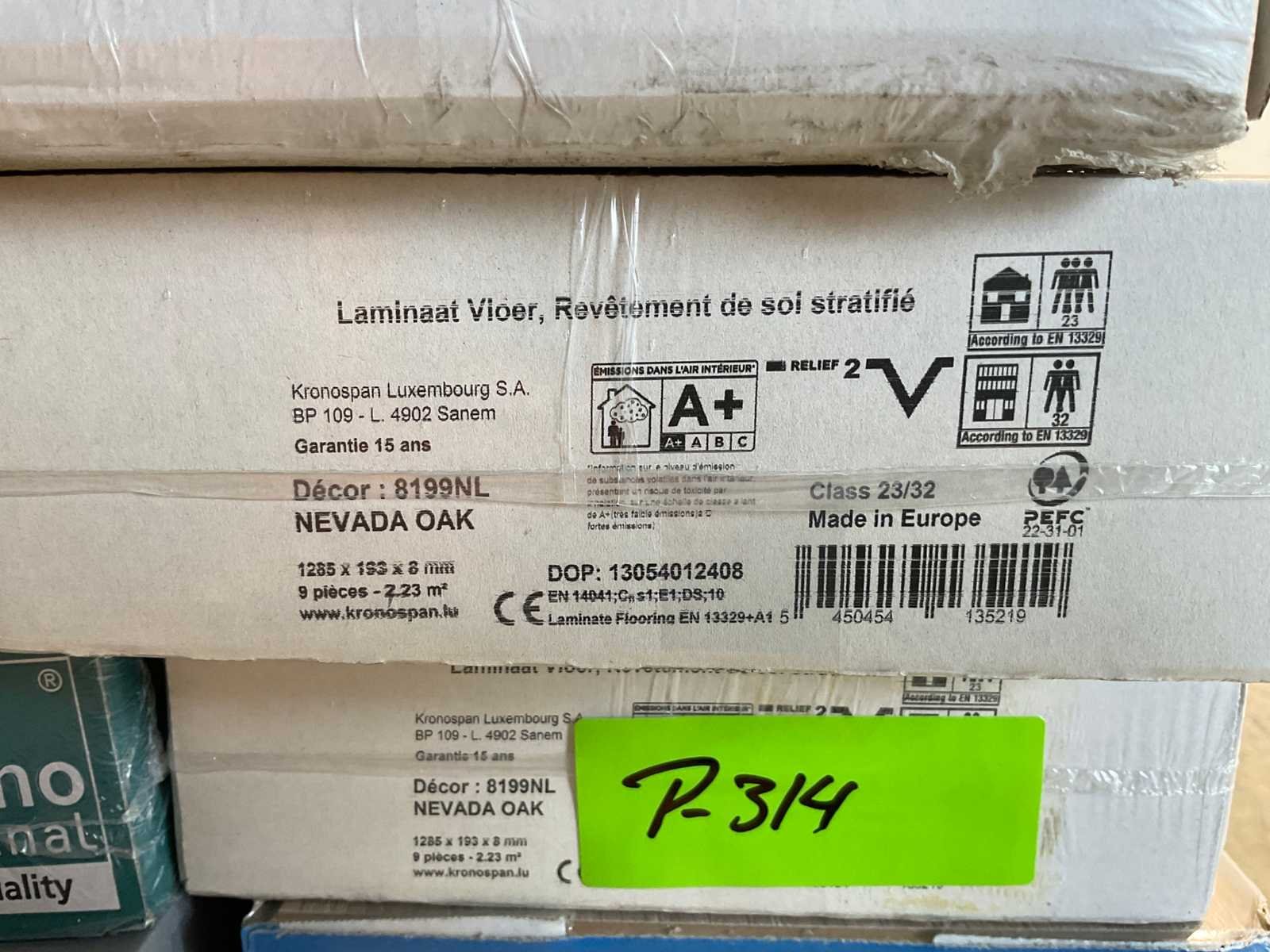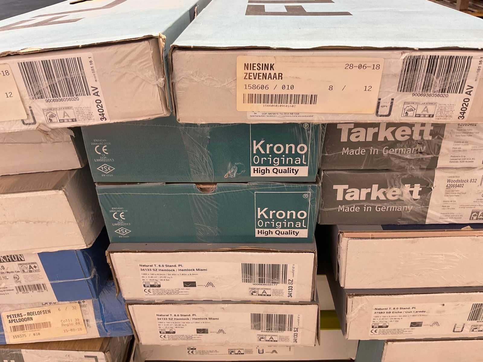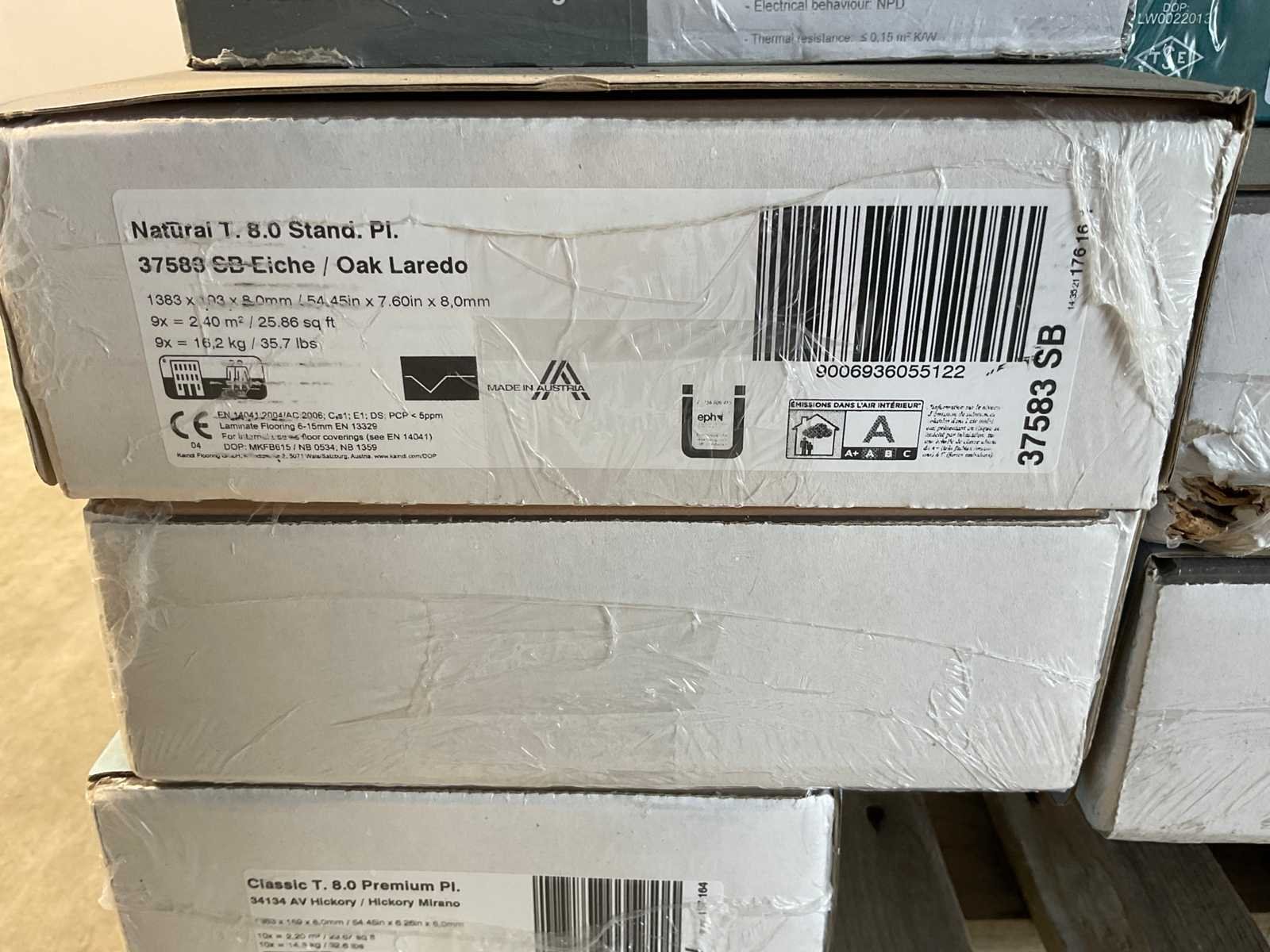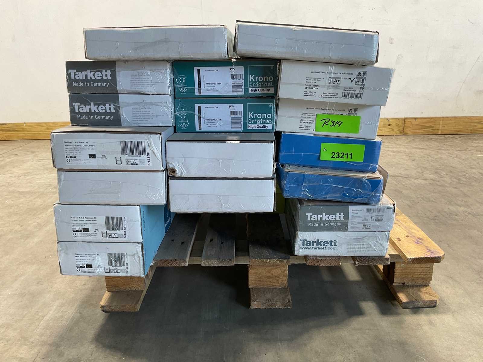 Mixpallet met diverse soorten laminaat – ongeveer 20 pakken, goed voor circa 45m². Bekijk de foto’s voor specificaties en details.