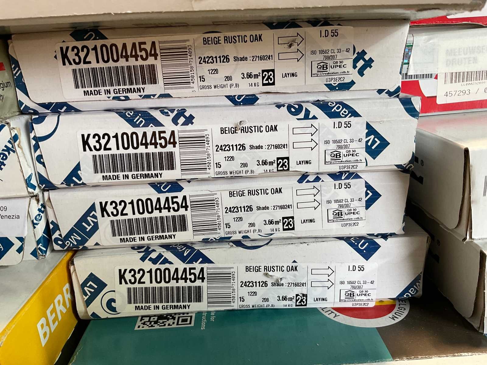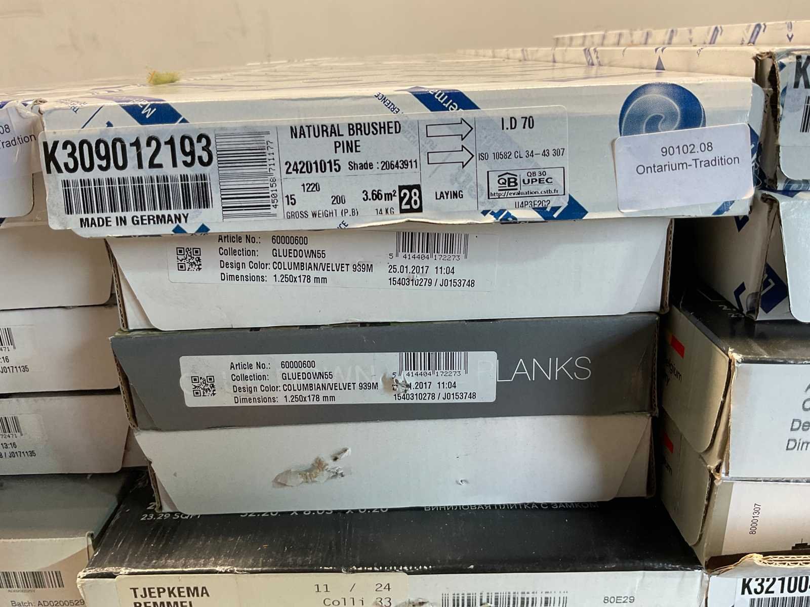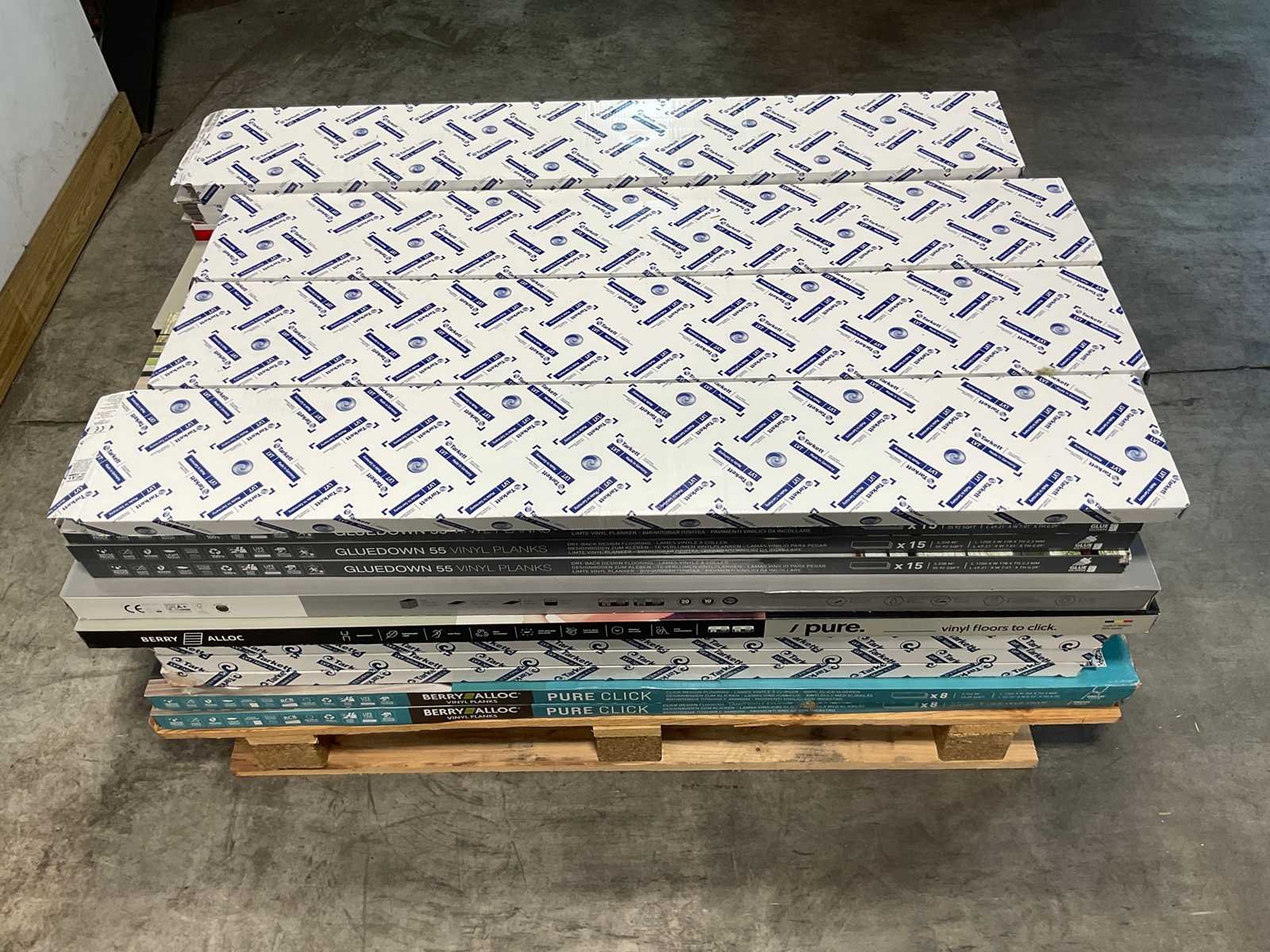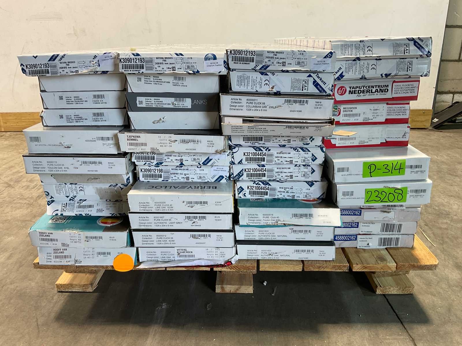 Mixpallet met diverse soorten laminaat – ongeveer 44 pakken, goed voor circa 96m². Bekijk de foto’s voor specificaties en details.
