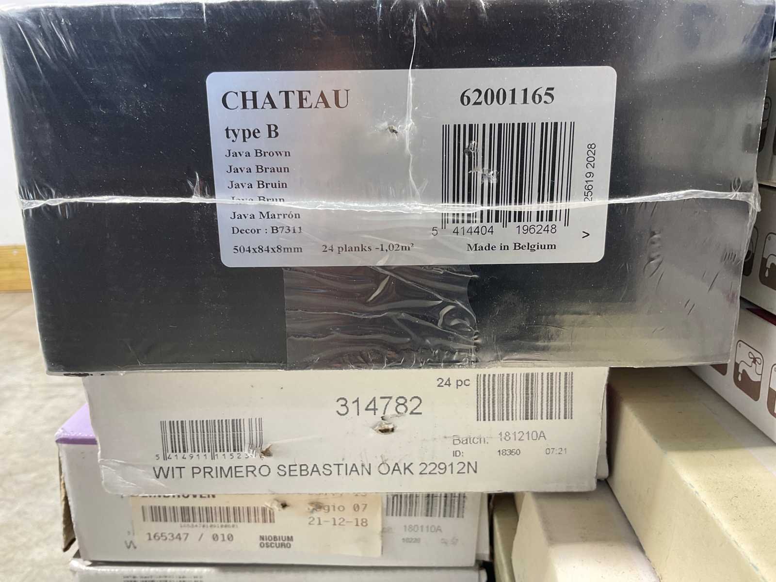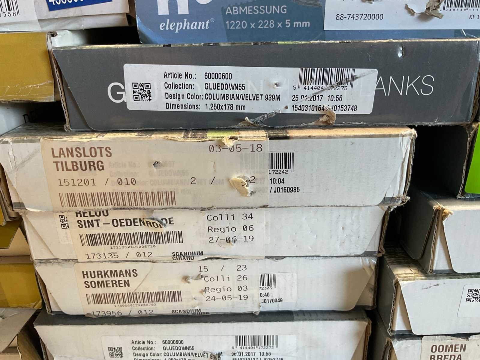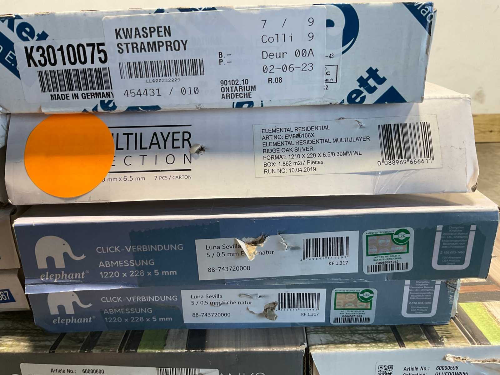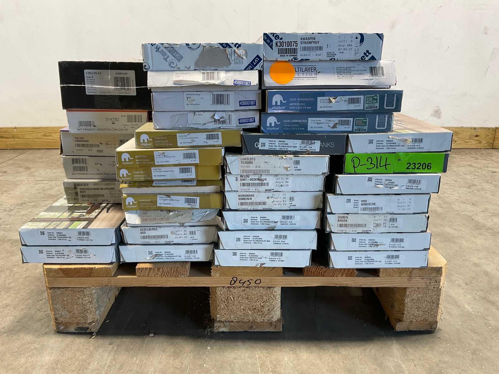 Mixpallet met diverse soorten laminaat – ongeveer 37 pakken, goed voor circa 82m². Bekijk de foto’s voor specificaties en details.