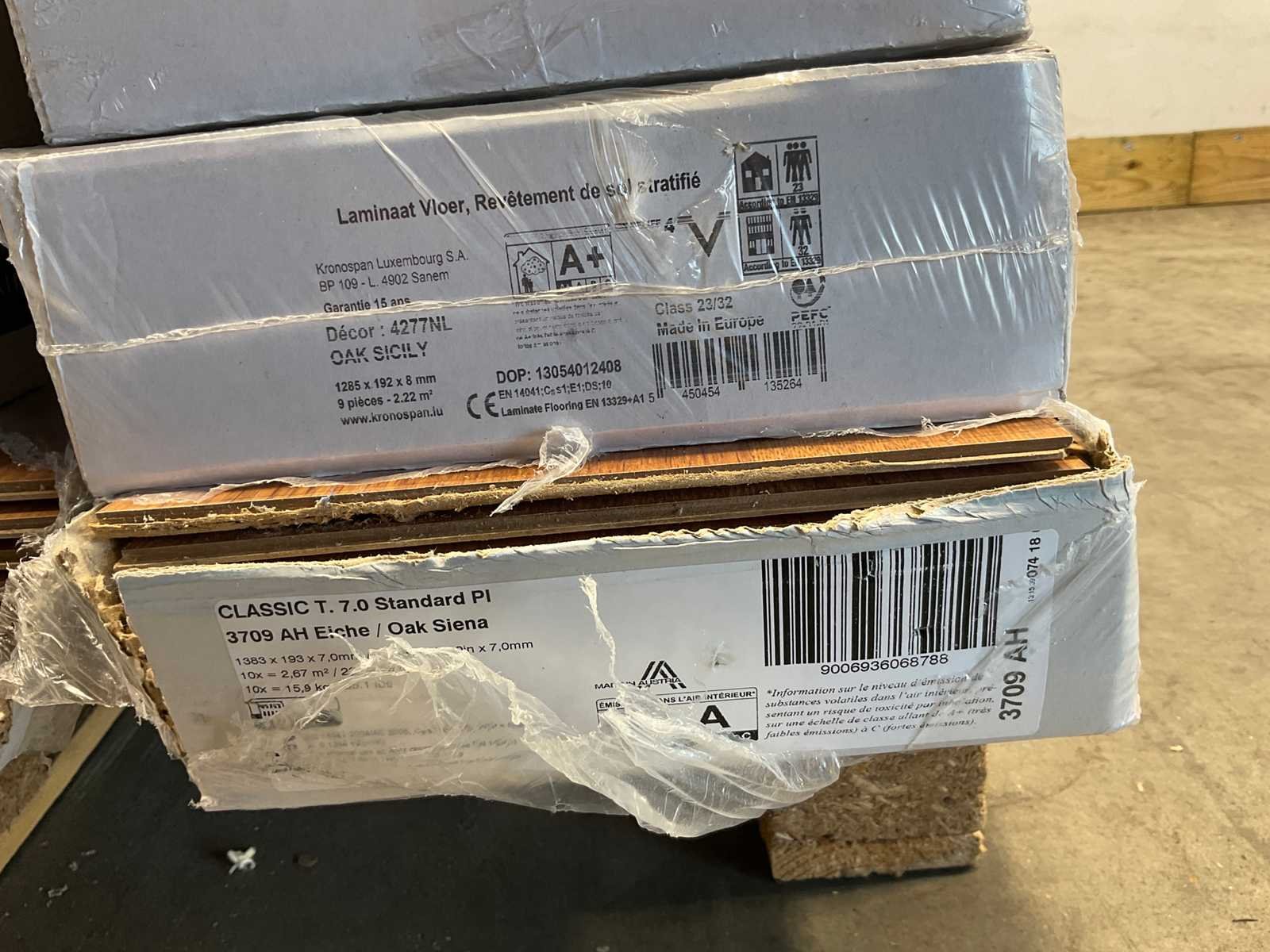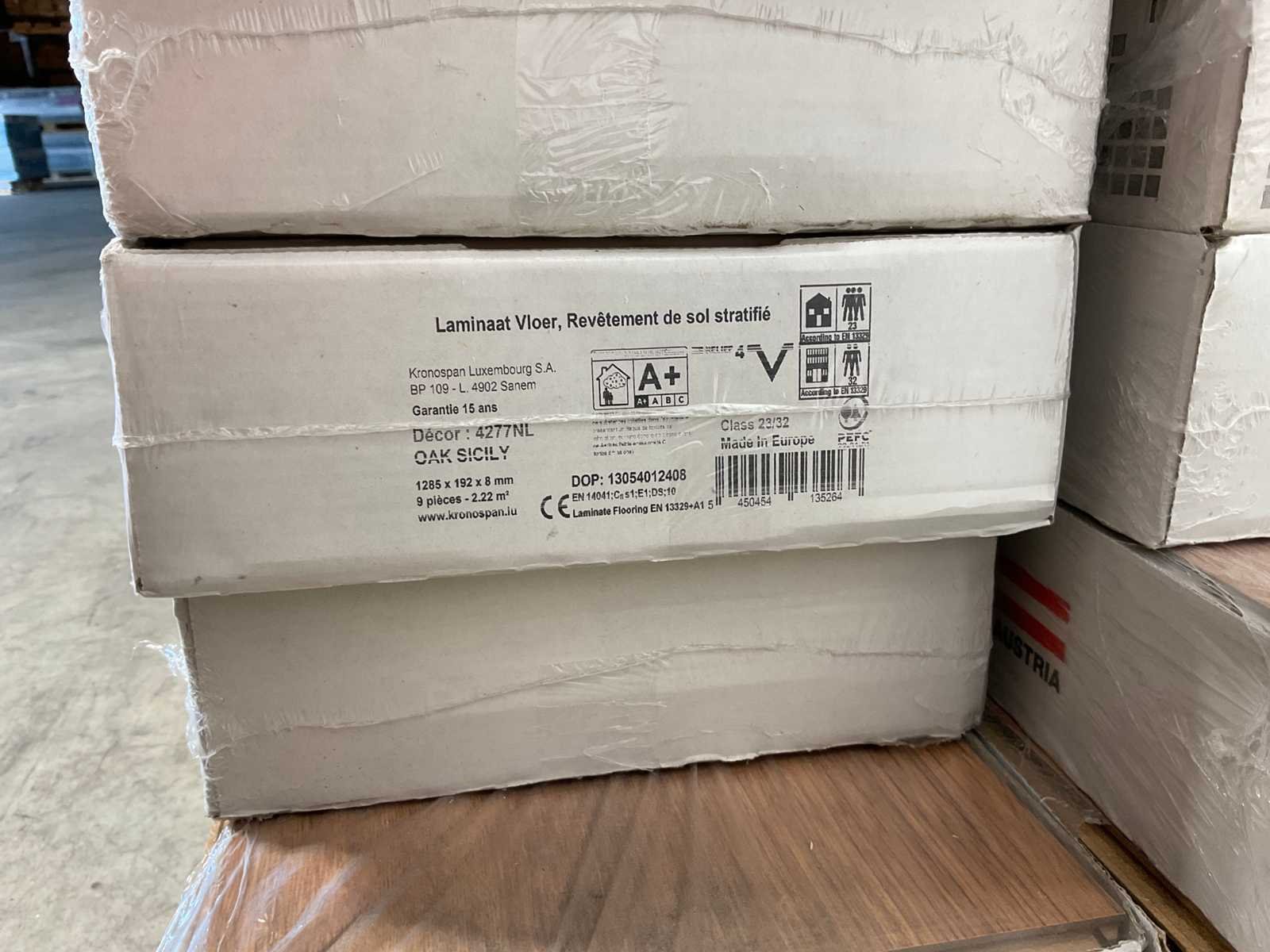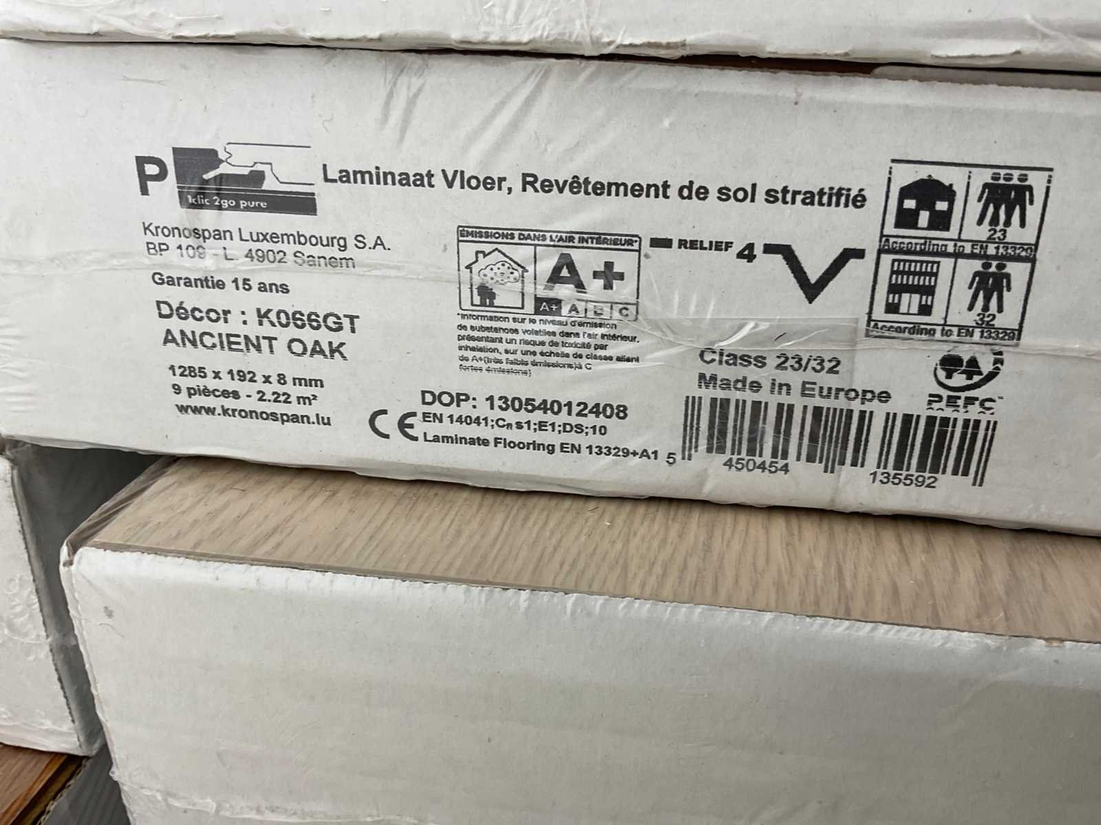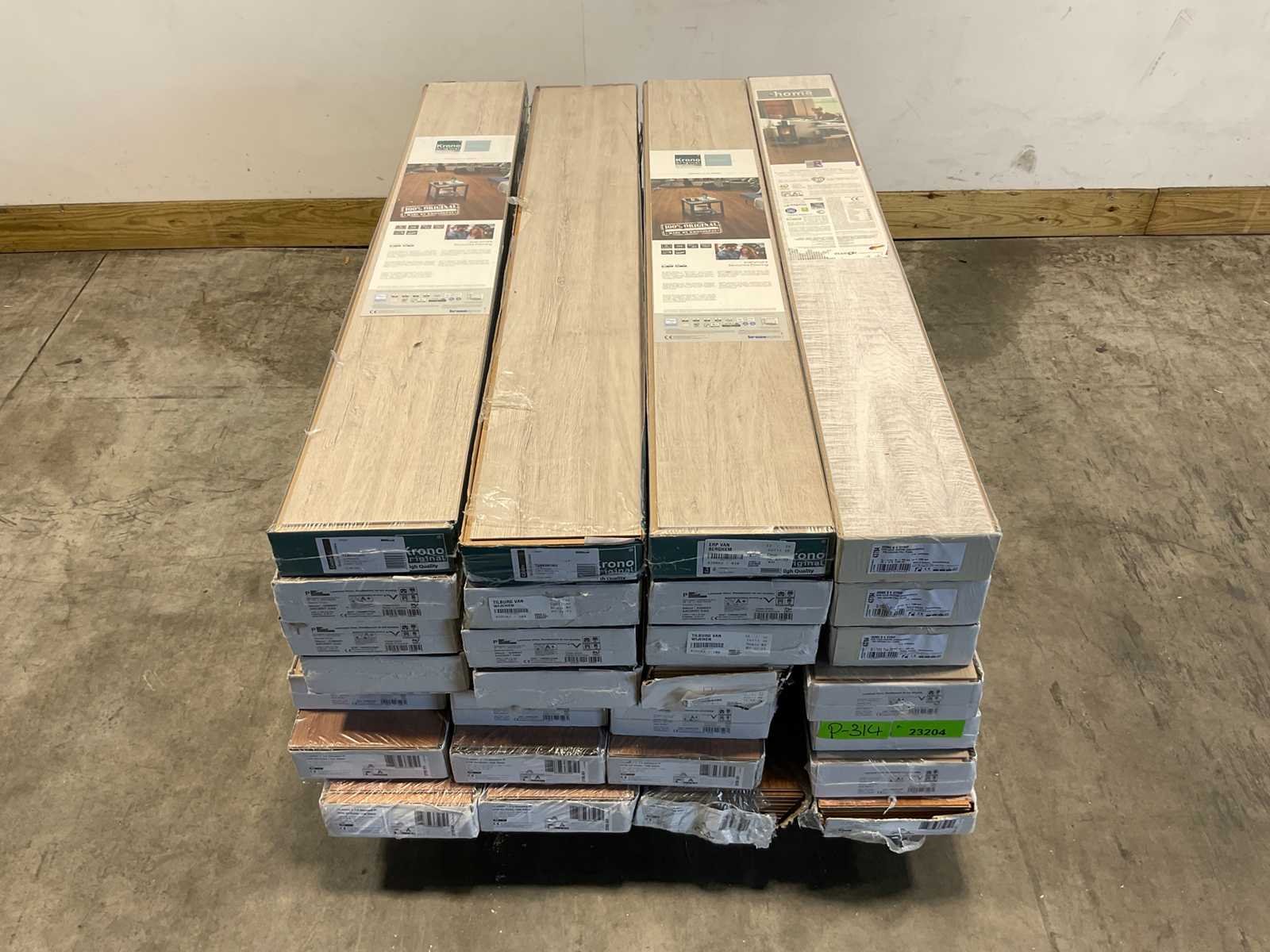 Mixpallet met diverse soorten laminaat – ongeveer 28 pakken, goed voor circa 62m². Bekijk de foto’s voor specificaties en details.