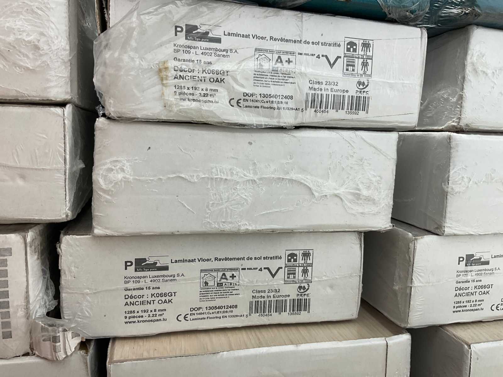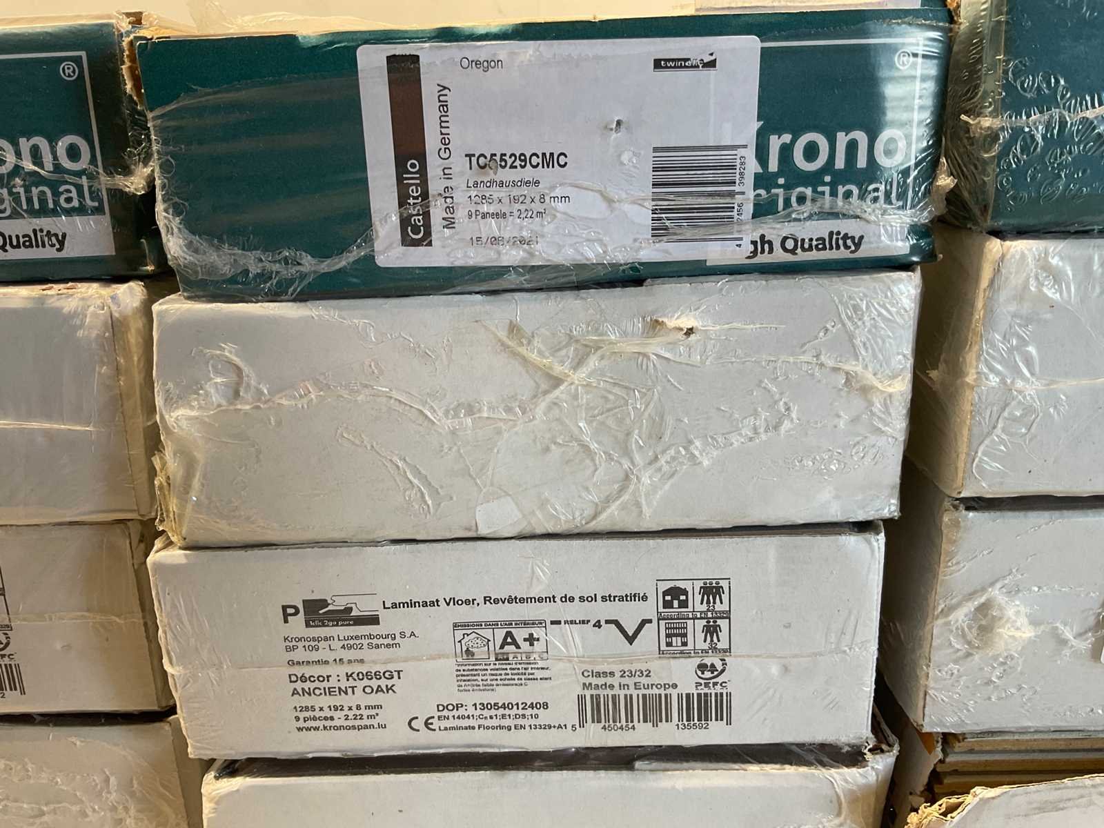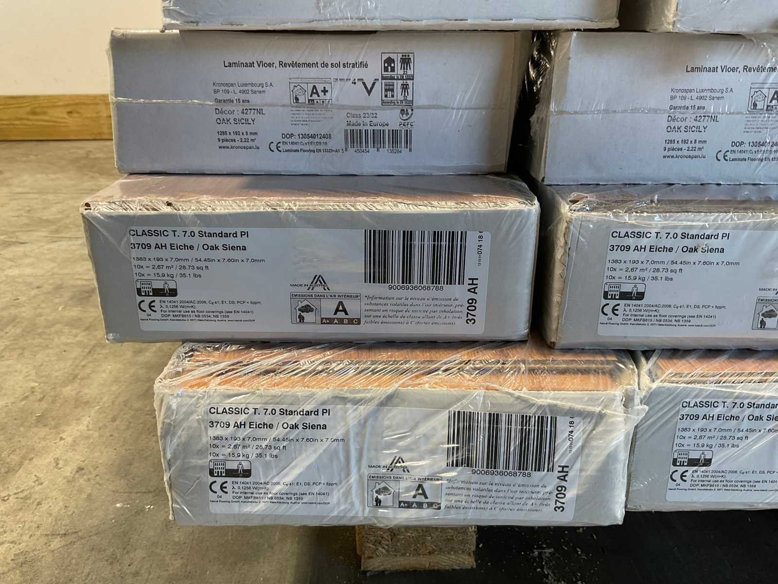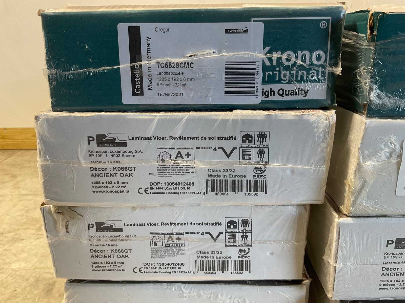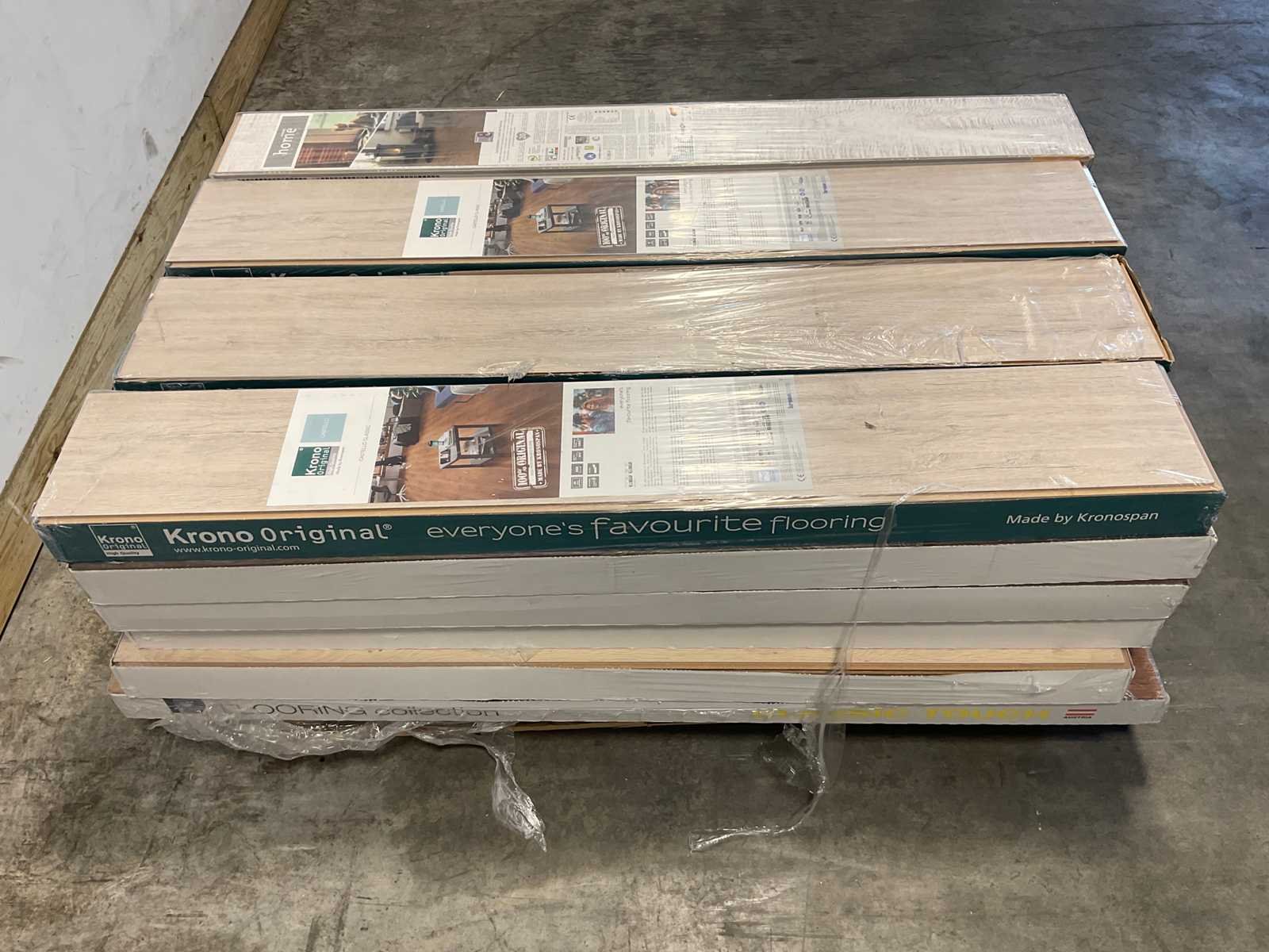 Mixpallet met diverse soorten laminaat – ongeveer 28 pakken, goed voor circa 62m². Bekijk de foto’s voor specificaties en details.