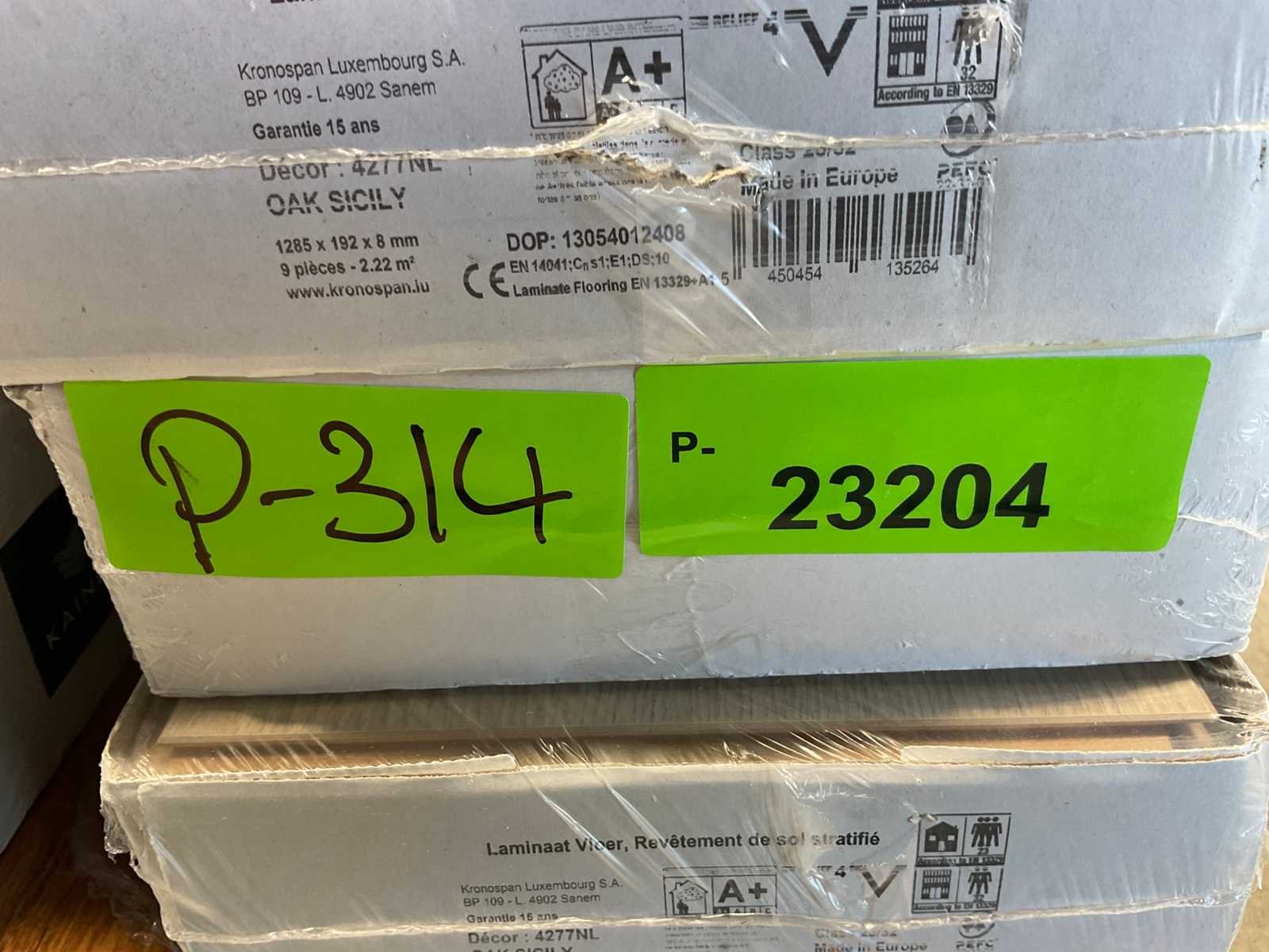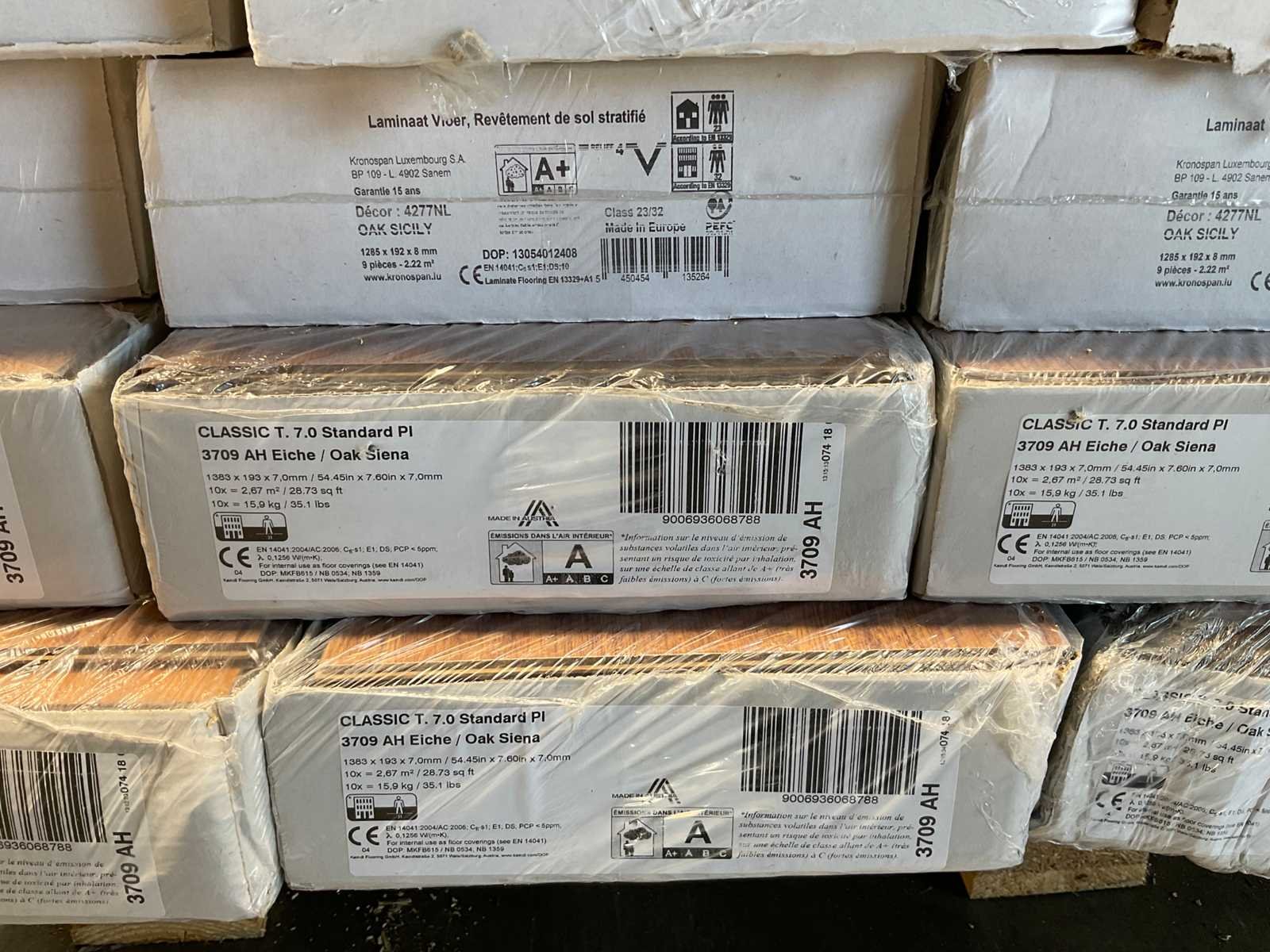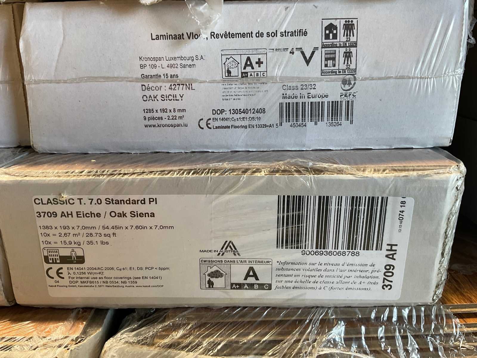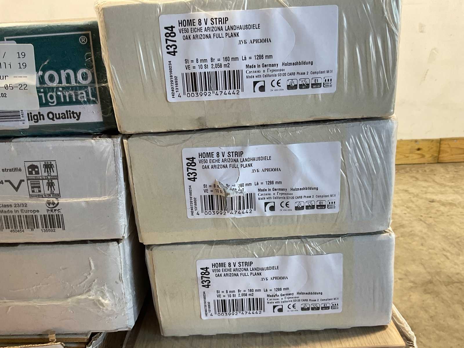 Mixpallet met diverse soorten laminaat – ongeveer 28 pakken, goed voor circa 62m². Bekijk de foto’s voor specificaties en details.