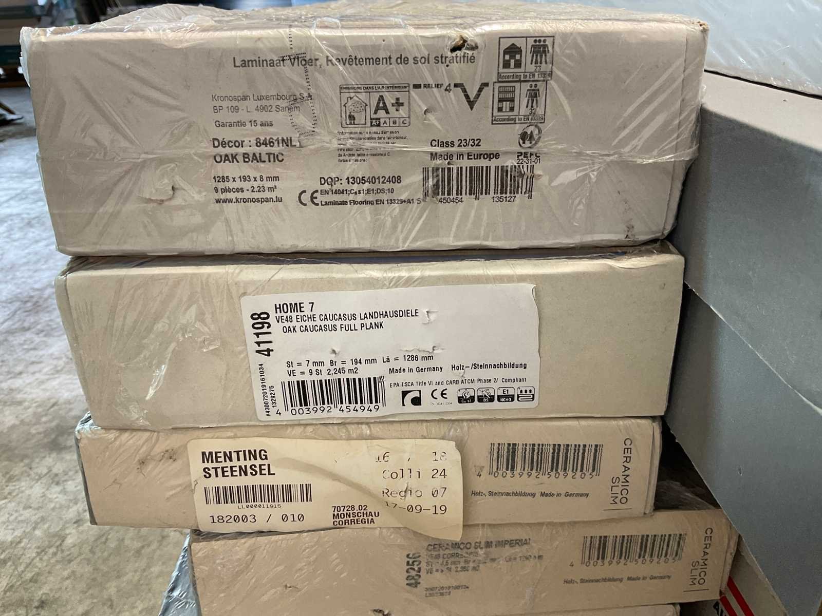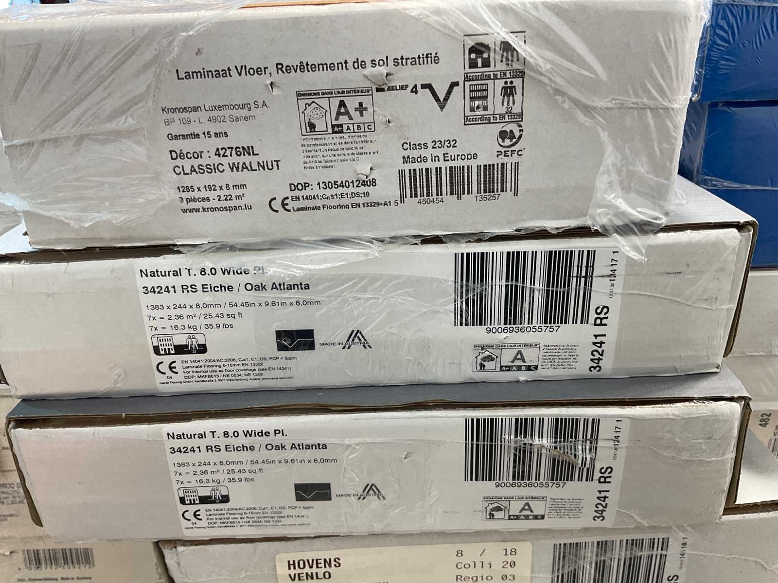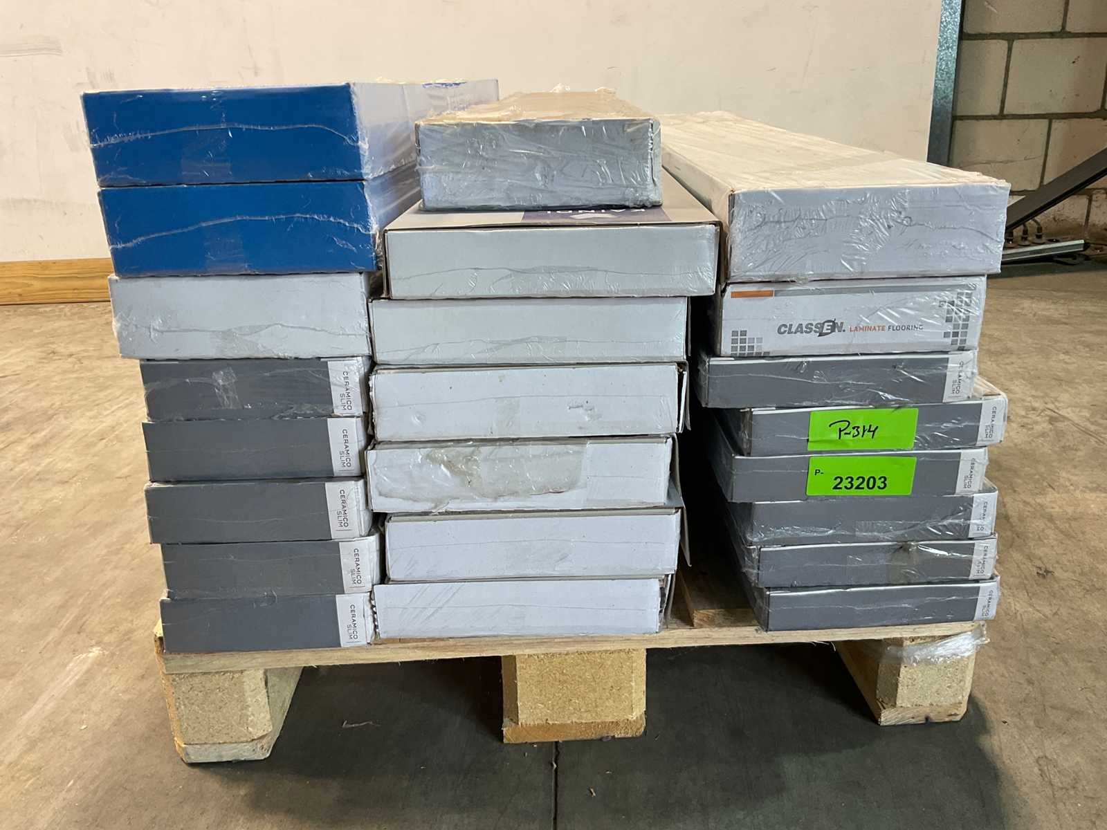 Mixpallet met diverse soorten laminaat – ongeveer 23 pakken, goed voor circa 51m². Bekijk de foto’s voor specificaties en details.