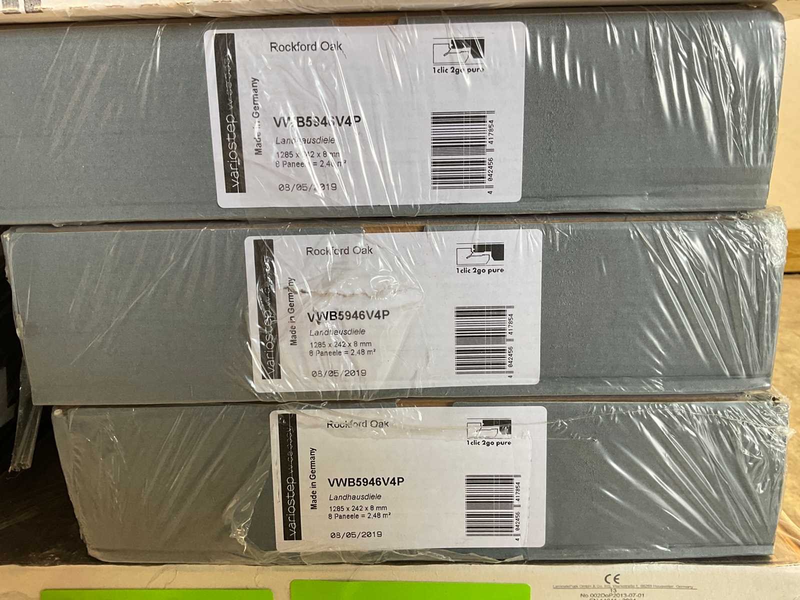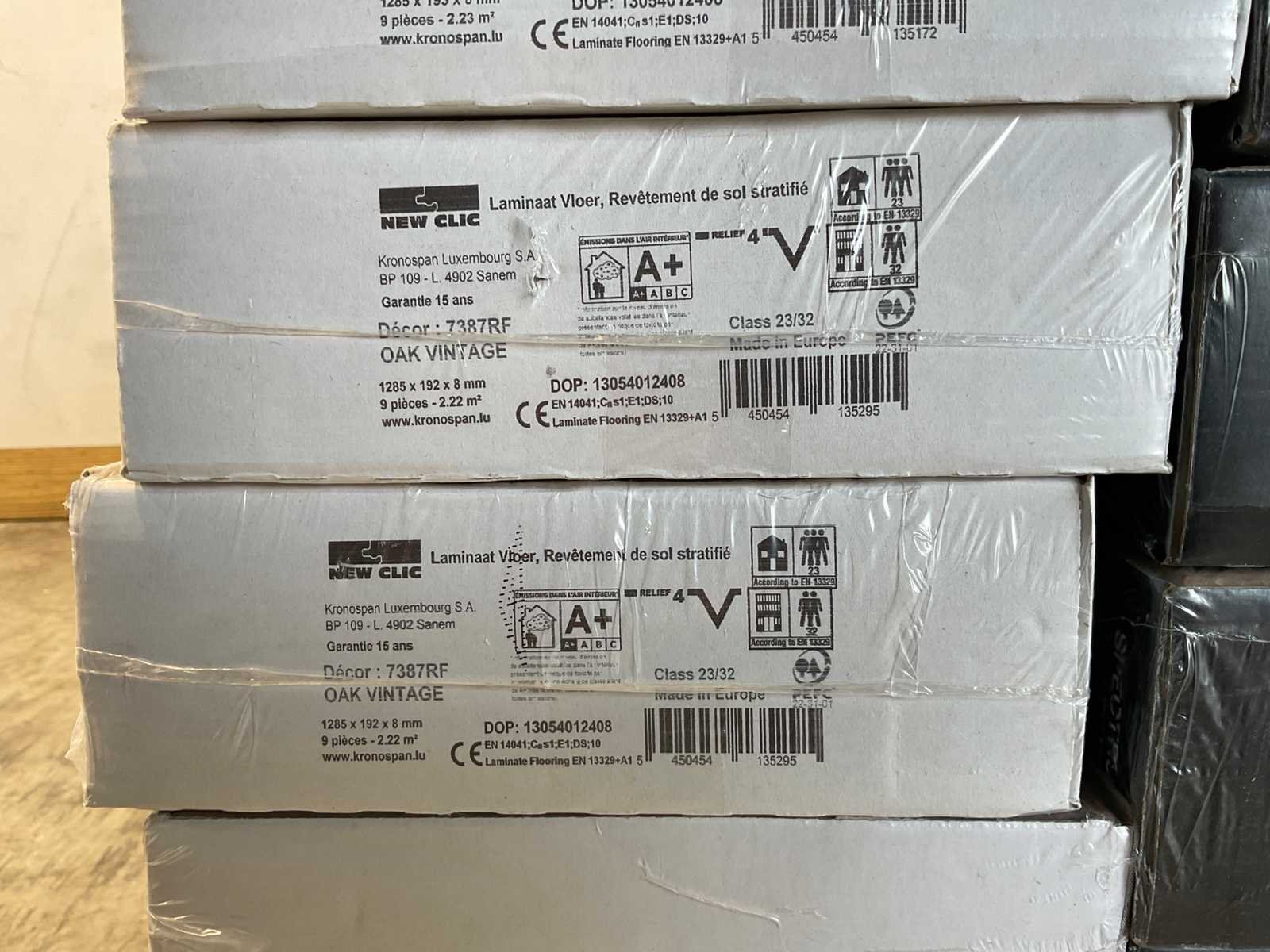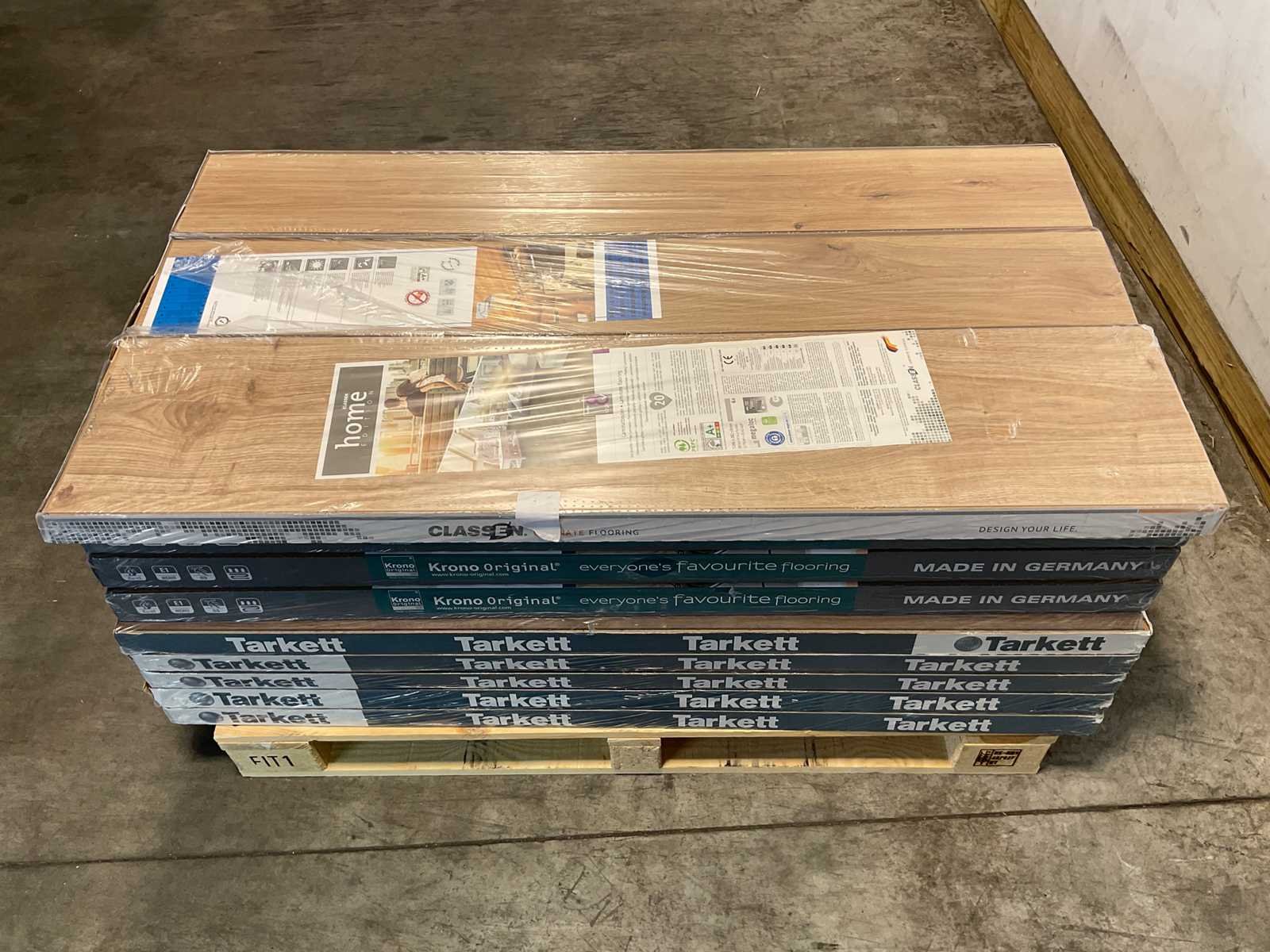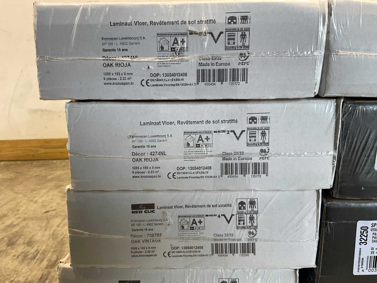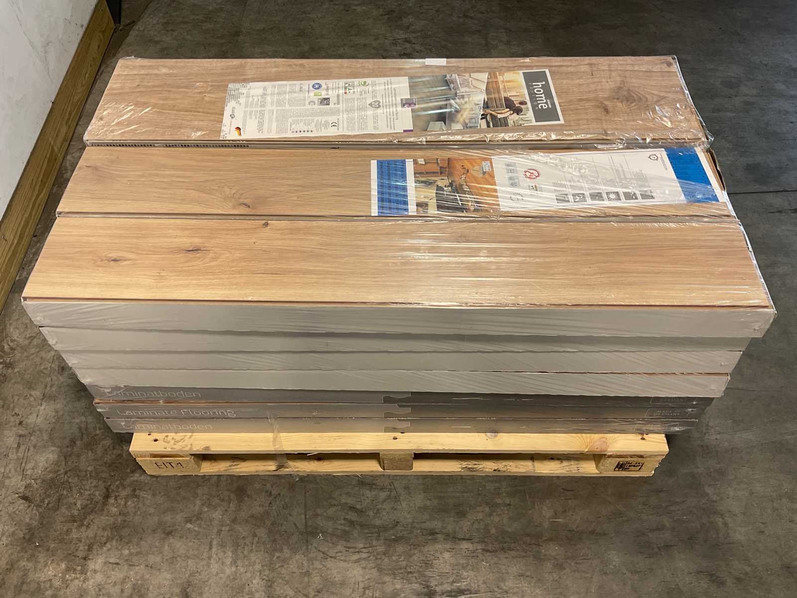 Mixpallet met diverse soorten laminaat – ongeveer 22 pakken, goed voor circa 48 m². Bekijk de foto’s voor specificaties en details.