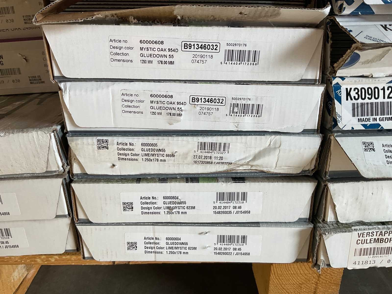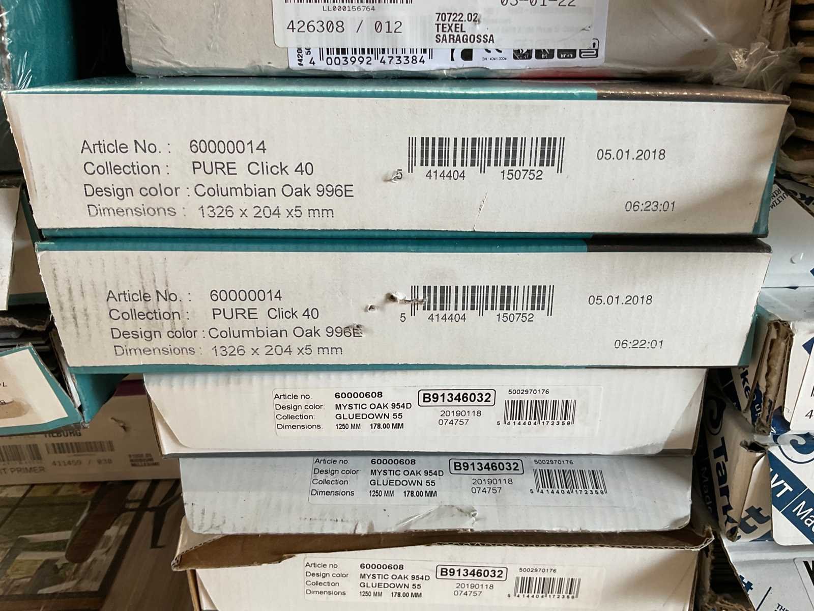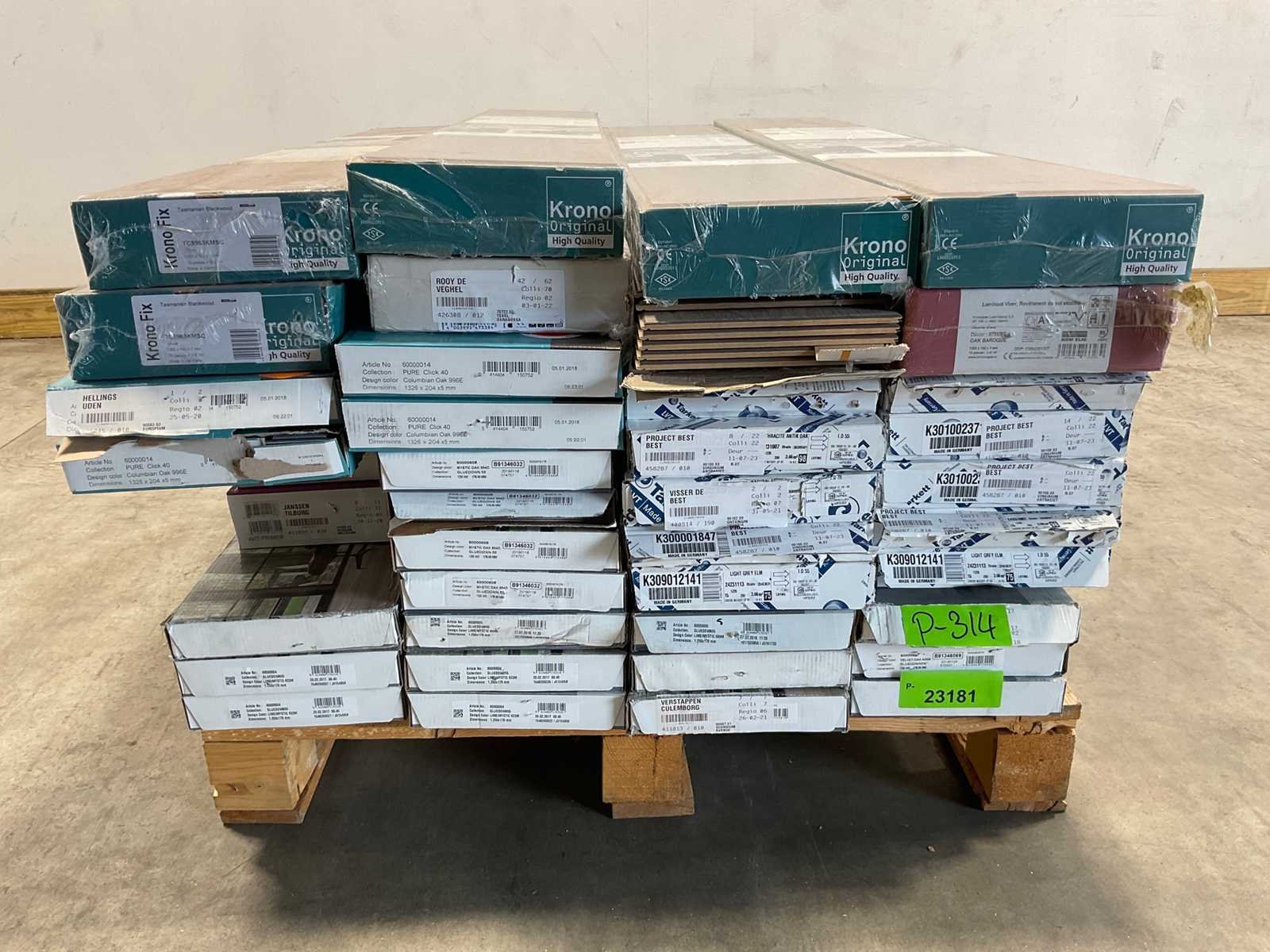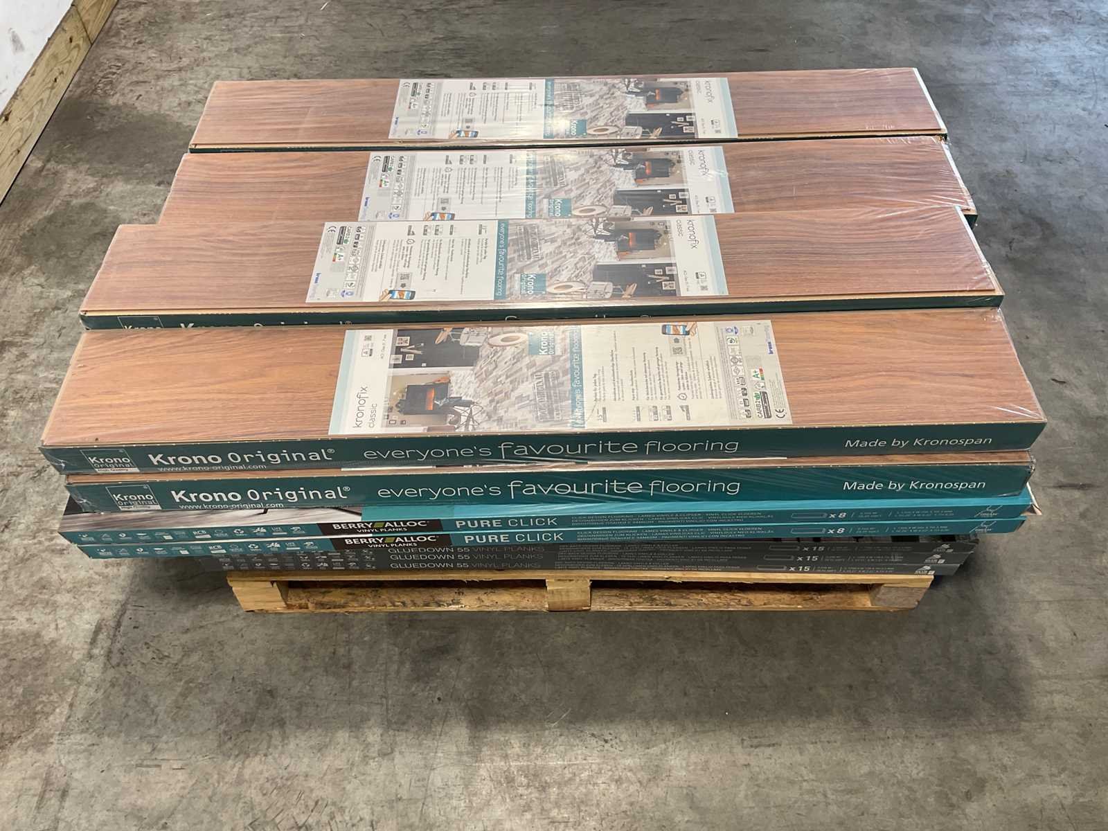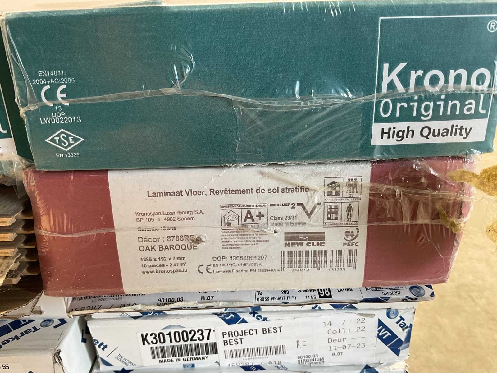 Mixpallet met diverse soorten laminaat – ongeveer 39 pakken, goed voor circa 85 m². Bekijk de foto’s voor specificaties en details.