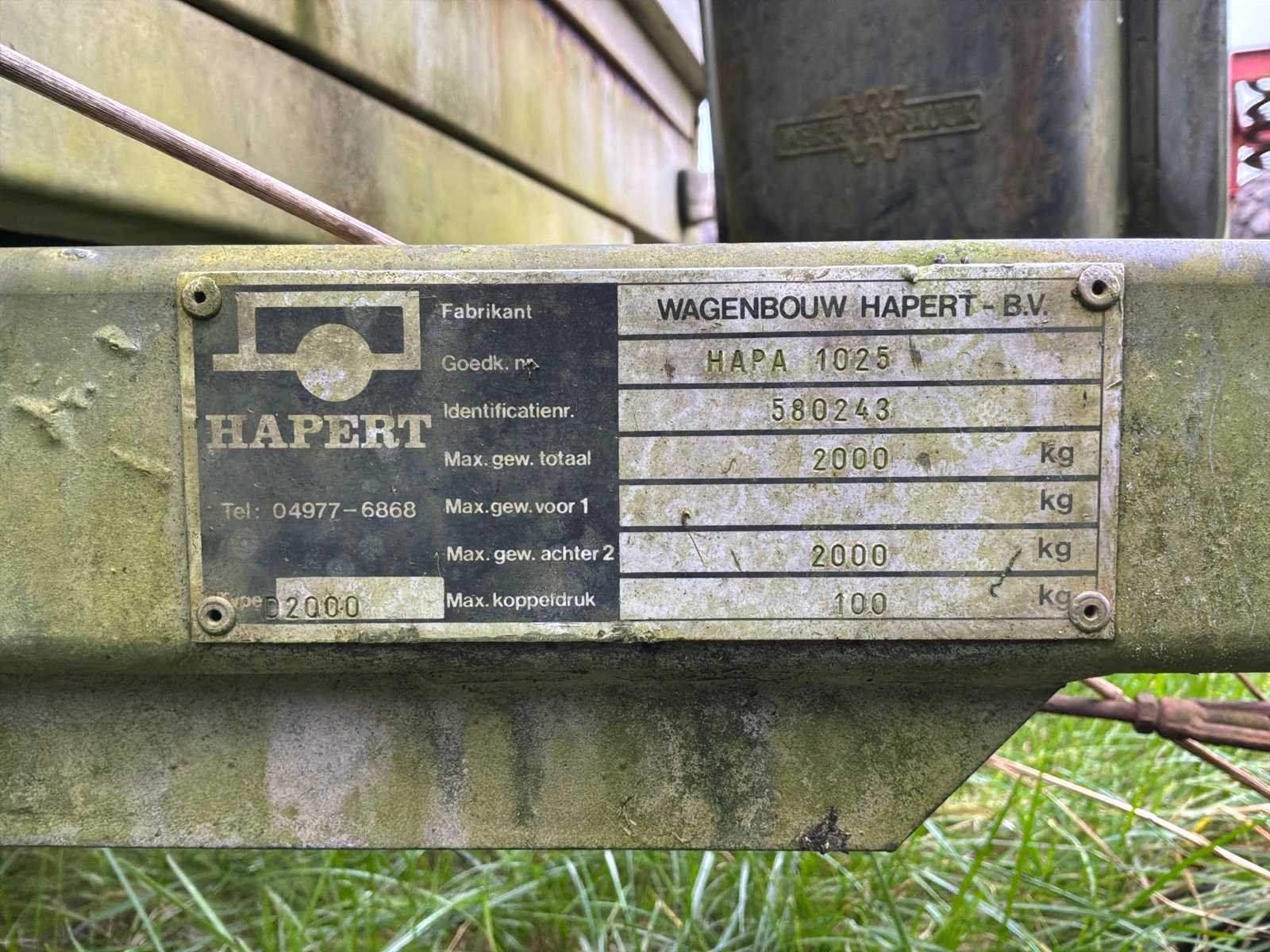 Let op achterklep ontbreekt! Bandenmaat 175/R13-8PR, 7-polige stekker Merk: Hapert Type: 2000 Model: Hapa 1025 Chassisnummer: 580243 Aantal assen: 2 Laadbak afmeting l: 225cm Laadbak afmeting b: 158cm Ledig gewicht: 556kg Laadvermogen: 1444kg Datum eerste toelating: 1987-07-09 Datum eerste toelating (NL): 1987-07-09 Kenteken: 06-WS-42 Hoogte: 165cm Lengte: 392cm Breedte: 163cm