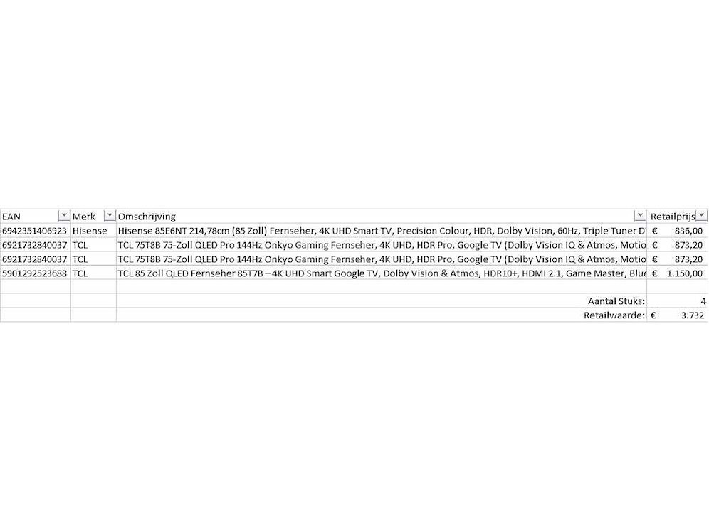 Dit betreft een partij televisies retourgoederen van een grote online retailer. De partij bestaat uit diverse diverse maten televisies. Aantal stuks: 4. Retailwaarde: €3732,- De televisies zijn niet werkend en zijn te gebruiken voor onderdelen. Kom op de kijkdag om te om zo een goed beeld te krijgen van de reden van retour. Zie foto's voor lijst met inhoud. Bezorgtermijn 14 dagen Merk: Pallet Retourgoederen - Televisies