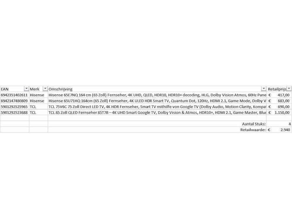 Dit betreft een partij televisies retourgoederen van een grote online retailer. De partij bestaat uit diverse diverse maten televisies. Aantal stuks: 4. Retailwaarde: €2940,- De televisies zijn niet werkend en zijn te gebruiken voor onderdelen. Kom op de kijkdag om te om zo een goed beeld te krijgen van de reden van retour. Zie foto's voor lijst met inhoud. Bezorgtermijn 14 dagen Merk: Pallet Retourgoederen - Televisies