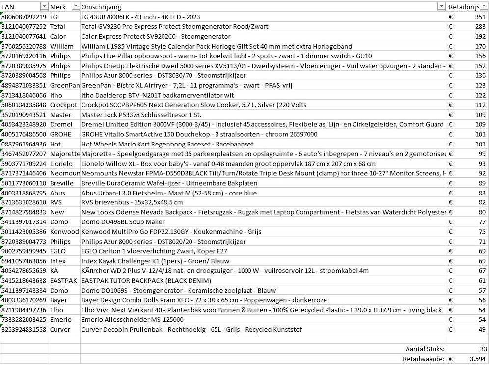 Dit betreft een partij A-merk retourgoederen van een grote online retailer. De partij bestaat uit diverse productcategorieën. Aantal stuks: 33. Retailwaarde: €3594,- Ongecontroleerd: werking onbekend (mix van werkend, incompleet, beschadigd, te gebruiken voor onderdelen). Kom op de kijkdag om te om zo een goed beeld te krijgen van de reden van retour. Zie foto's voor lijst met inhoud. Bezorgtermijn 14 dagen Merk: Pallet Retourgoederen