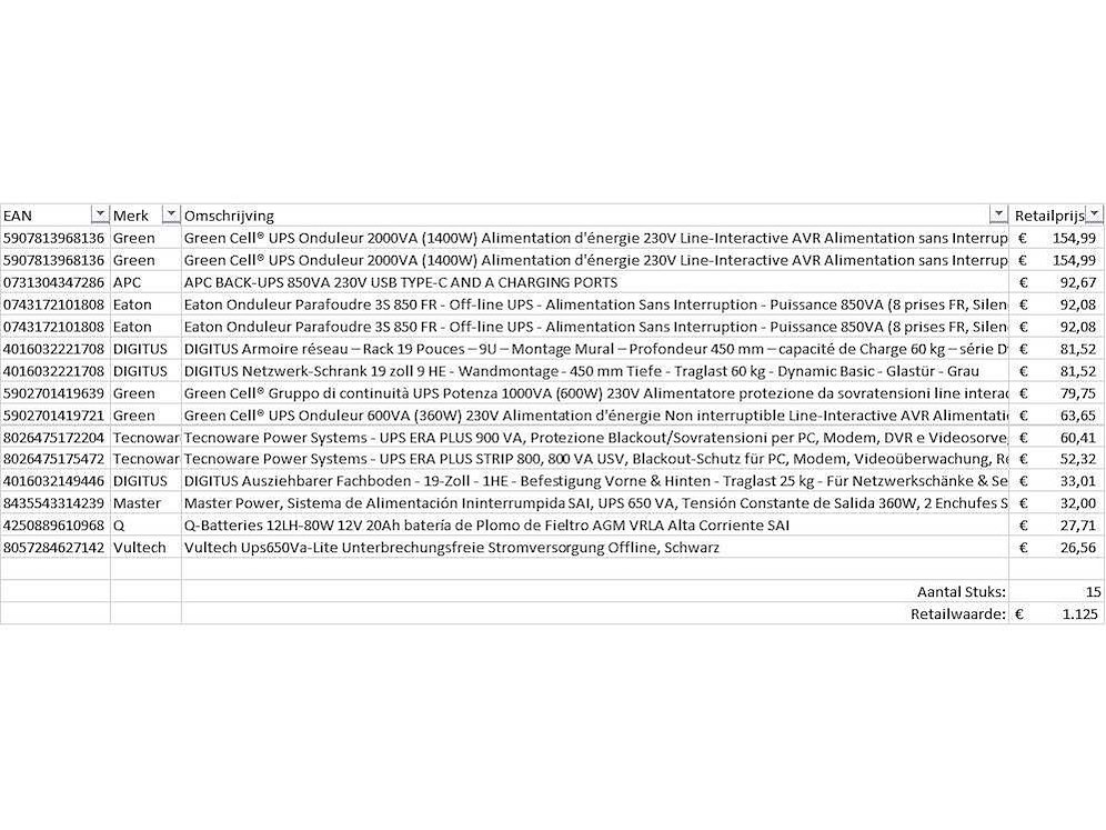 Dit betreft een partij noodstroomvoorzieningen van een grote online retailer. De partij bestaat uit diverse soorten noodstroom voorzieningen waaronder back ups, power stations etc. Aantal stuks: 15. Retailwaarde: €1125,- Ongecontroleerd: werking onbekend (mix van werkend, incompleet, beschadigd, te gebruiken voor onderdelen). Kom op de kijkdag om te om zo een goed beeld te krijgen van de reden van retour. Zie foto's voor lijst met inhoud. Bezorgtermijn 14 dagen Merk: Pallet Retourgoederen - Noodstroom voorzieningen