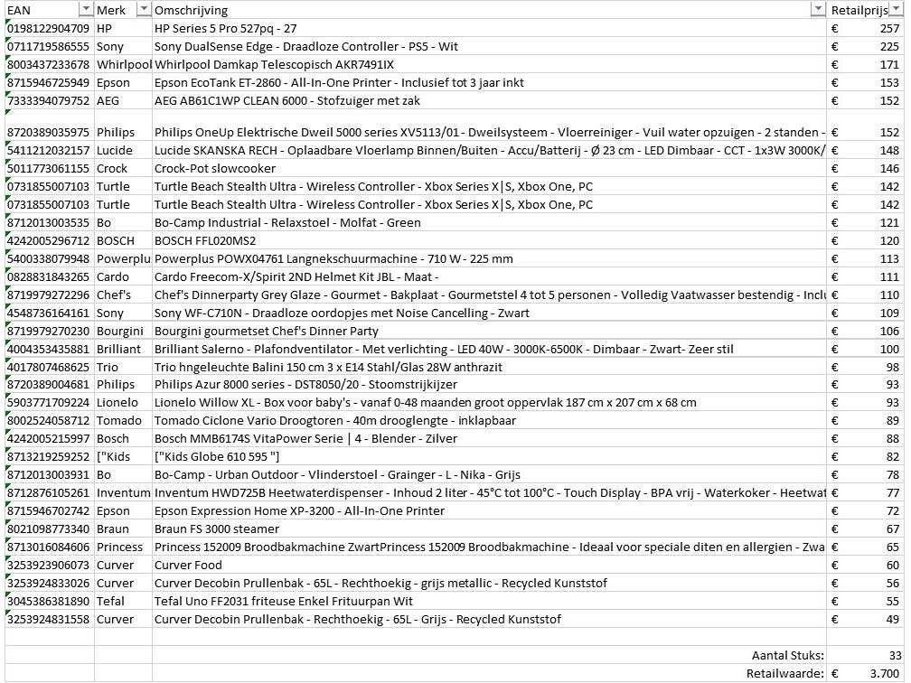 Dit betreft een partij A-merk retourgoederen van een grote online retailer. De partij bestaat uit diverse productcategorieën. Aantal stuks: 33. Retailwaarde: €3700,- Ongecontroleerd: werking onbekend (mix van werkend, incompleet, beschadigd, te gebruiken voor onderdelen). Kom op de kijkdag om te om zo een goed beeld te krijgen van de reden van retour. Zie foto's voor lijst met inhoud. Bezorgtermijn 14 dagen Merk: Pallet Retourgoederen