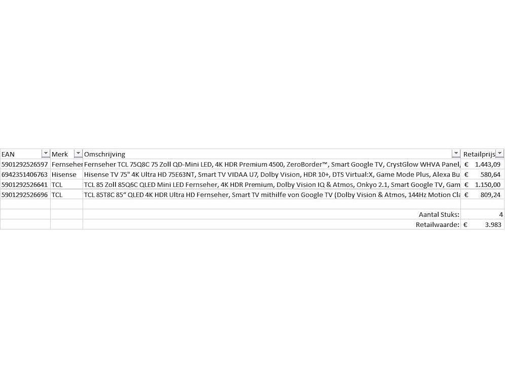 Dit betreft een partij televisies retourgoederen van een grote online retailer. De partij bestaat uit diverse diverse maten televisies. Aantal stuks: 4. Retailwaarde: €3983,- De televisies zijn niet werkend en zijn te gebruiken voor onderdelen. Kom op de kijkdag om te om zo een goed beeld te krijgen van de reden van retour. Zie foto's voor lijst met inhoud. Bezorgtermijn 14 dagen Merk: Pallet Retourgoederen - Televisies