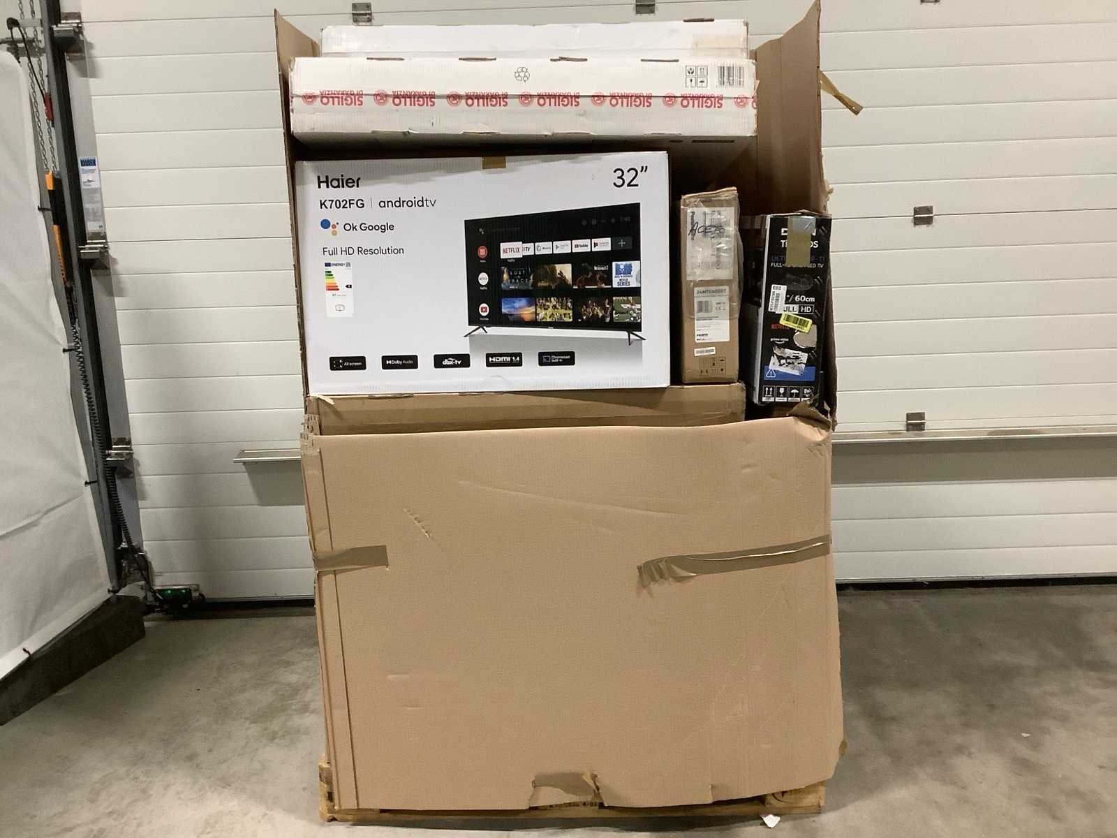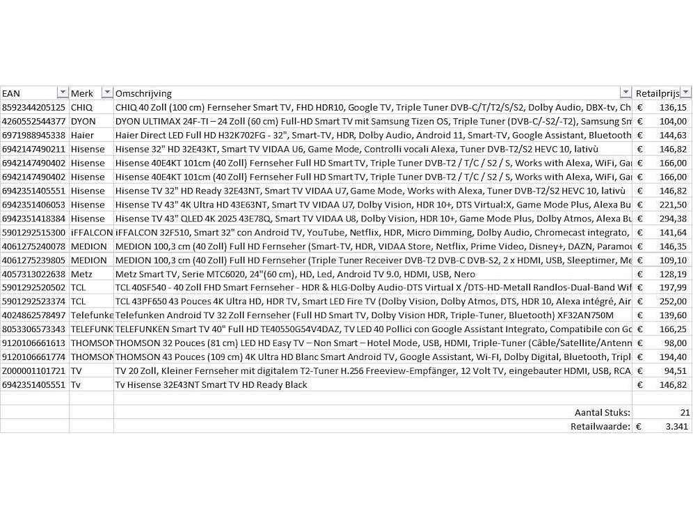 Dit betreft een partij televisies retourgoederen van een grote online retailer. De partij bestaat uit diverse diverse maten televisies. Aantal stuks: 21. Retailwaarde: €3341,- De televisies zijn niet werkend en zijn te gebruiken voor onderdelen. Kom op de kijkdag om te om zo een goed beeld te krijgen van de reden van retour. Zie foto's voor lijst met inhoud. Bezorgtermijn 14 dagen Merk: Pallet Retourgoederen - Televisies