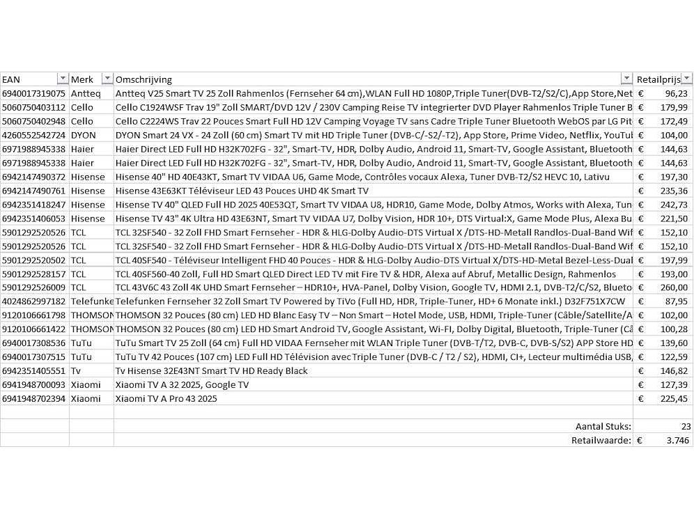 Dit betreft een partij televisies retourgoederen van een grote online retailer. De partij bestaat uit diverse diverse maten televisies. Aantal stuks: 23. Retailwaarde: €3746,- De televisies zijn niet werkend en zijn te gebruiken voor onderdelen. Kom op de kijkdag om te om zo een goed beeld te krijgen van de reden van retour. Zie foto's voor lijst met inhoud. Bezorgtermijn 14 dagen Merk: Pallet Retourgoederen - Televisies