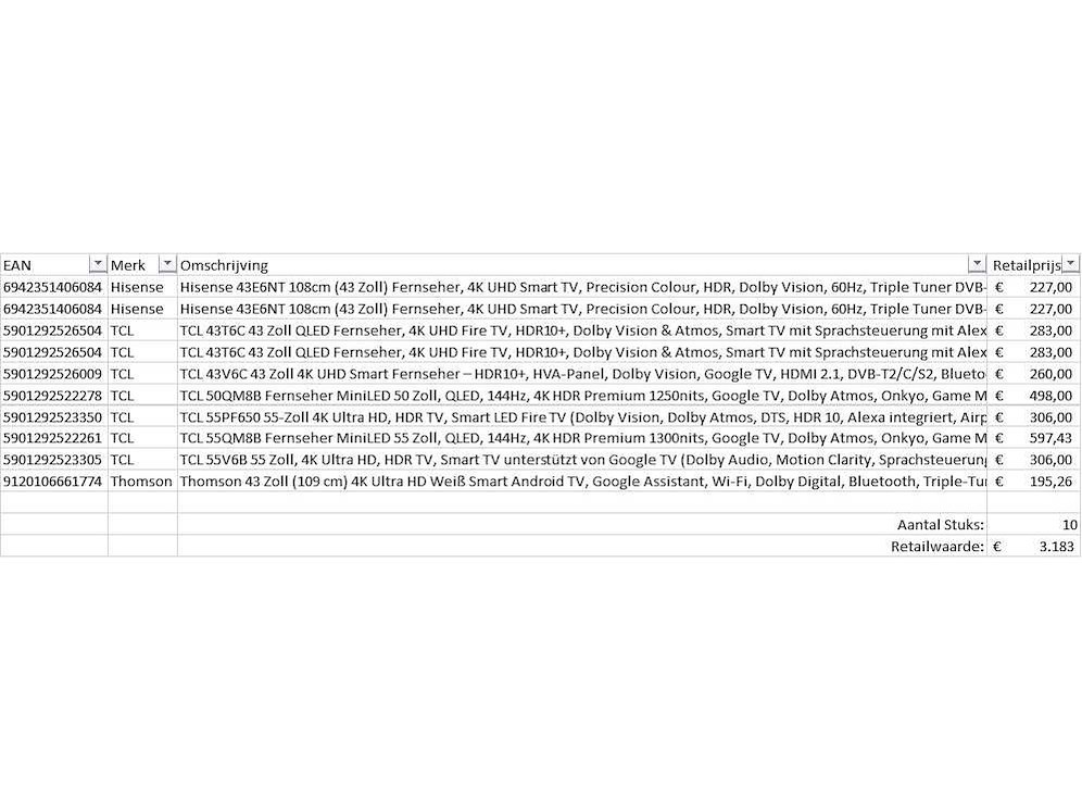 Dit betreft een partij televisies retourgoederen van een grote online retailer. De partij bestaat uit diverse diverse maten televisies. Aantal stuks: 10. Retailwaarde: €3183,- De televisies zijn niet werkend en zijn te gebruiken voor onderdelen. Kom op de kijkdag om te om zo een goed beeld te krijgen van de reden van retour. Zie foto's voor lijst met inhoud. Bezorgtermijn 14 dagen Merk: Pallet Retourgoederen - Televisies